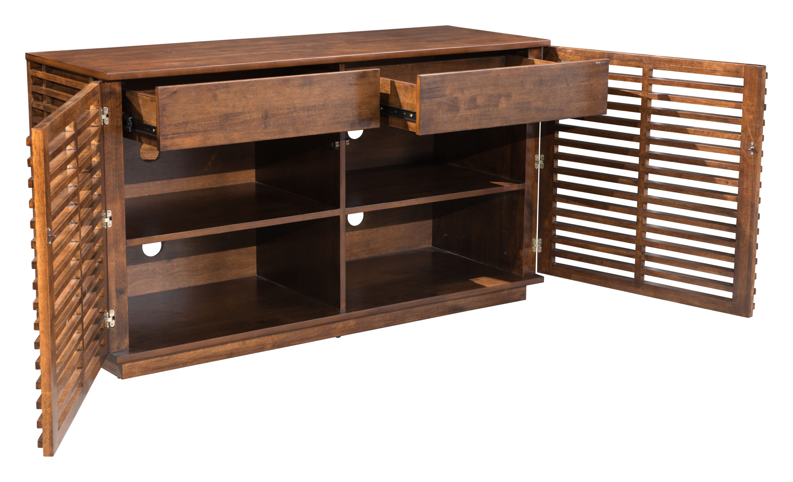 The Modern Walnut Credenza with Adjustable Shelves and Cable Management is a sleek and functional addition to any living space, perfect for organizing electronics or home essentials. With its Scandinavian-inspired design, this credenza is crafted from solid fir wood and finished in a rich walnut tone. Offering both style and practicality, it features two front-opening doors, two interior drawers, and four-tier adjustable shelves. The built-in cable management system ensures a clutter-free entertainment setup, making it ideal for media components.