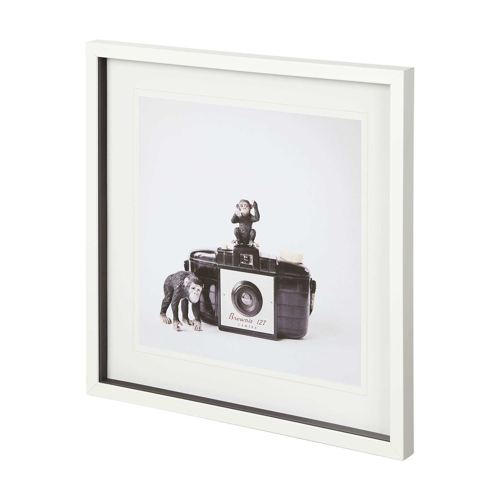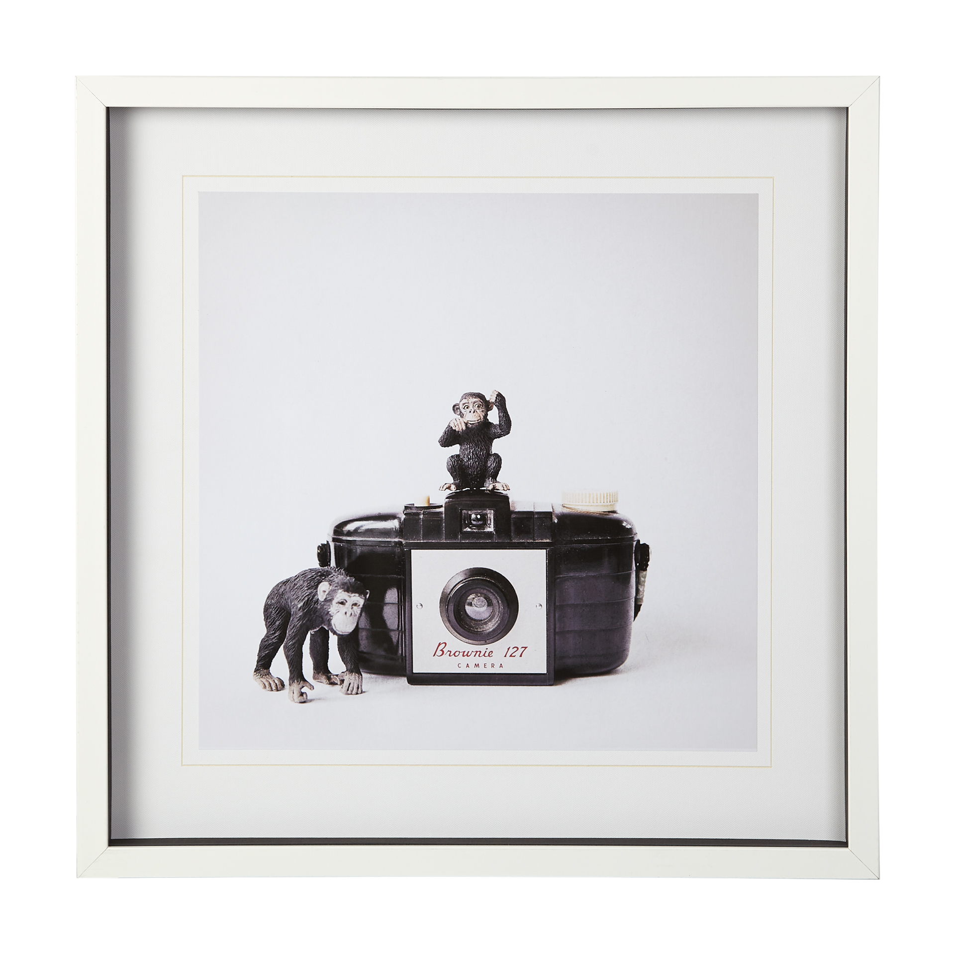 A captivating framed art print featuring Susannah Tucker’s photography, “Monkeys & Vintage Camera” adds a touch of whimsy to any space. This piece is matted under glass for a polished and protected finish.