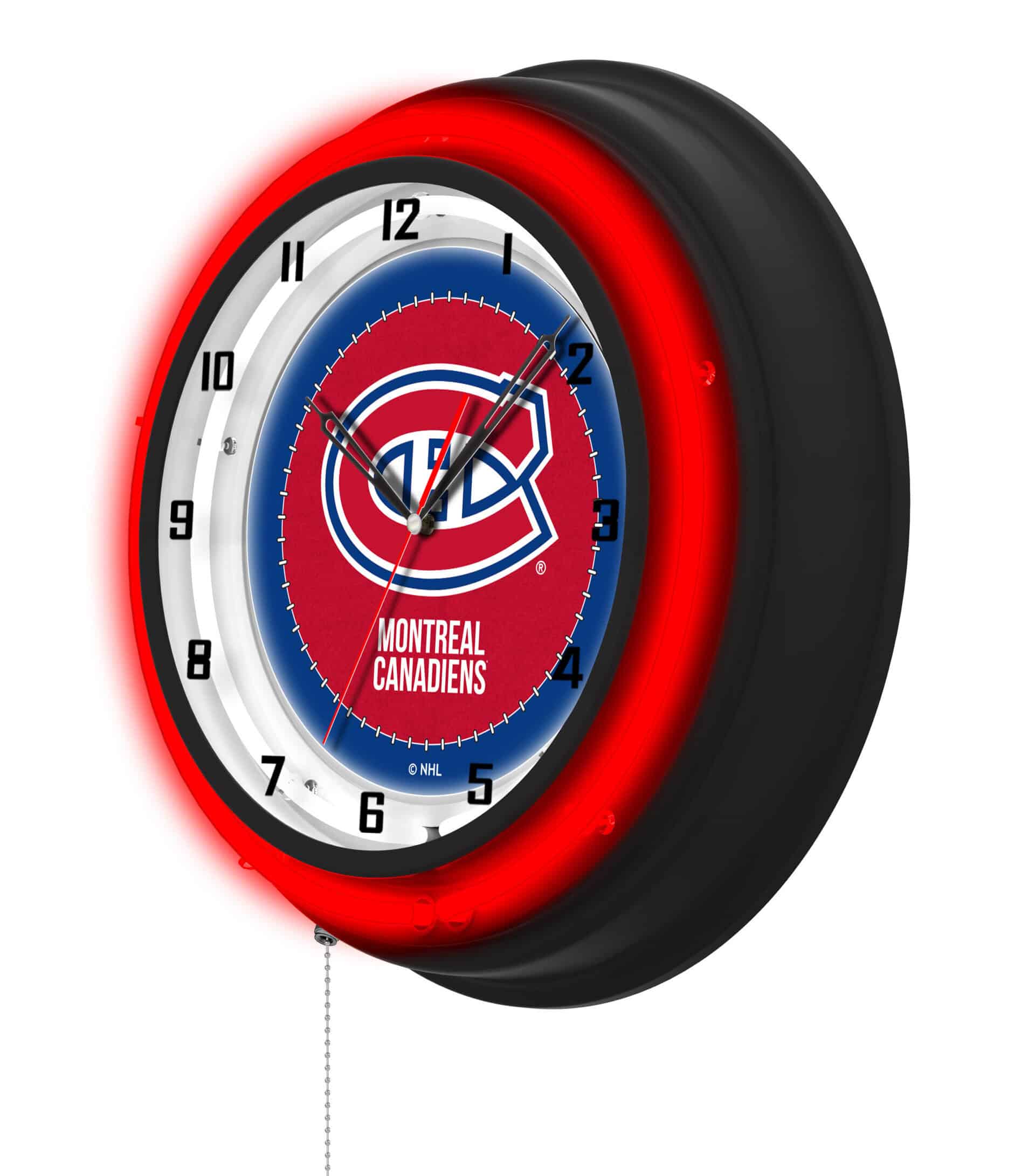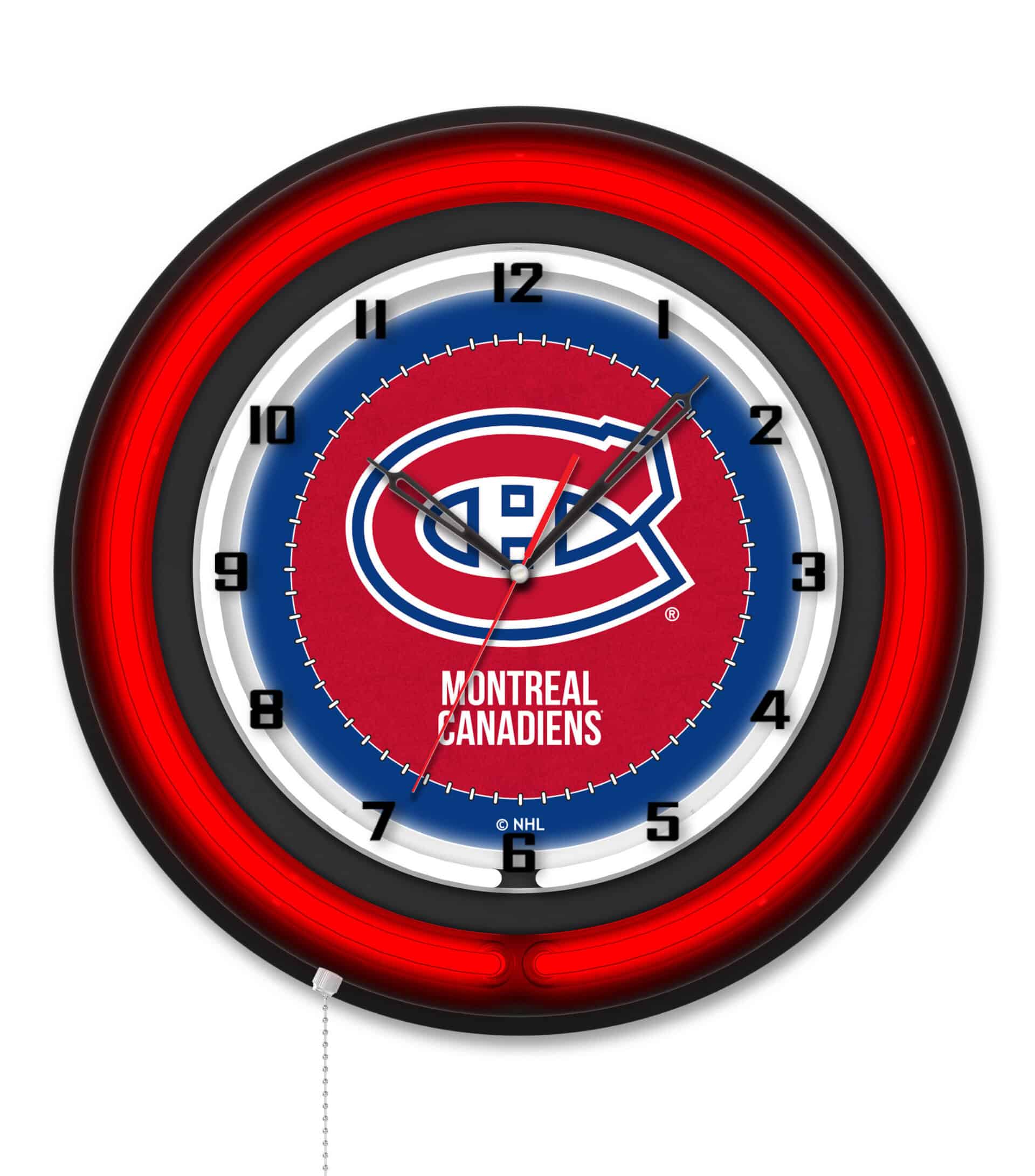 The Montreal Canadiens 19-Inch Double Neon Wall Clock in Black is the ultimate addition to any fan’s man cave. This stylish clock showcases your team pride with its vibrant, full-color artwork and striking neon accents. The clock features a durable black casing and a brilliant white inner neon ring that illuminates the custom printed clock face, ensuring it stands out in any setting. With easy operation via a pull chain, you can effortlessly turn the neon lights on and off. The accurate quartz movement provides reliable timekeeping, powered by a single AA battery (not included). This clock is perfect for gifting to sports super fans or adding a touch of team spirit to your own space.