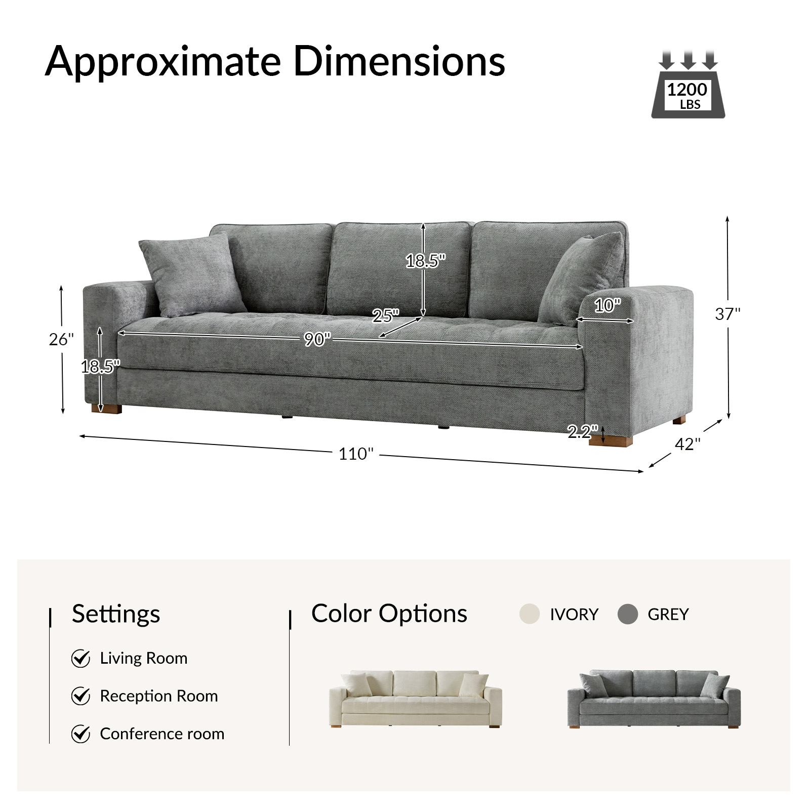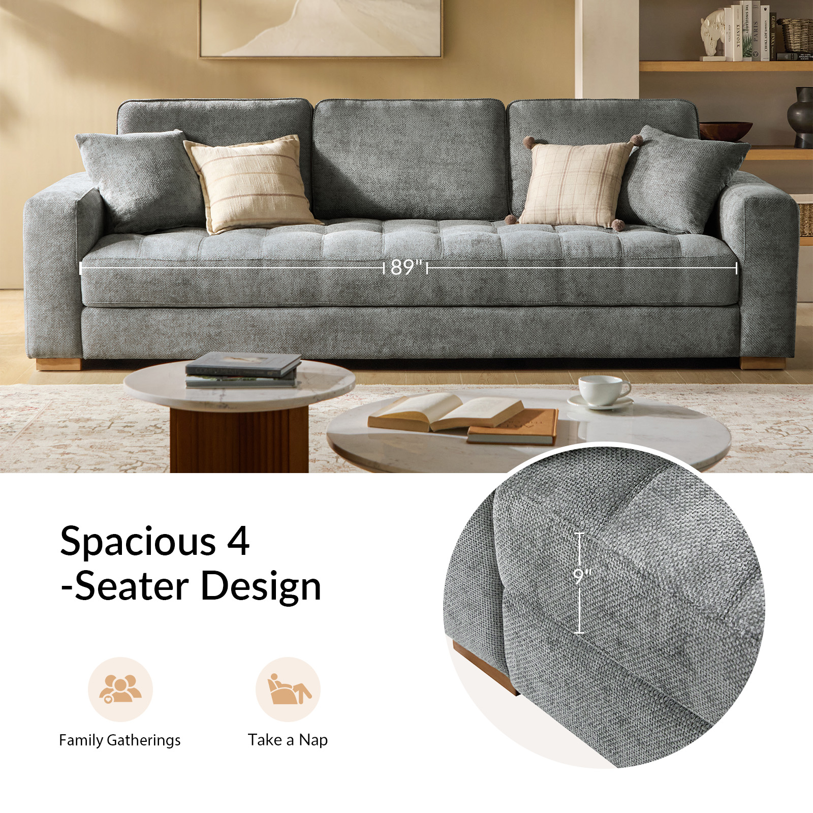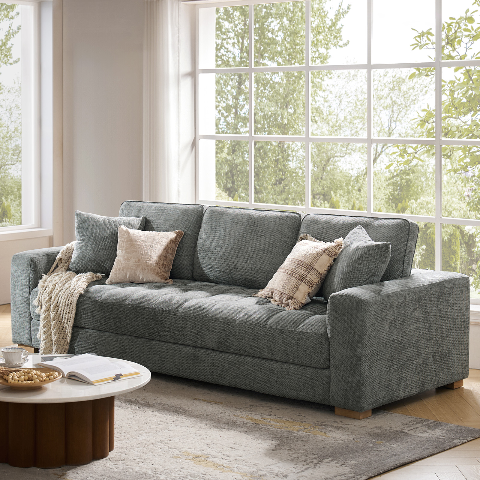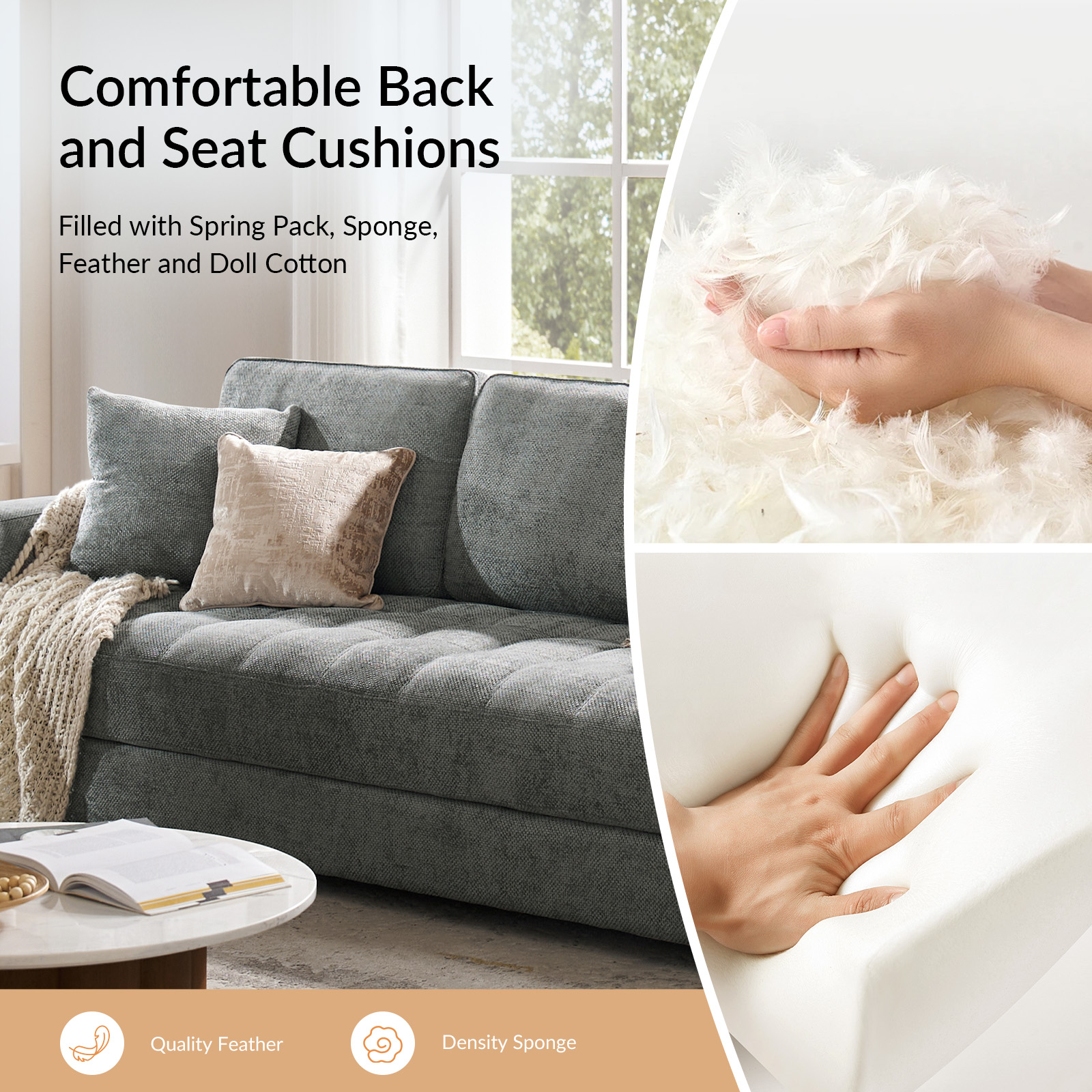 Experience the cozy and supportive feel of the comfortable back and seat cushions filled with spring pack, sponge, feather, and doll cotton. The chenille fabric upholstery offers a soft, inviting texture, while the tufted seat cushion design adds aesthetic appeal and enhanced comfort. Removable throw pillows complete the look, creating a cozy and adaptable atmosphere. This sofa seamlessly blends style and functionality, making it a refined yet inviting addition to your home.