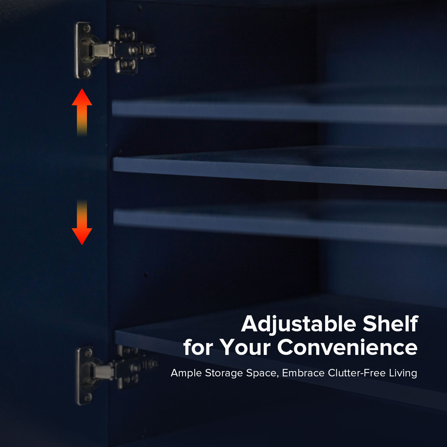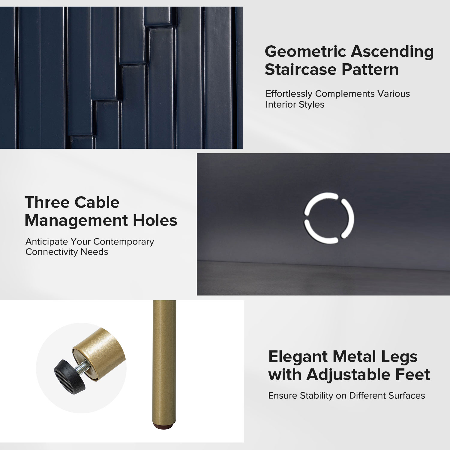 This modern storage sideboard seamlessly blends style and functionality, adding a touch of boho chic to your living space. The Nadia Navy Boho Geometric Door Modern Storage Sideboard features intricate three-dimensional door panels with a captivating geometric pattern, offering ample storage space while enhancing your décor. With its elegant metal legs, adjustable feet, and cable management, it’s the perfect addition to any living room, dining room, or hallway.