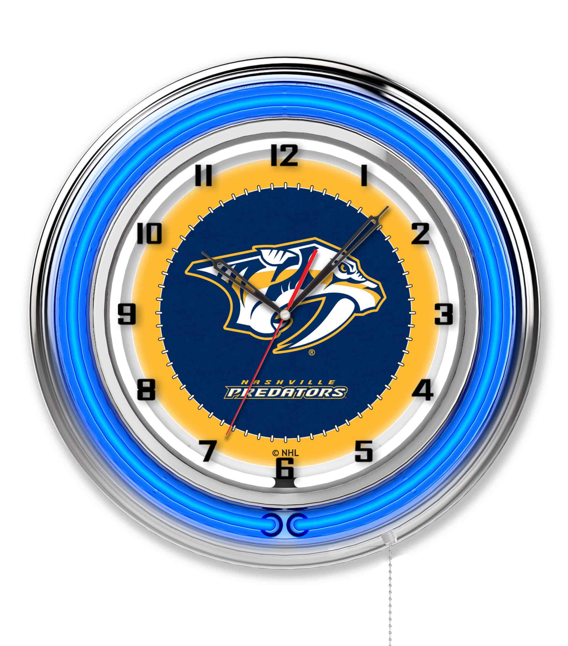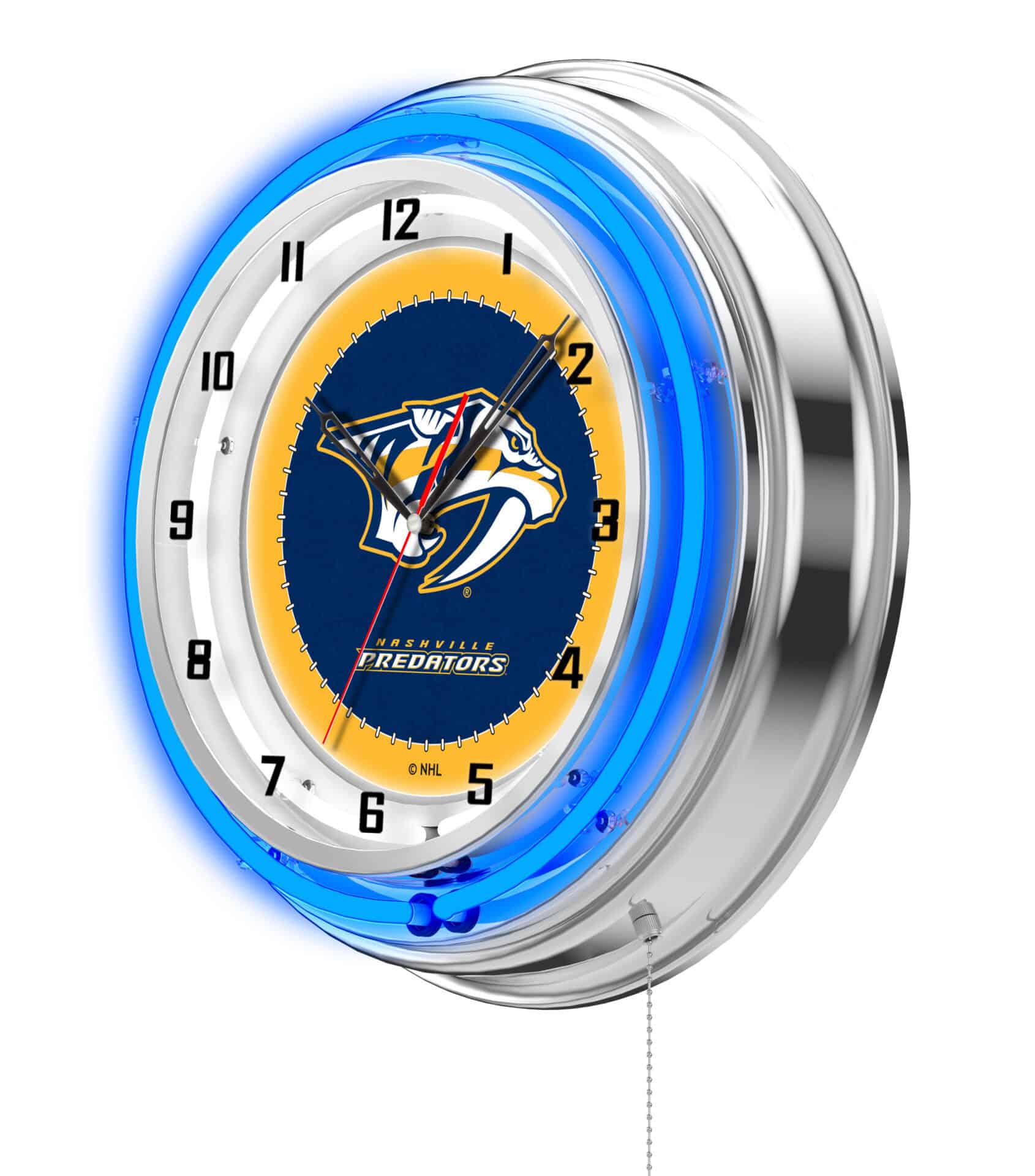 The Nashville Predators 19-Inch Neon Logo Clock in Chrome is the perfect addition to any man cave, showcasing your team pride with vibrant colors and a stylish design. This clock features a durable chrome casing and is illuminated by two neon rings—one in the team’s color and a brilliant white inner ring that lights up the clock face. The easy-to-use pull chain allows you to turn the neon lights on and off effortlessly, while the accurate quartz movement ensures you always stay on time. This clock is not only a functional timepiece but also a striking piece of decor, making it an ideal gift for sports fans or a fantastic treat for yourself.