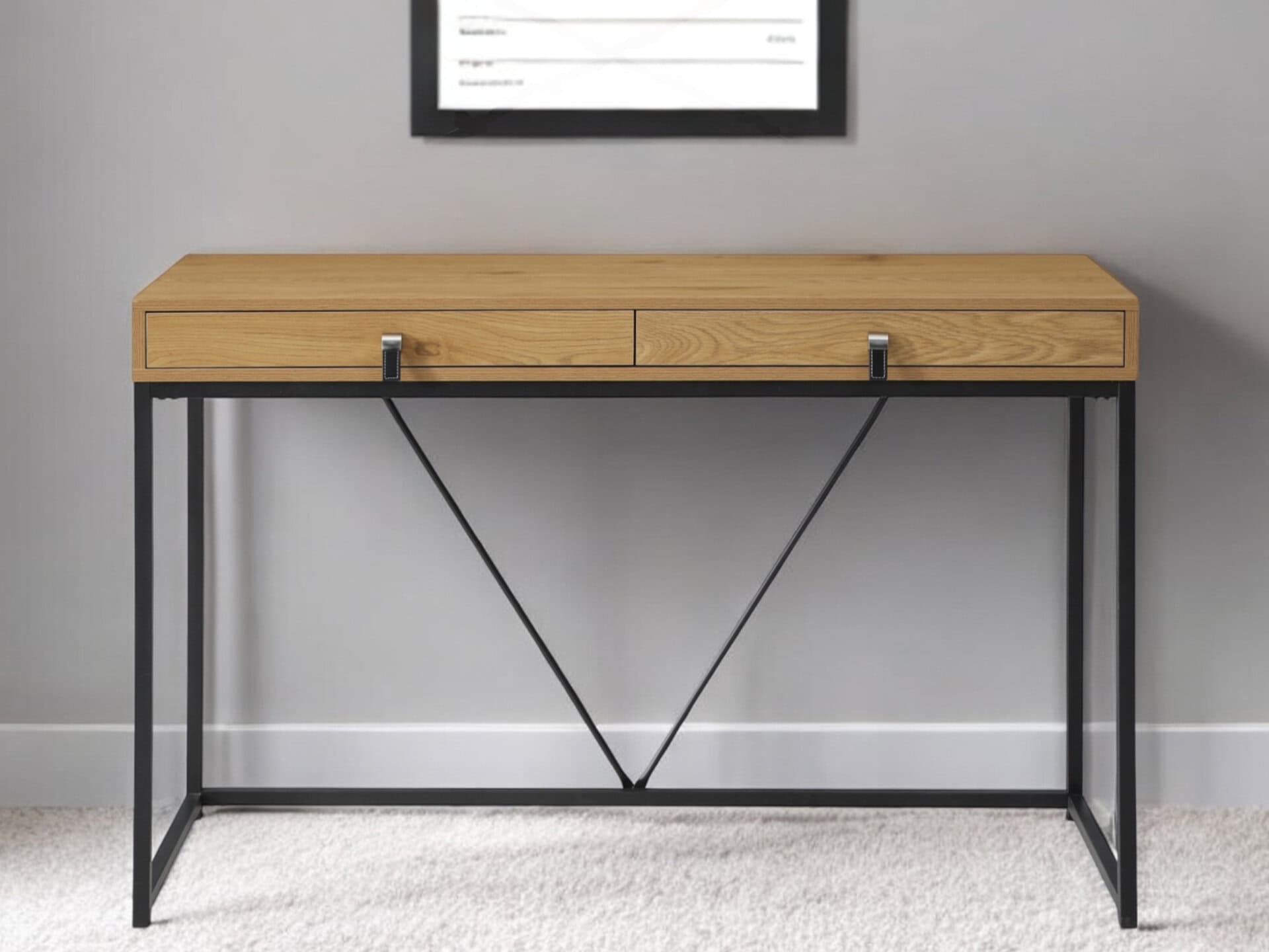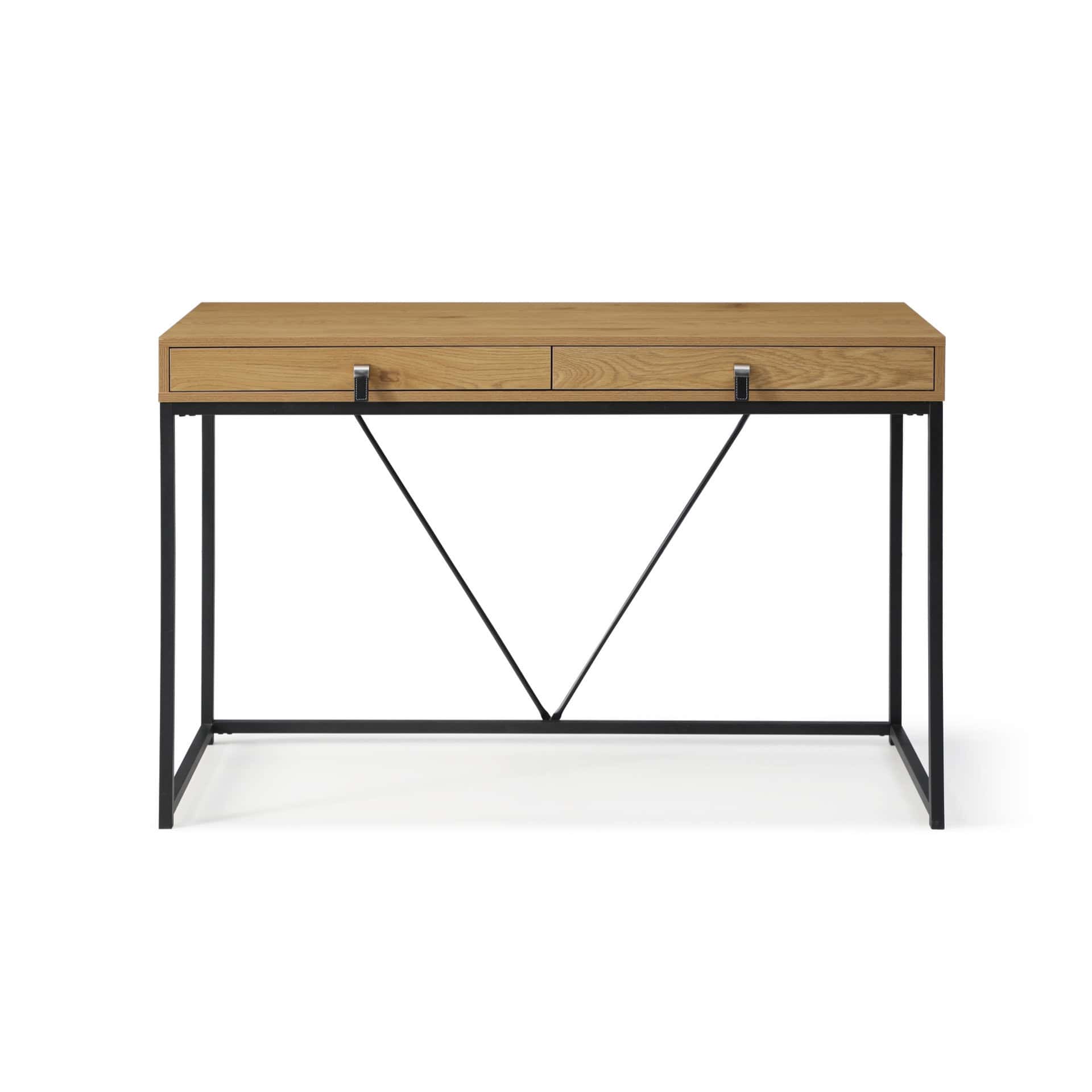 Bring a touch of classic style to your space with the Natural and Black 47-Inch Writing Desk With Two Drawers. This versatile desk is perfect for your living room, home office, or bedroom, offering a practical and stylish solution for your workspace needs. Its classically shaped rectangular design ensures it fits seamlessly into most interiors. Featuring two spacious drawers, this desk provides hidden storage for your office essentials, helping you maintain a clean and organized environment. Crafted with premium materials and a sturdy metal base, this desk is built to last, blending functionality with durability.