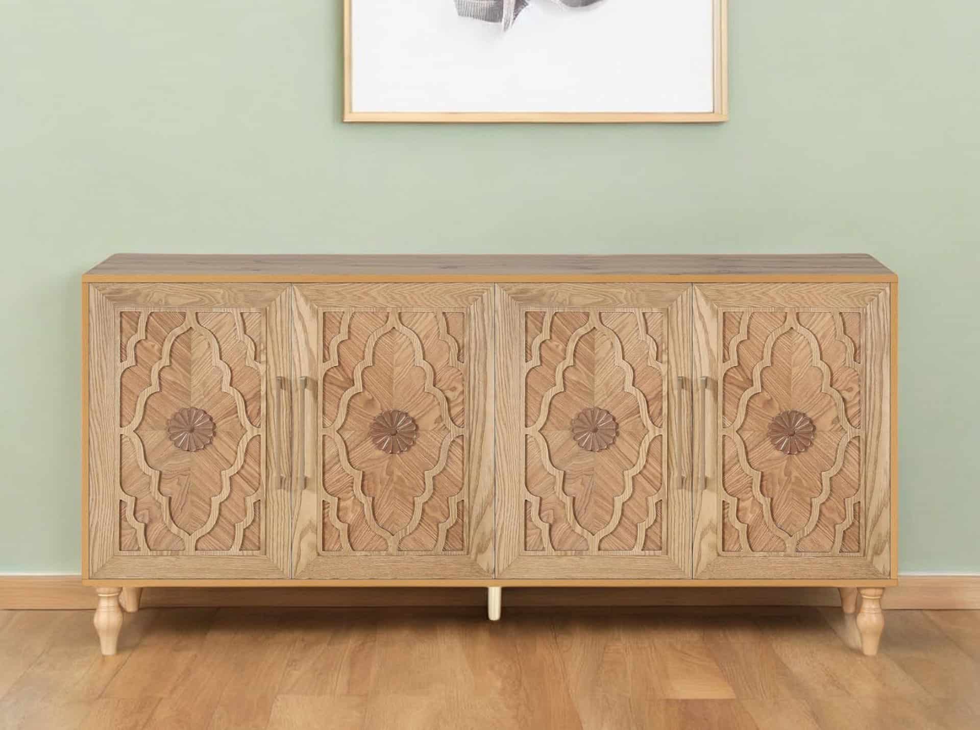 Transform your living space with the stunning and functional “Natural Distressed Geometric Carved Sideboard with Four Doors.” Designed for both style and practicality, this sideboard features a natural finish with distressed detailing for a rustic, hand-crafted appeal. The carved geometric patterns on the doors add texture and character, while the wood scrollwork design brings a touch of elegance. Offering ample storage with shelves and concealed compartments, this sideboard is perfect for organizing your space while enhancing your decor. Ideal for use in various rooms, it seamlessly combines form and function to elevate your home’s style.