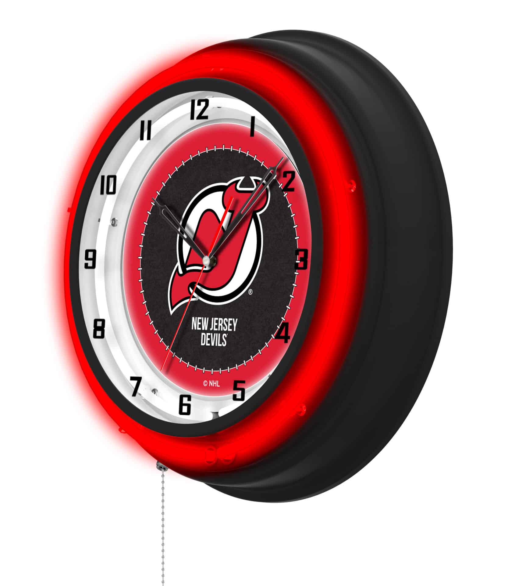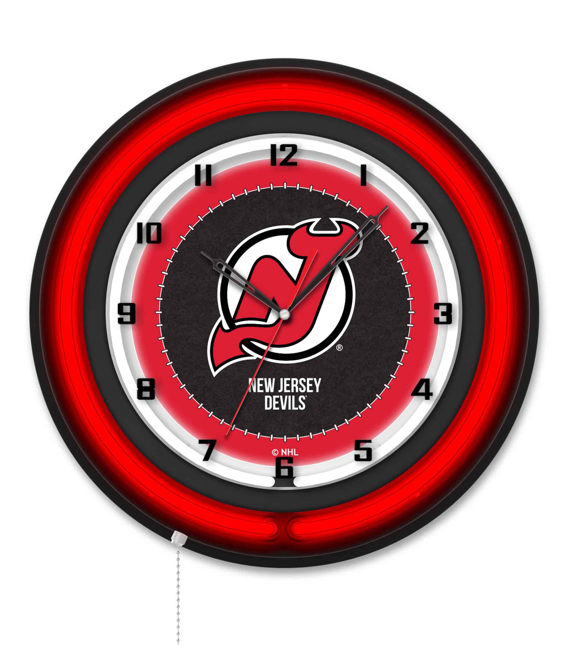 Enhance your man cave with the New Jersey Devils 19-Inch Double Neon Wall Clock in Black. This striking clock features a black casing and an eye-catching neon outer ring in team colors, complemented by a brilliant white inner neon ring that illuminates the custom printed clock face. Designed for easy use, the neon lights can be activated or deactivated effortlessly with a pull chain. Powered by a standard 120V outlet, this clock combines style and function with its accurate quartz movement. Ideal as a gift for sports enthusiasts or for personal enjoyment, this clock showcases your team pride in a vibrant and stylish way.