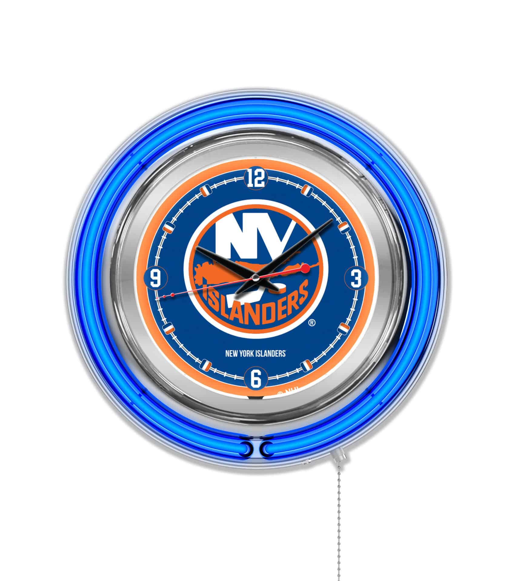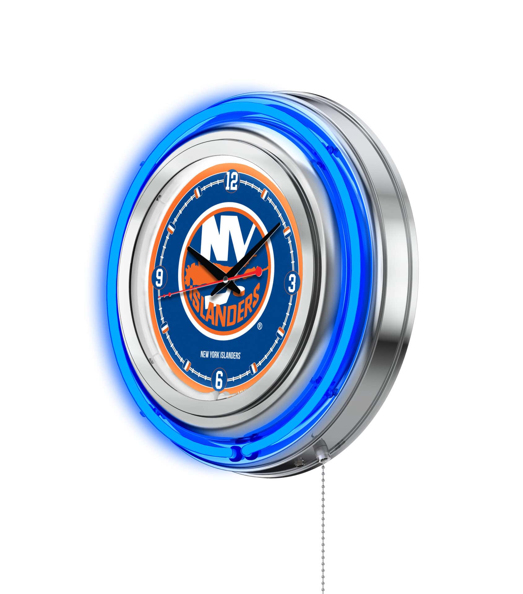 The New York Islanders 15-Inch Neon Logo Clock in Chrome is an eye-catching addition to any fan’s collection. This stunning clock features a chrome casing and vibrant neon rings that beautifully illuminate the clock face, showcasing your team pride. With its easy-to-use pull chain for on/off operation and accurate quartz movement, this clock is not only a stylish decor piece but also a functional timepiece. Perfect for a man cave, game room, or as a gift for a sports enthusiast.