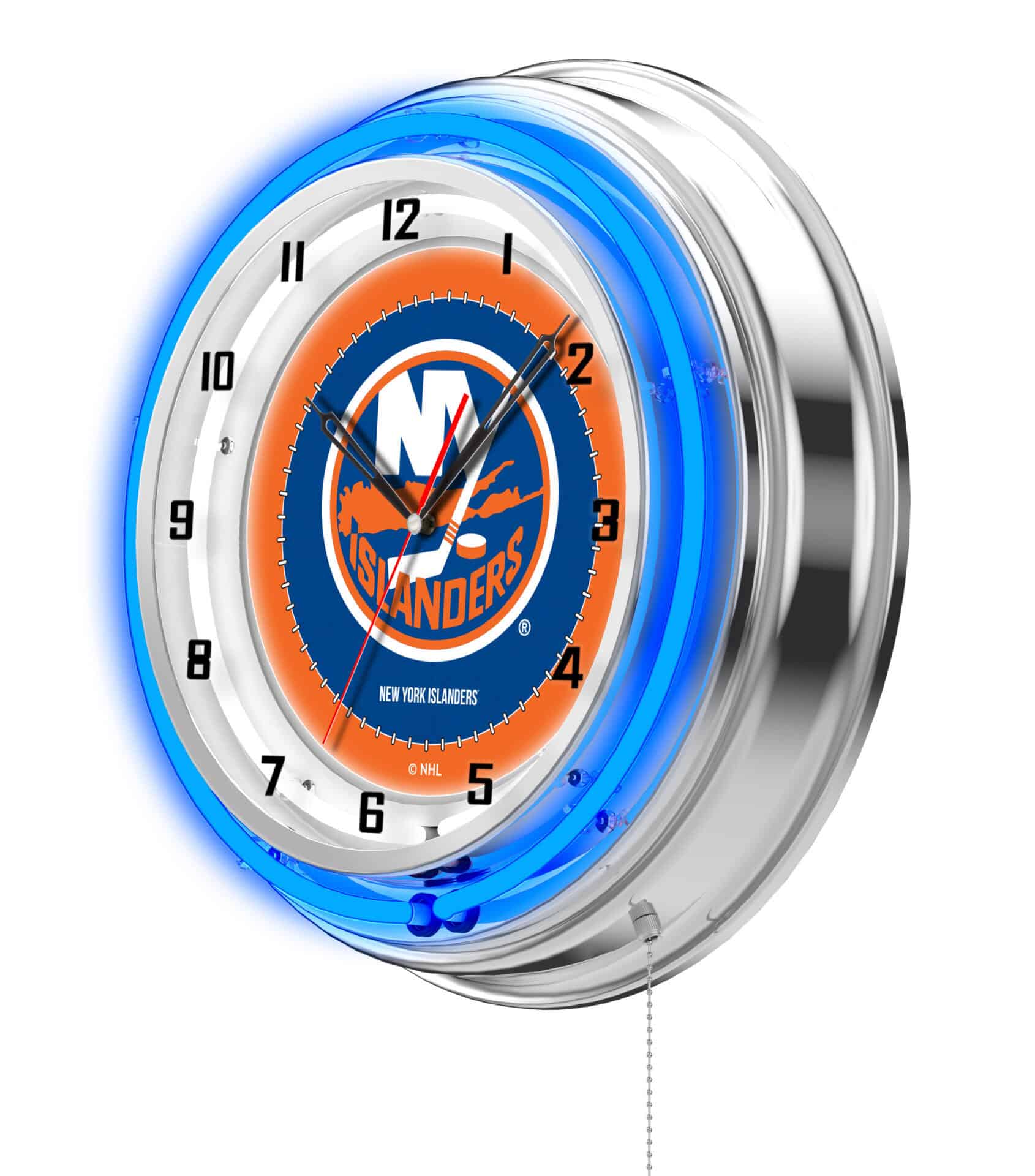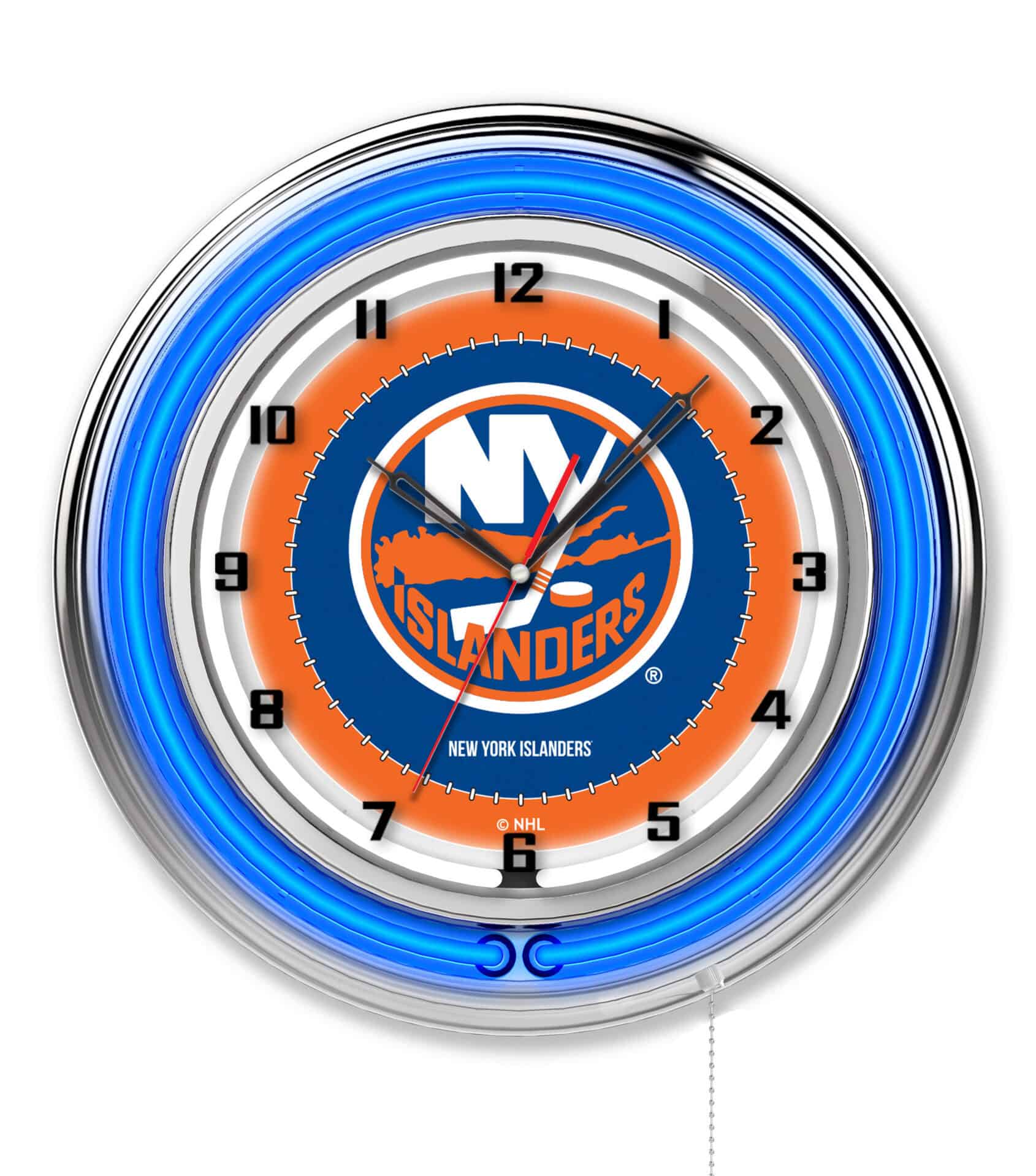 The New York Islanders 19-Inch Neon Logo Clock in Chrome is a striking addition to any sports fan’s man cave. Featuring a sleek chrome casing and vibrant team colors, this clock not only keeps time but also showcases your team pride. The dual neon rings – a colored outer ring and a brilliant white inner ring – illuminate the custom printed clock face, making it a standout piece. The convenient pull chain allows for easy on/off operation, while accurate quartz movement ensures precision timekeeping. Perfect as a gift or for personal use, this clock is a must-have for any sports enthusiast.