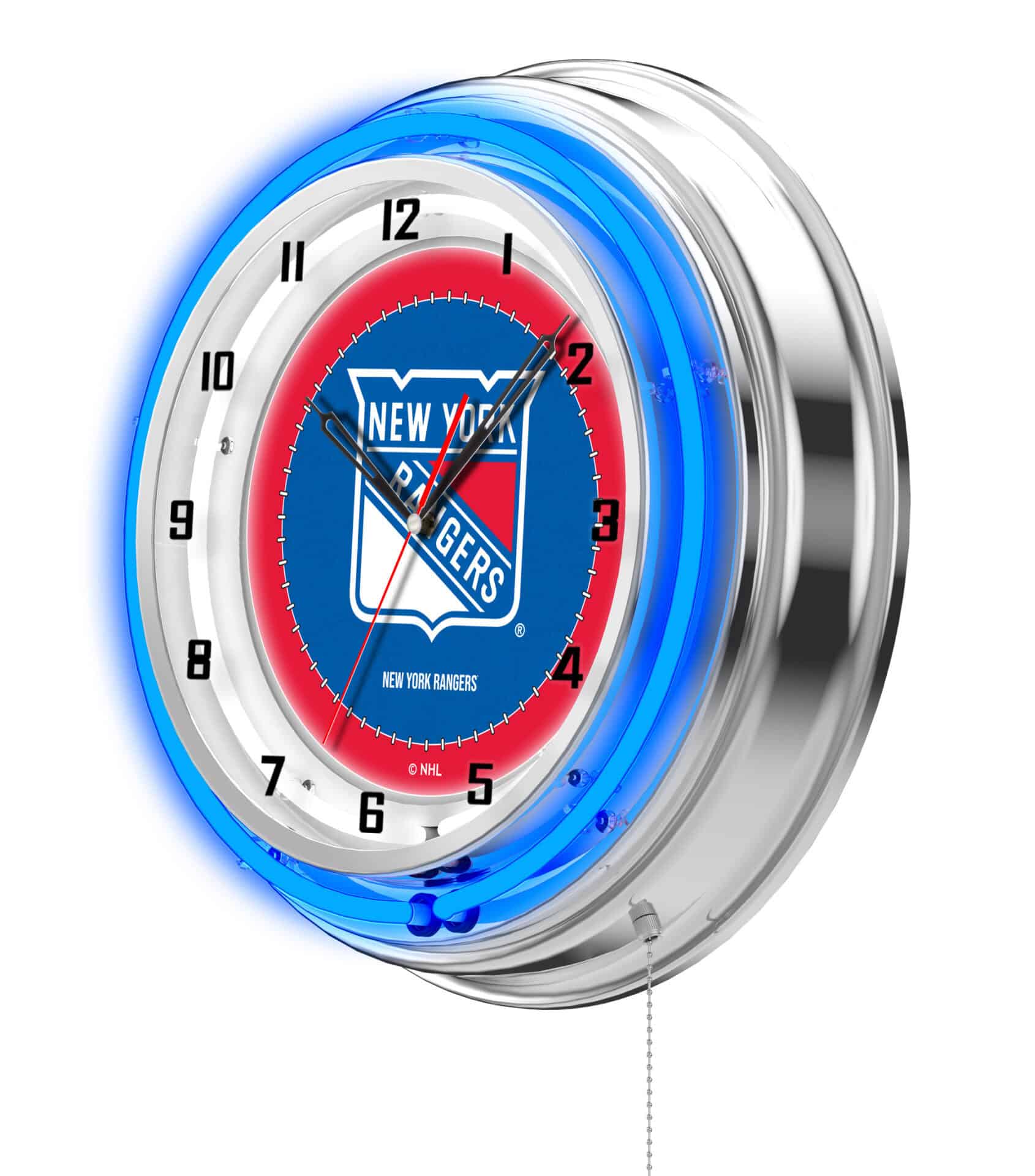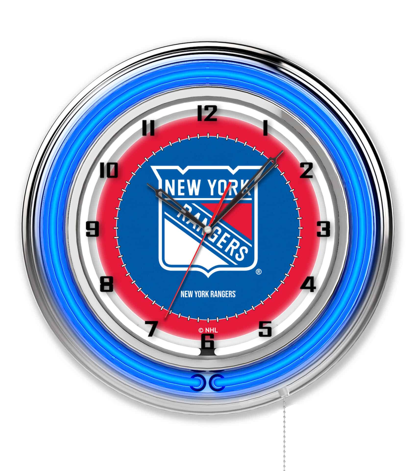 The New York Rangers 19-Inch Neon Logo Clock in Chrome is the ultimate addition to your man cave, displaying your team pride in a vibrant and stylish way. This clock features a stunning chrome casing and a neon outer ring in team colors that beautifully highlights the custom printed clock face. The brilliant white inner neon ring ensures that the clock face is always illuminated, making it a striking focal point in any room.