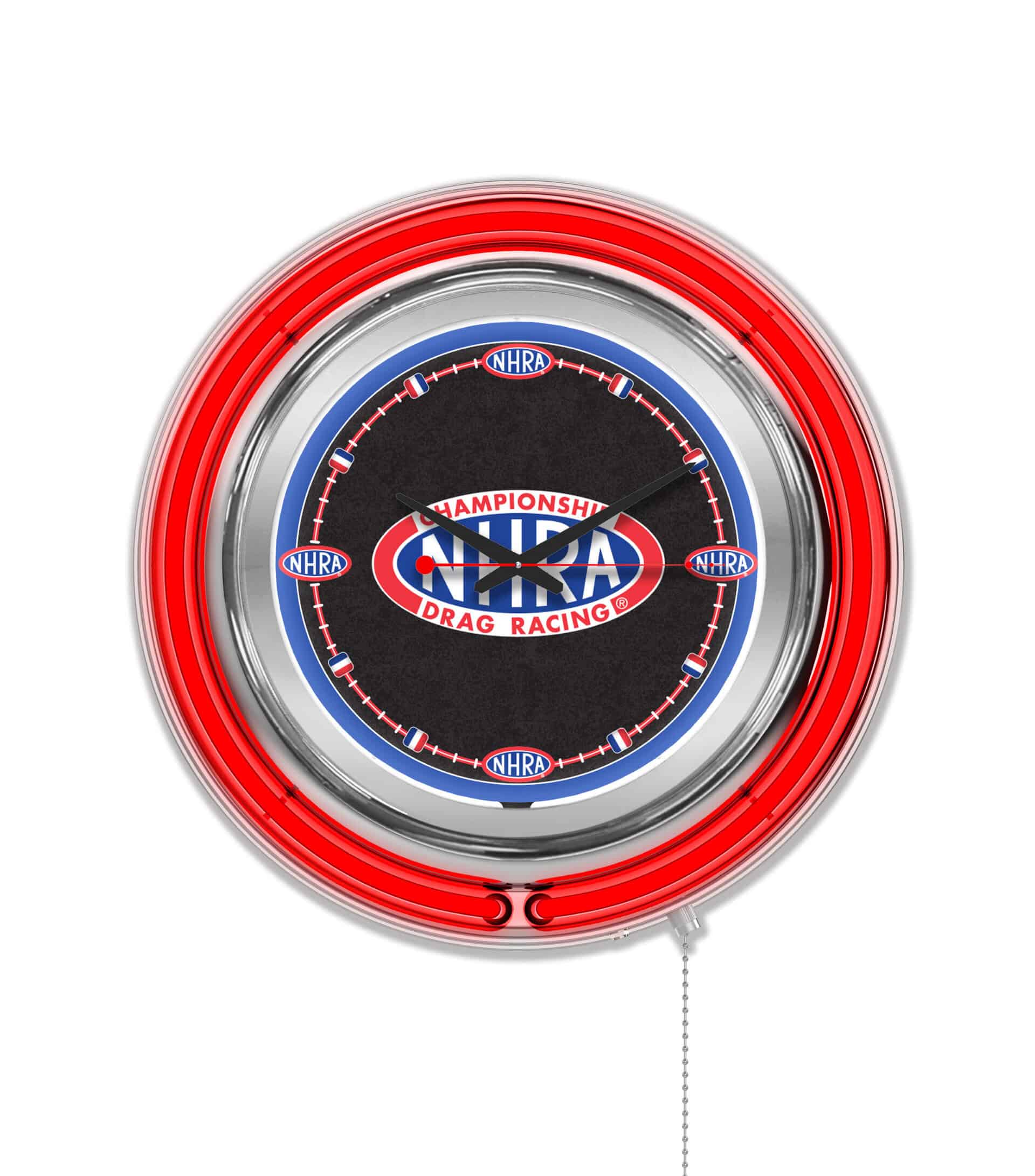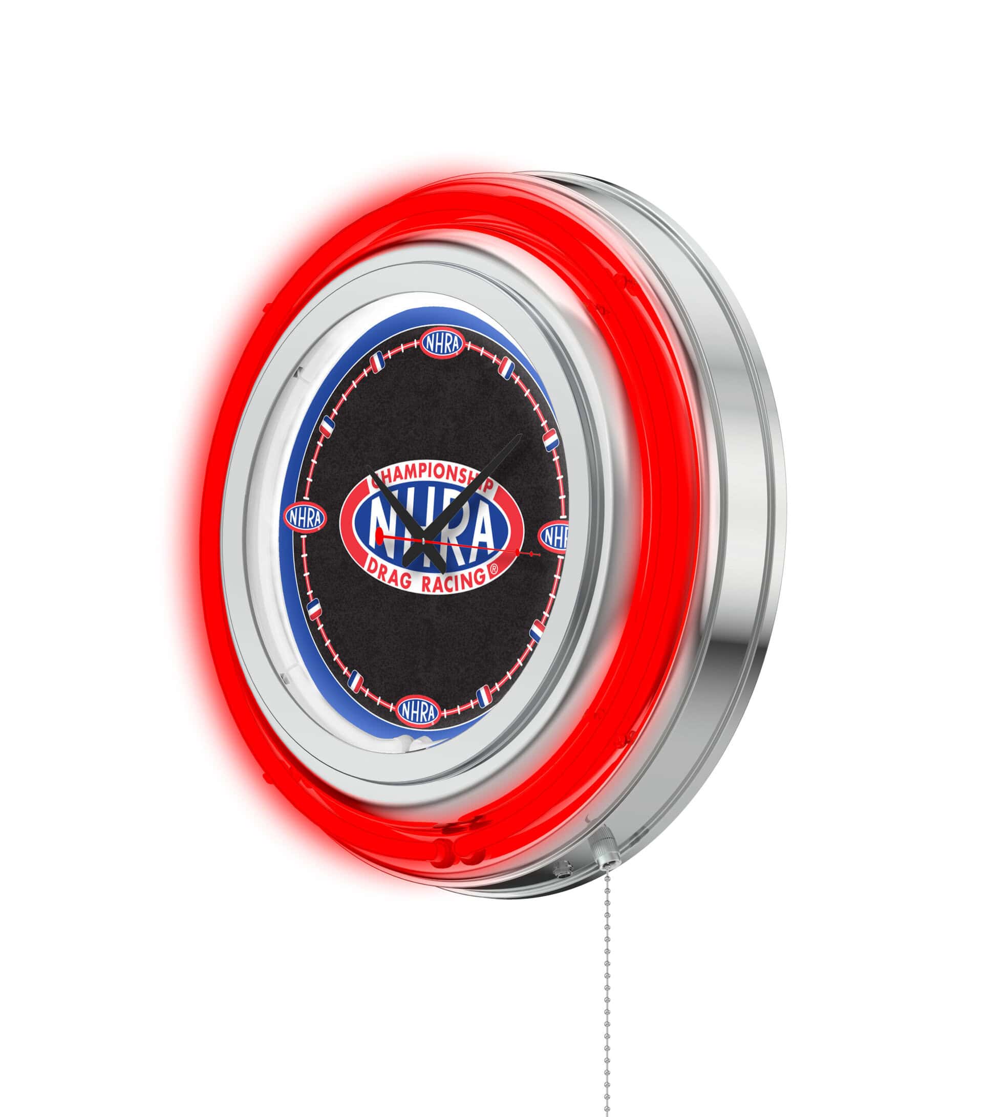 The NHRA Championship Drag Racing (Red Neon) 15-Inch Neon Logo Clock in Chrome is an eye-catching addition to any Man Cave or garage. Featuring a striking chrome casing with vibrant neon accents, this clock not only keeps time but also showcases your passion for the thrilling world of drag racing. The bold custom graphics on the clock face illuminate beautifully with the inner white neon ring, creating a stunning visual effect. Its easy pull chain operation allows you to turn the neon lights on and off with ease, while the accurate quartz movement ensures you’ll always know the time.