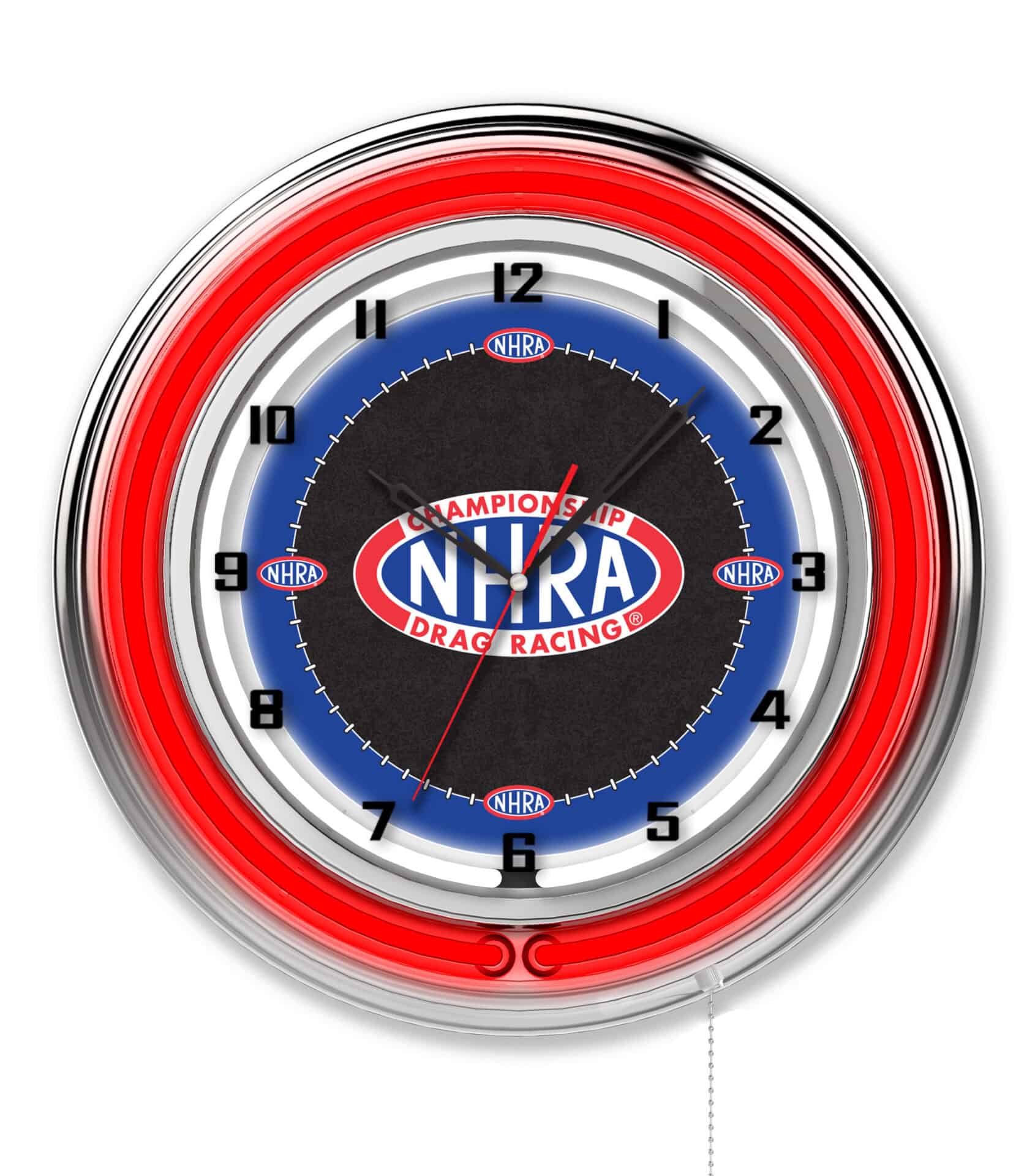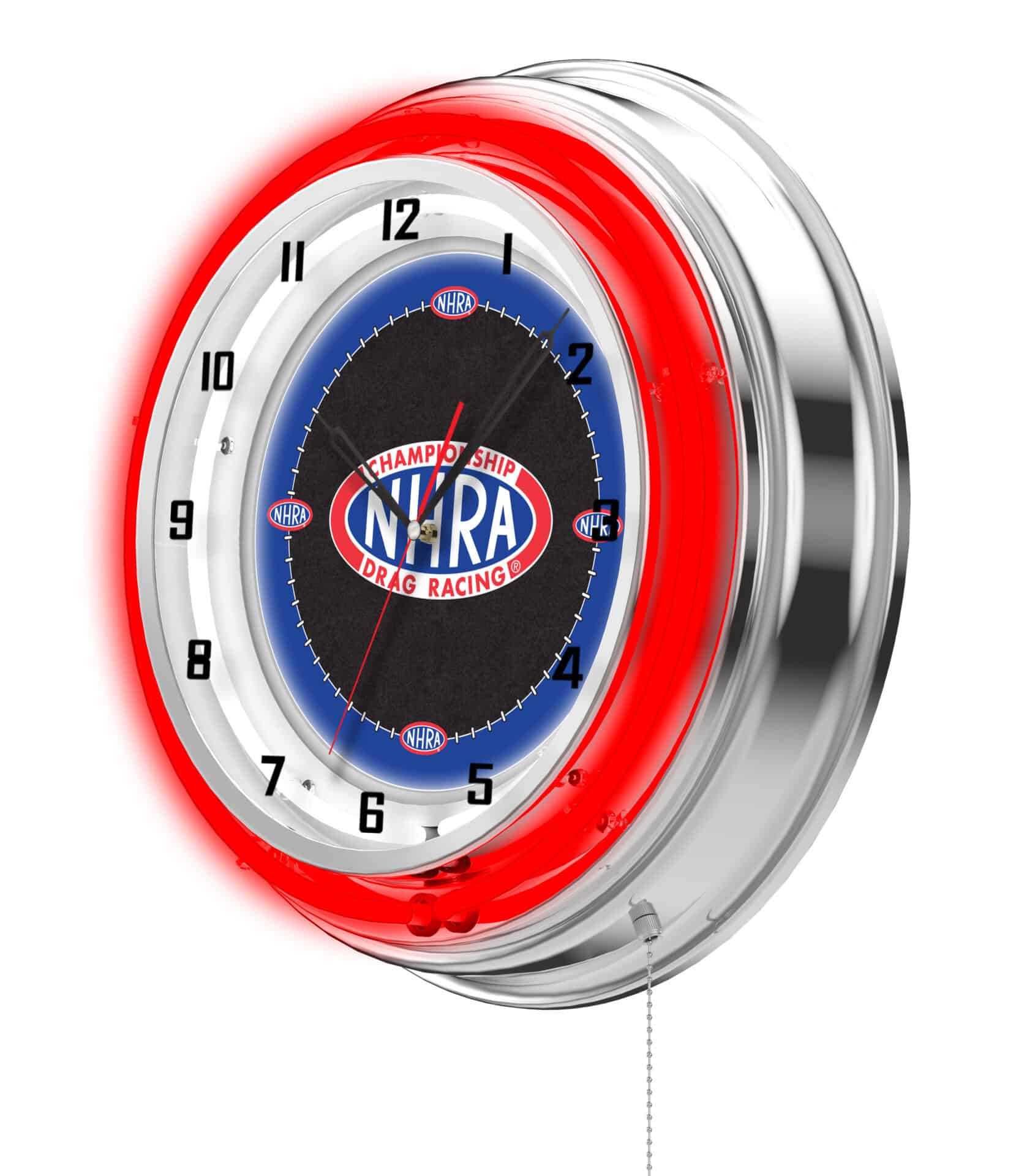 The NHRA Championship Drag Racing (Red Neon) 19-Inch Neon Logo Clock in Chrome is the ultimate timepiece for fans of the world’s fastest sport. Featuring a stunning chrome casing with vibrant colored neon rings, this clock not only tells time but also adds a dynamic touch to your Man Cave or garage. The eye-catching custom graphics on the clock face are illuminated by a brilliant white inner neon ring, creating a striking visual effect. With a convenient pull chain for easy on/off operation and accurate quartz movement powered by a single AA battery, this clock combines functionality with style.