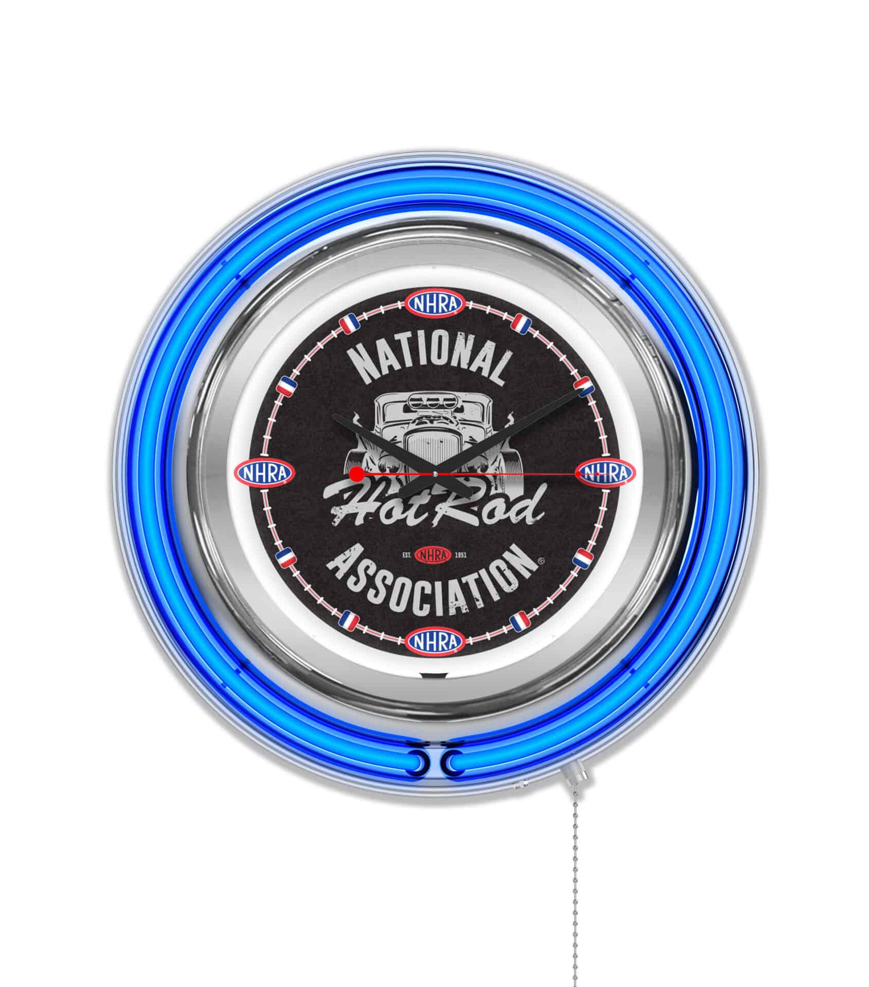 The NHRA – Hot Rod (Blue Neon) 15-Inch Neon Logo Clock in Chrome is a stunning addition to any Man Cave or garage, combining functionality with vibrant style. Featuring a striking chrome casing and an eye-catching neon ring, this clock is designed to stand out. The custom printed graphics on the clock face come to life when illuminated by the brilliant white inner neon ring, making it a perfect showcase for your love of racing.