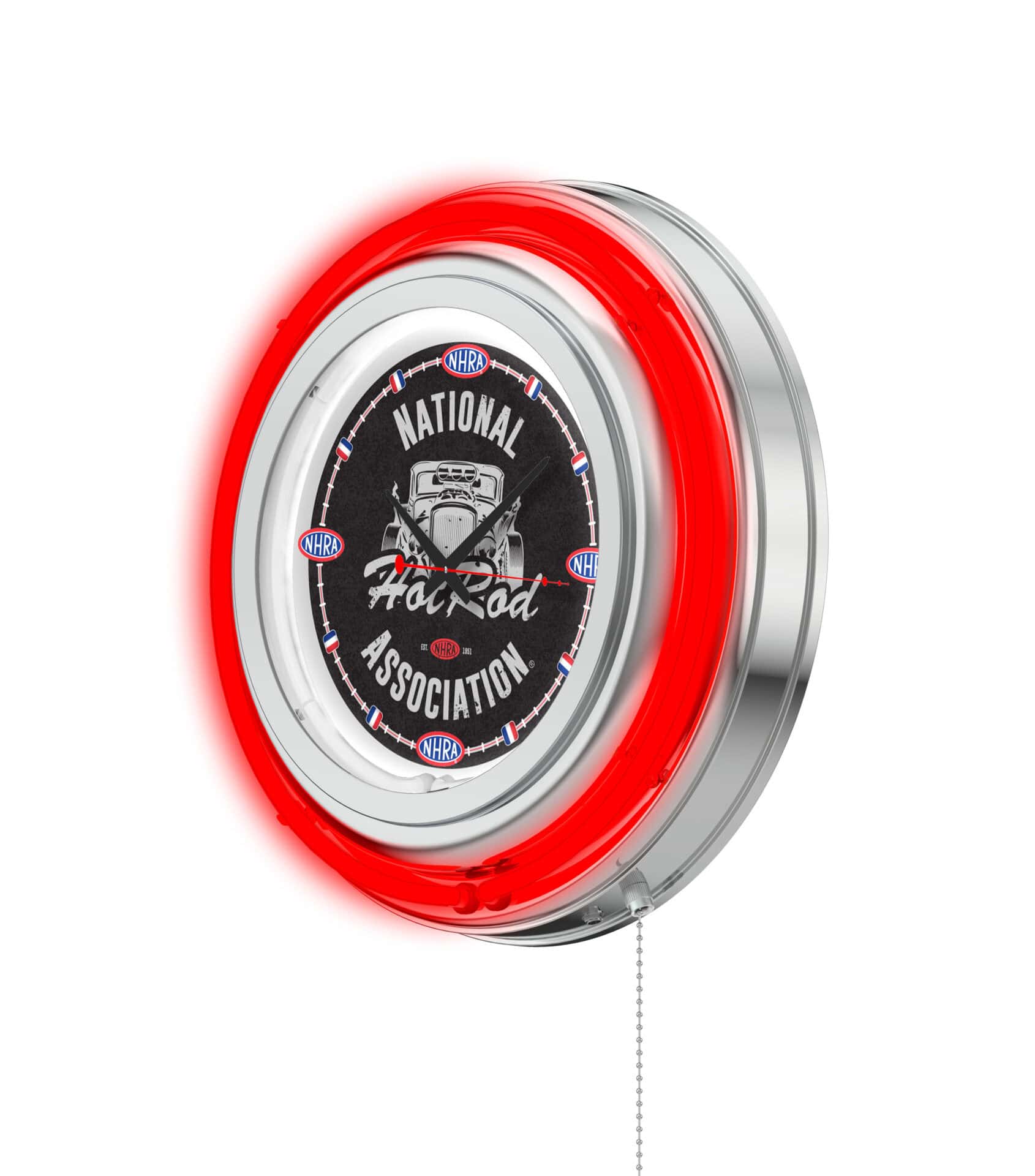 The NHRA – Hot Rod (Red Neon) 15-Inch Neon Logo Clock in Chrome is the ultimate addition to any enthusiast’s space. This eye-catching clock features a vibrant neon design that illuminates your love for fast cars and racing. The chrome casing and colorful neon rings not only enhance its aesthetic appeal but also provide a striking visual effect when lit. The clock is equipped with a convenient pull chain for easy on/off operation and runs on a standard 120V outlet, ensuring that you can enjoy its brilliance with minimal hassle. With accurate quartz movement powered by a single AA battery, this clock combines style with functionality, making it a perfect fit for your Man Cave or garage.