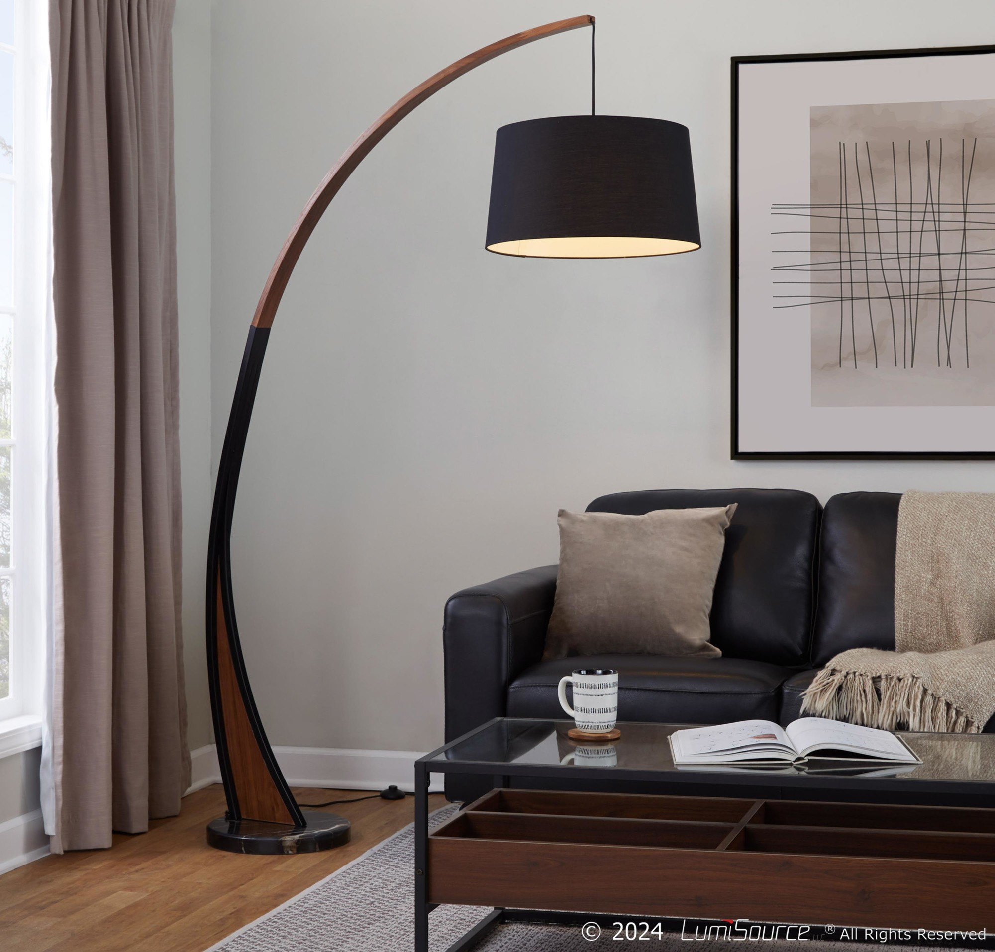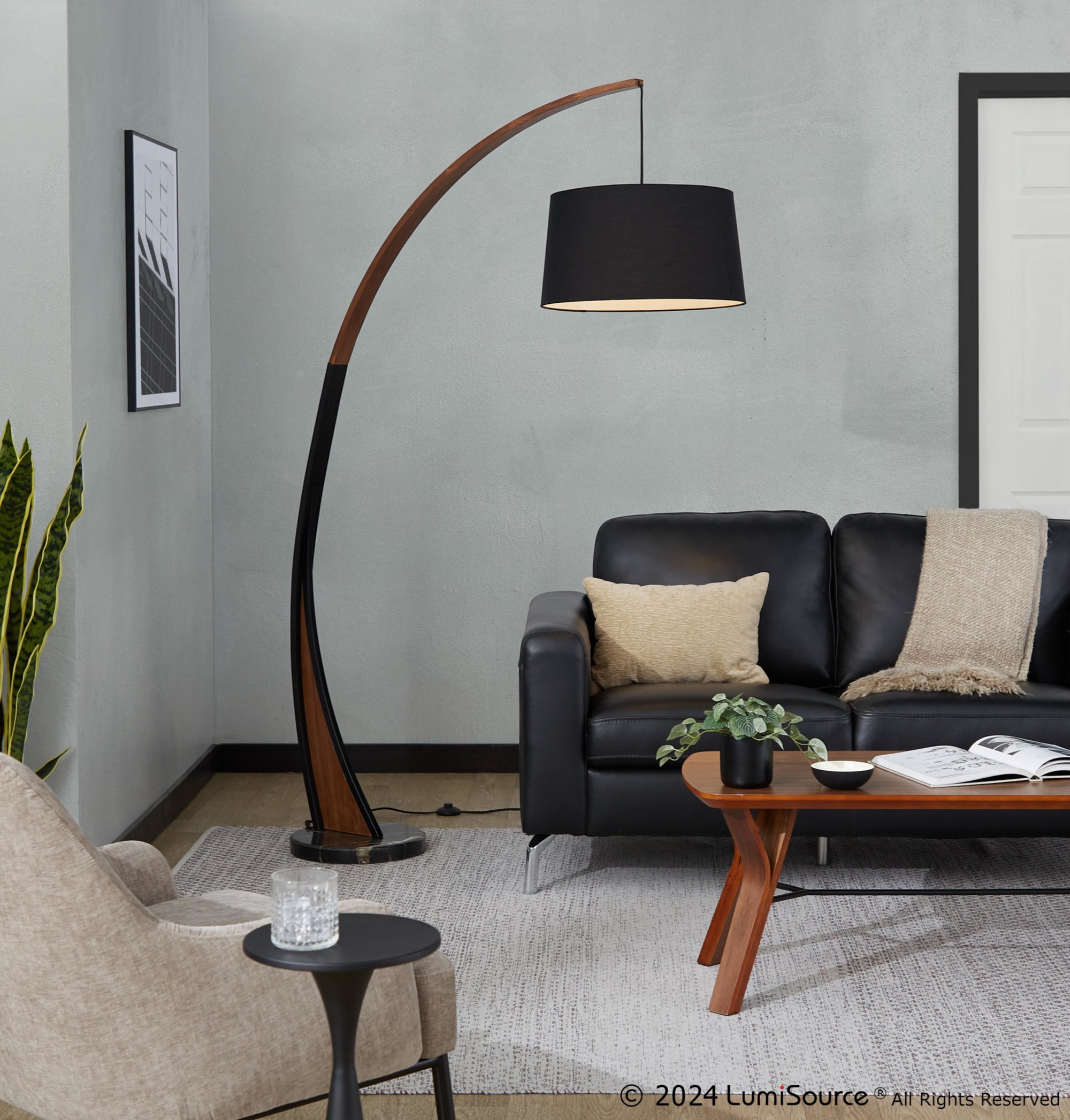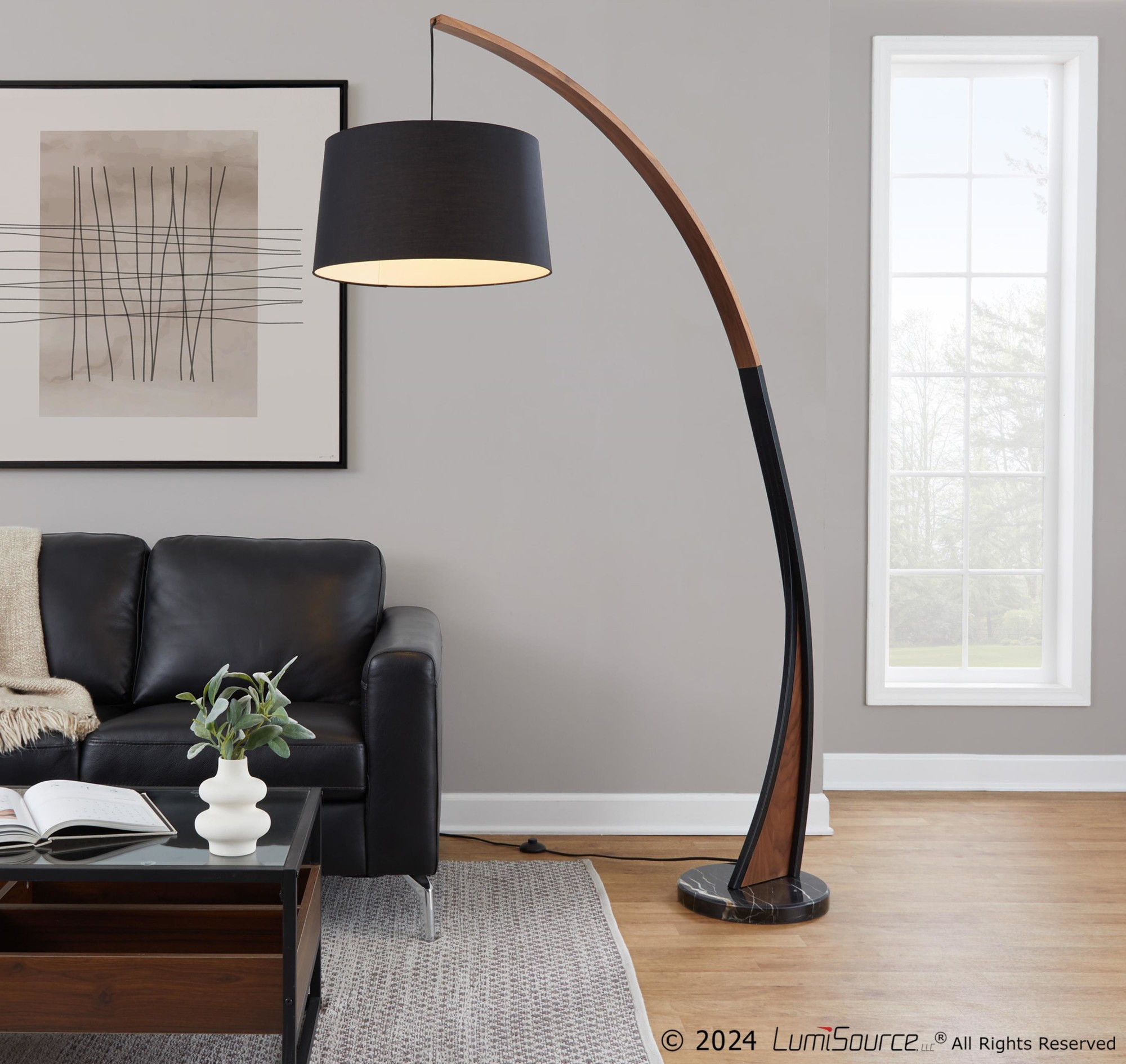 Add a touch of class with the unique design of this floor lamp. The arched, walnut wood frame and marble base give it a mid-century modern feel. The black linen shade spreads the light softly. It needs one 60W bulb (not included). This lamp is 77″ high and 18″ wide, perfect for any room in the cave. Some assembly needed, but Thorak can do it, so you can too!