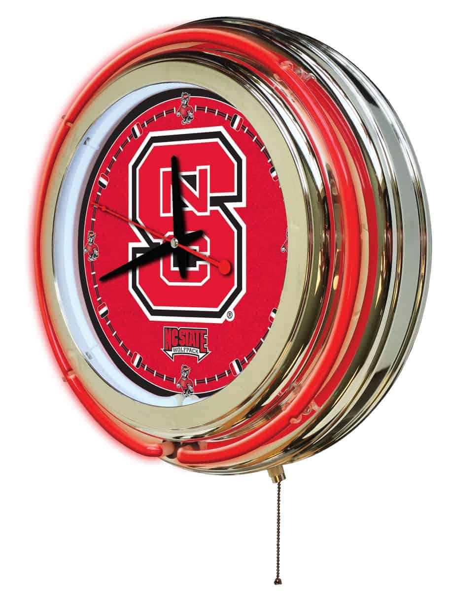 The North Carolina State University 15-Inch Neon Logo Clock in Chrome is the perfect addition to any man cave or sports room, showcasing your school pride with its vibrant design. Featuring a sleek chrome casing and a team color-specific neon outer ring, this clock not only tells time but also enhances your decor. The custom-printed clock face is illuminated by a brilliant white inner neon ring, making it a standout piece. With easy ON/OFF operation using a pull chain, this clock runs on a standard 120V outlet and is powered by a single AA battery (not included). Enjoy accurate timekeeping with its quartz movement and bring a touch of excitement to your space.