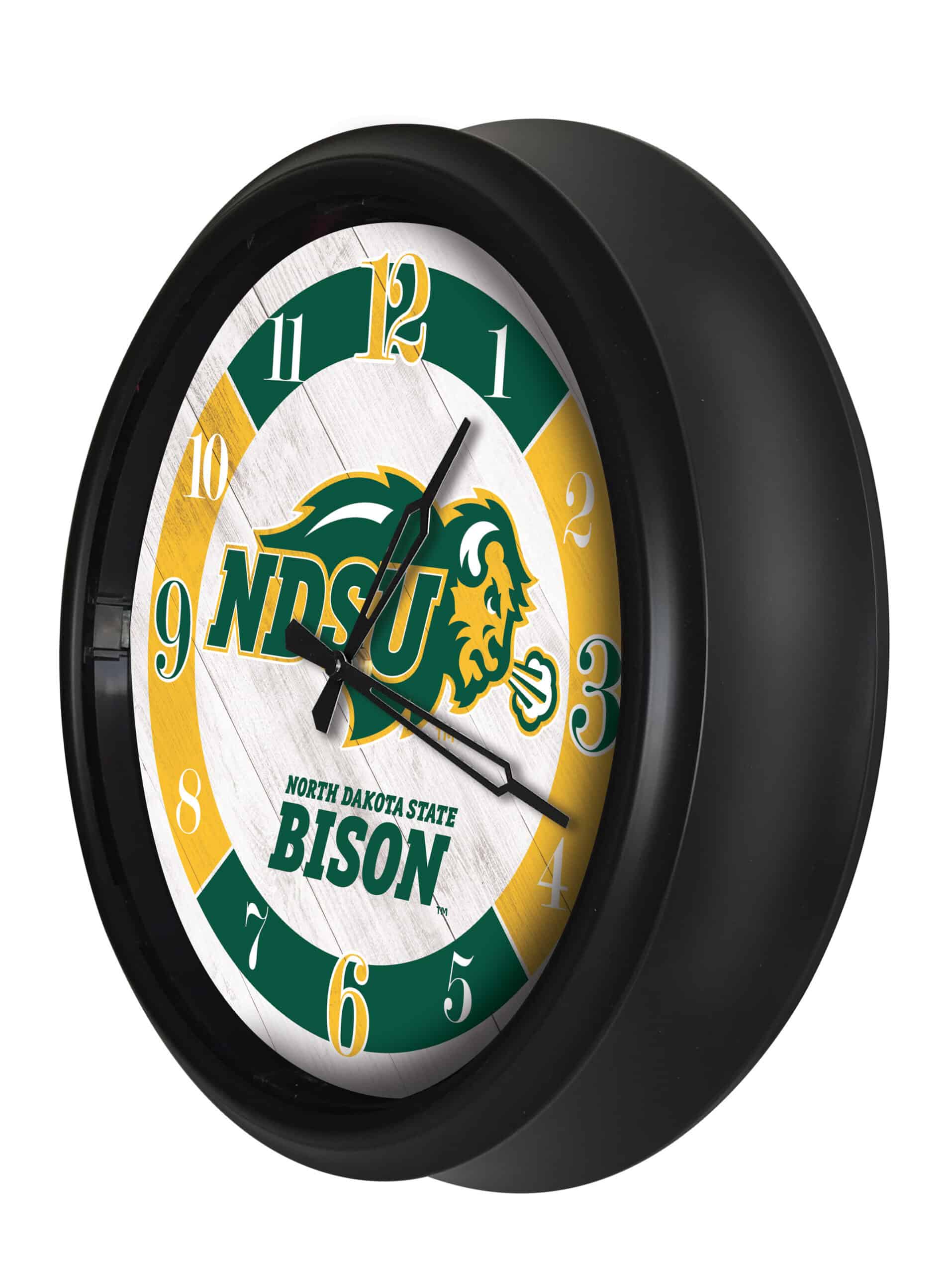 The North Dakota State University 14-Inch Indoor/Outdoor LED Wall Clock in Black is the perfect addition to any fan’s space, whether indoors or outdoors. This stylish clock features a robust design that is both functional and visually appealing, showcasing vibrant, fade-resistant artwork. Its weather-resistant casing ensures durability, while the automatic LED illumination provides easy visibility in low-light conditions. With a precise quartz movement, this clock is not only a great way to display your school pride but also a reliable timekeeper.