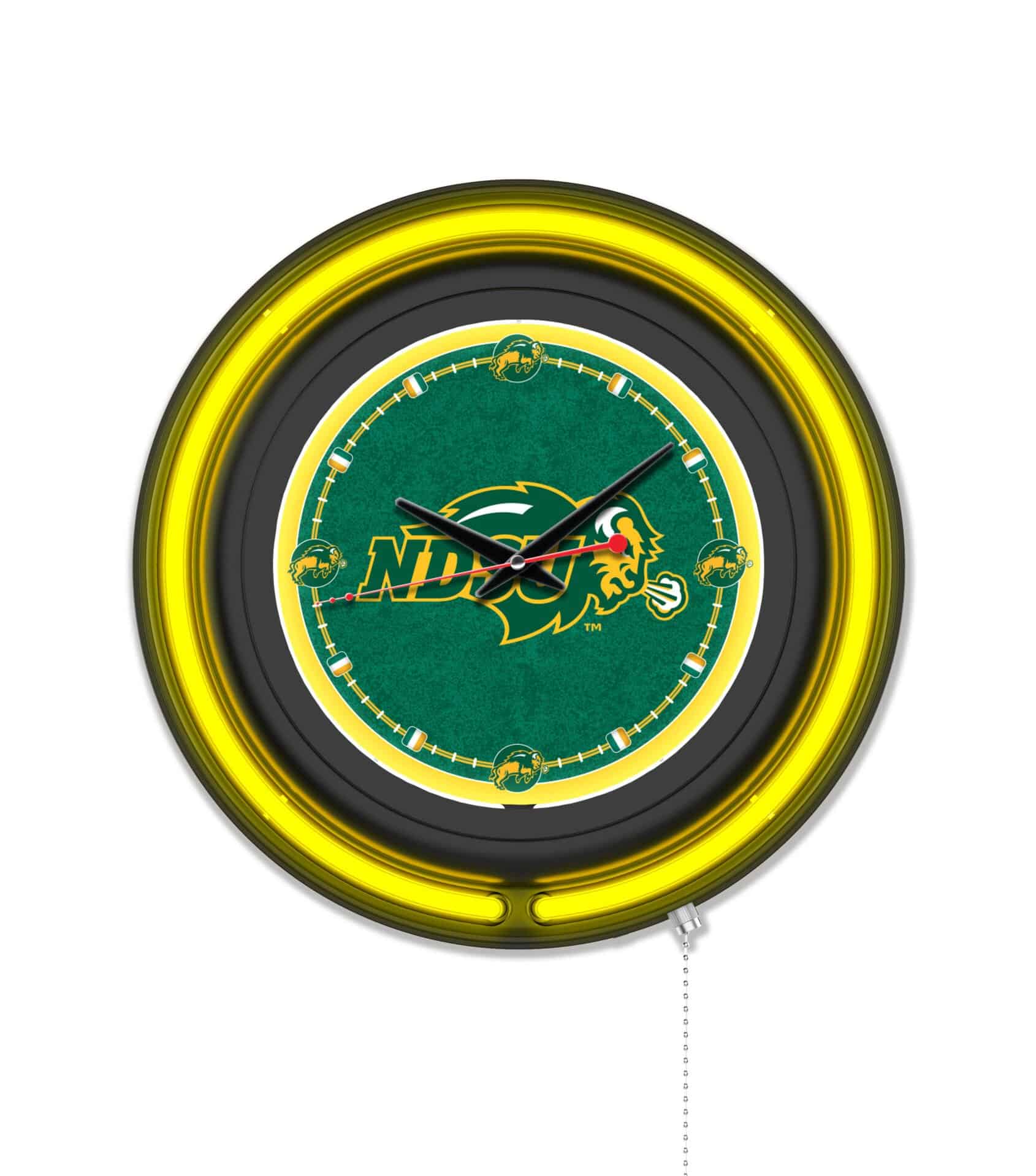 The North Dakota State University 15-Inch Neon Logo Clock in Black is the ultimate addition to any fan’s space. This striking clock features a vibrant team logo illuminated by a brilliant white neon inner ring, accentuated by a team color-specific outer neon ring. The clock not only showcases school pride but also serves as a functional timepiece with accurate quartz movement. Its sleek black casing and glass lens face add a modern touch, making it a perfect gift for grads, sports fans, or for your own man cave.