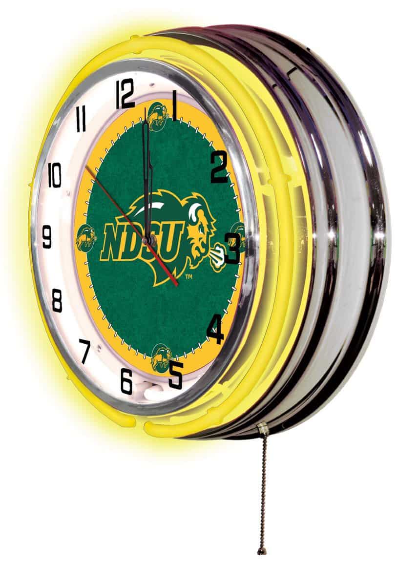 The North Dakota State University 19-Inch Neon Logo Clock in Chrome is a stunning addition to any man cave, showcasing your school pride while providing practical timekeeping. This clock features a vibrant, custom printed clock face illuminated by brilliant white neon, surrounded by an outer neon ring in team colors. The stylish chrome casing and glass lens add a sleek touch, making it a perfect gift for sports fans or recent graduates.