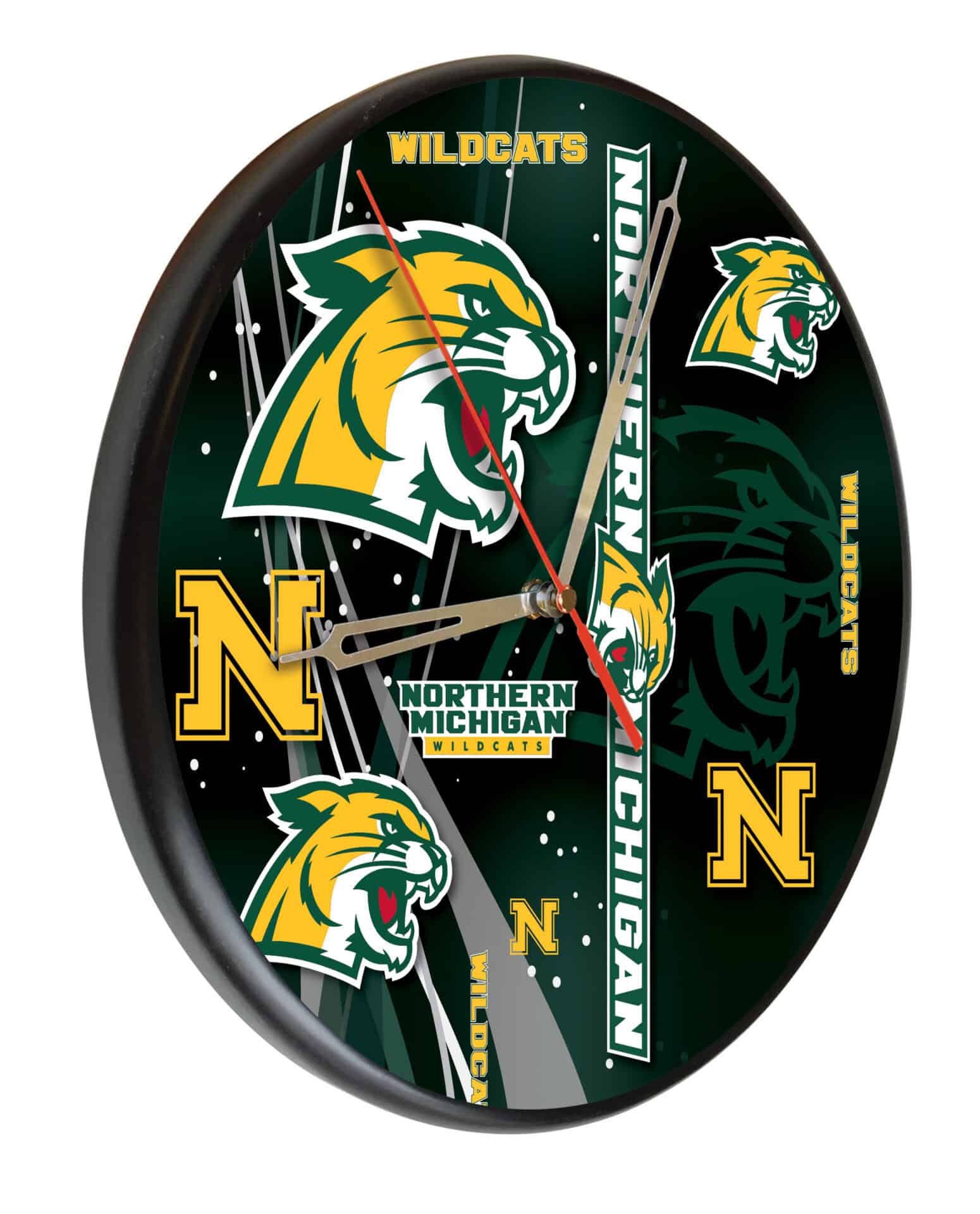 The Northern Michigan University 13-Inch Solid Wood Clock in Black is an ideal addition to any man cave, showcasing your school pride with style. This officially licensed clock features vibrant first surface, digitally printed graphics using UV inks that resist fading over time. With its accurate quartz movement, this clock ensures you always keep track of time, powered by a single AA battery (not included). The recessed keyhole hanger allows for easy installation, ensuring it hangs flat against the wall for a seamless look. Perfect as a gift for graduates or sports enthusiasts, this clock combines functionality and pride.