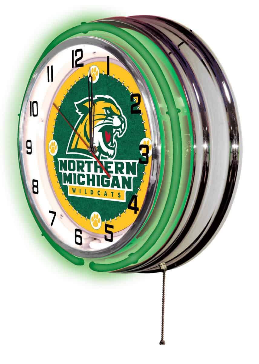 The Northern Michigan University 19-Inch Neon Logo Clock in Chrome is the perfect addition to any fan’s space, showcasing school pride with style. Featuring a sleek chrome casing and vibrant team-colored neon accents, this clock not only tells time but also serves as a stunning decor piece. The custom printed clock face is illuminated by a brilliant white inner neon ring, creating a captivating visual effect. With its easy-to-use pull chain for turning the neon lights on and off, and accurate quartz movement powered by a single AA battery, this clock combines functionality with flair, making it an ideal gift for graduates, sports enthusiasts, or for your own man cave.