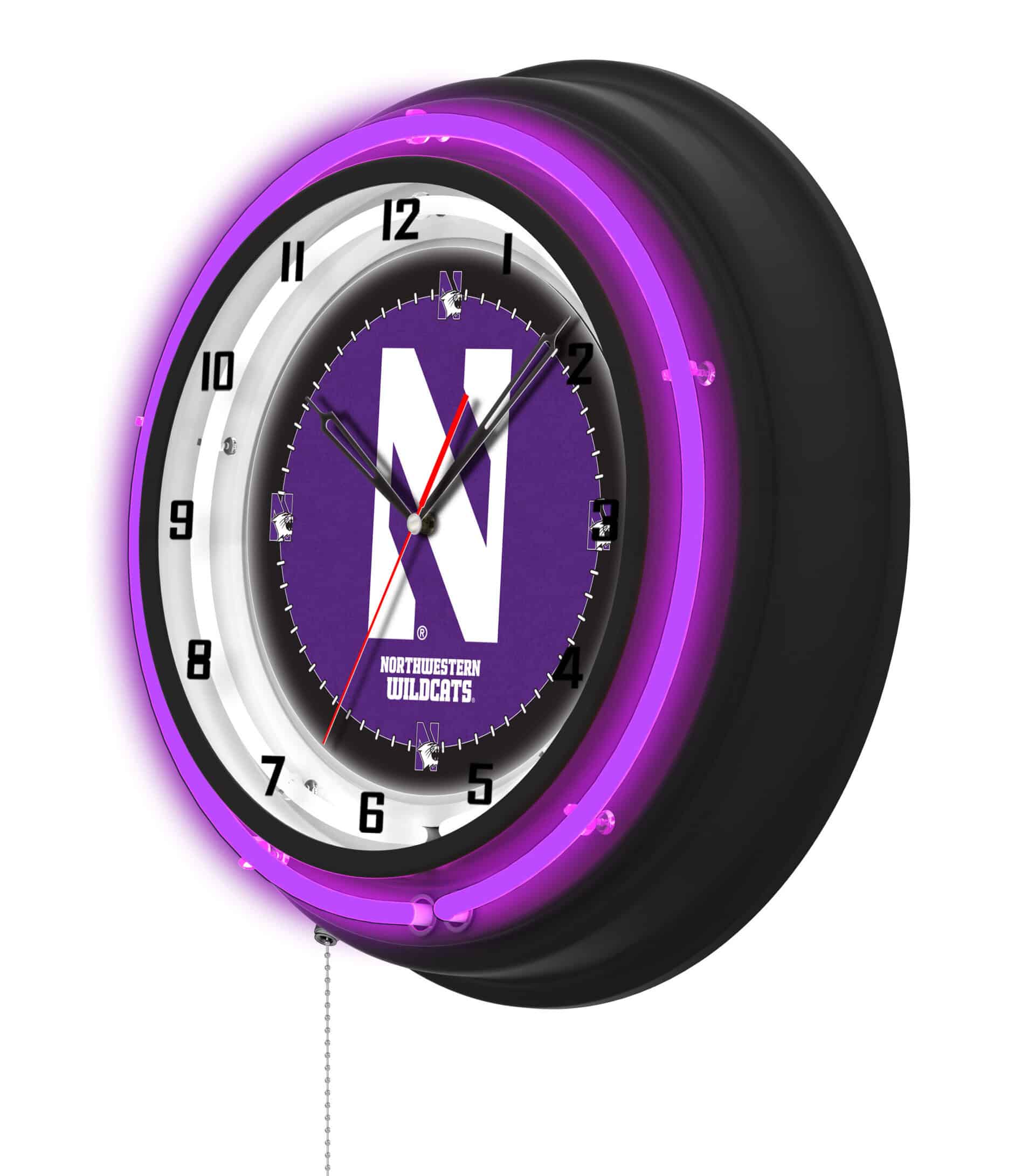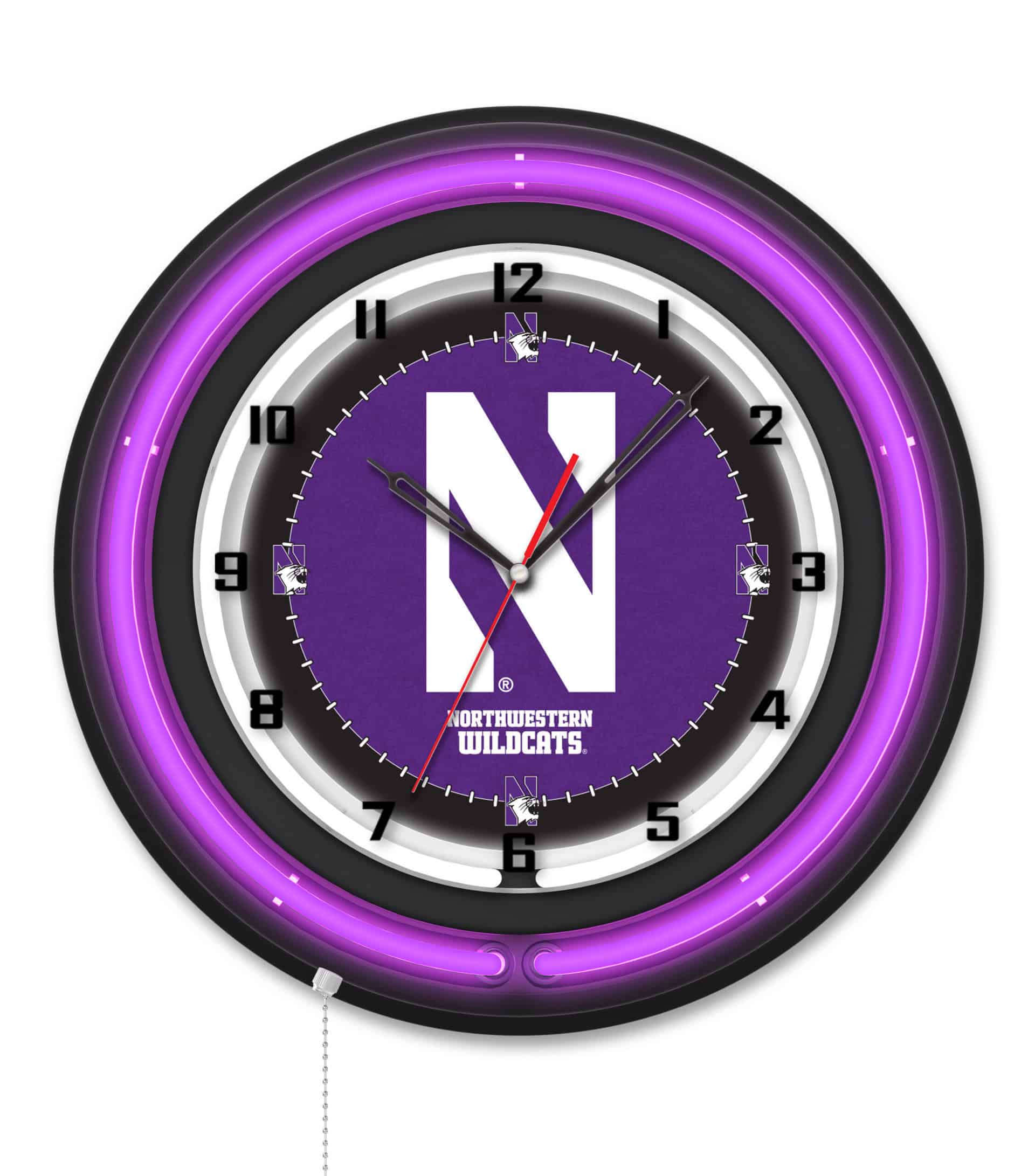 The Northwestern University 19-Inch Neon Logo Clock in Black is an eye-catching addition to any man cave, showcasing your school pride with a vibrant design. Featuring a sleek black casing and a neon outer ring in team colors, this clock not only tells time but also serves as a stylish decor piece. The brilliant white inner neon ring illuminates the custom printed clock face, making it a standout feature in any room. With easy operation via a pull chain and accurate quartz movement, this clock combines functionality with a striking look.