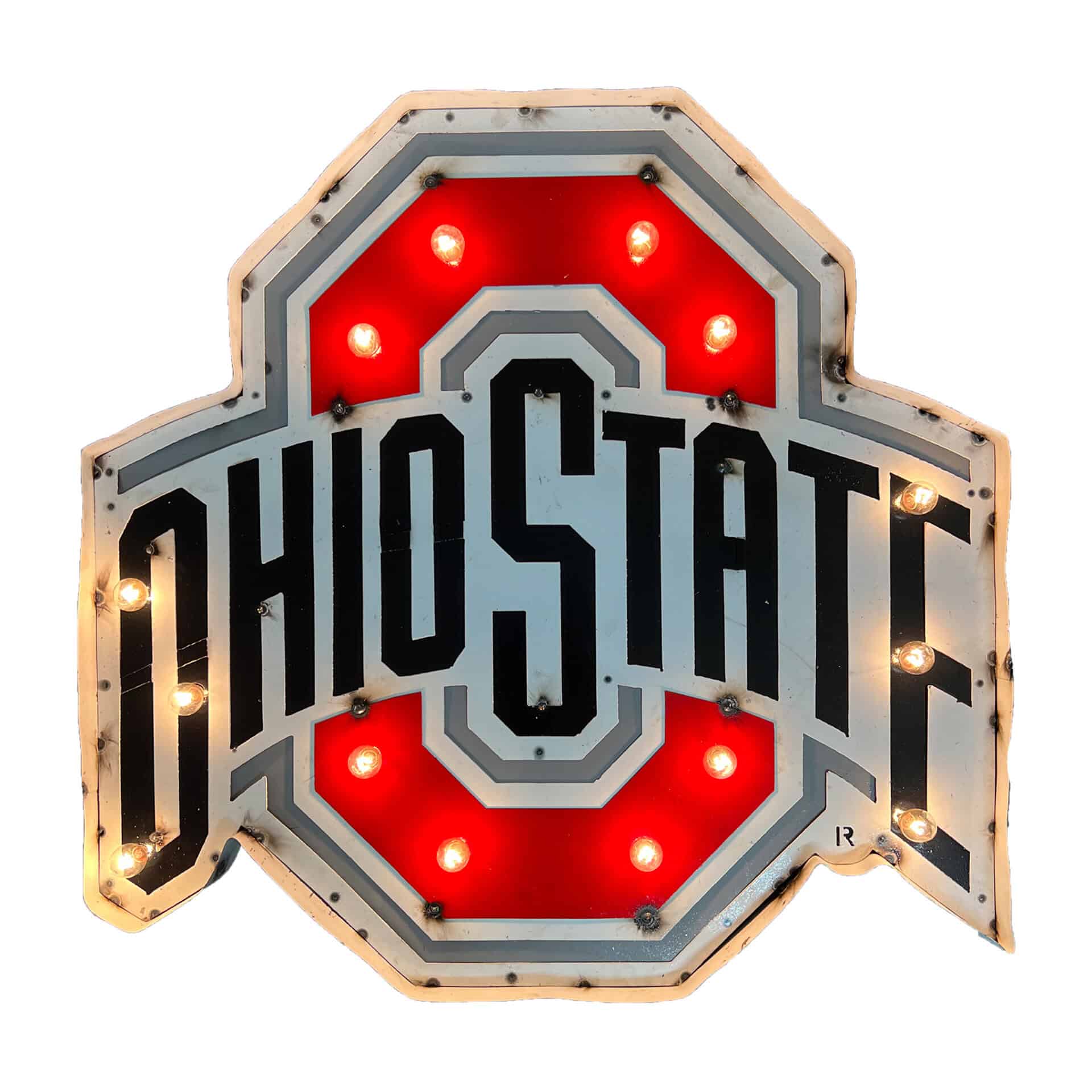 Welcome fellow Buckeyes! Show your Ohio State pride with this unique, handcrafted lighted metal sign. Perfect for your home, office, or fan cave, this sign adds a touch of retro charm while displaying your team spirit. Each sign is carefully constructed from recycled metals, giving it a distinctive and eco-friendly appeal. The included lights create a warm and inviting glow, making it a standout piece wherever you choose to display it. This sign features channel logo and exposed weld spots that give a unique, retro look to any space.
