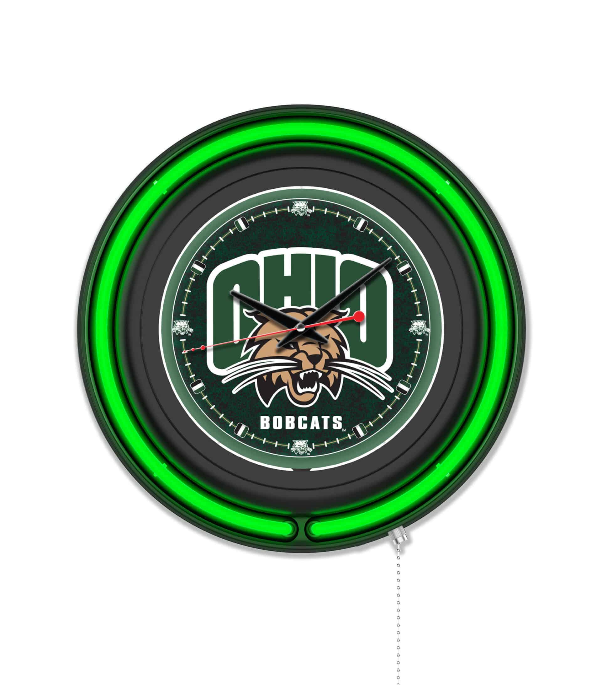 Show your school spirit with the Ohio University 15-Inch Neon Logo Clock in Black. This eye-catching clock features a sleek black casing and a vibrant neon outer ring in team colors, complemented by a custom-printed clock face illuminated by a brilliant white inner neon ring. Perfect for man caves, dorm rooms, or any space that needs a touch of team pride, this clock combines functionality with style. The neon rings are easily controlled with a pull chain, and the clock is powered by a UL-listed transformer for safety. With accurate quartz movement and officially licensed artwork, this clock is a must-have for fans and alumni alike.