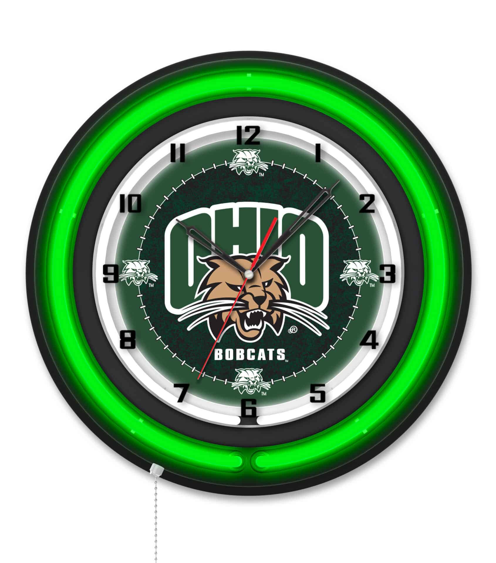 The “Ohio University 19-Inch Neon Logo Clock in Black” is an eye-catching addition to any man cave, showcasing vibrant school pride with its unique design. This clock features a striking black casing and a neon outer ring, with a custom printed clock face illuminated by a brilliant white inner neon ring. The neon rings can be easily activated with a pull chain, providing the perfect ambiance for your space. With accurate quartz movement powered by a single AA battery (not included), this clock ensures you’ll always be on time.