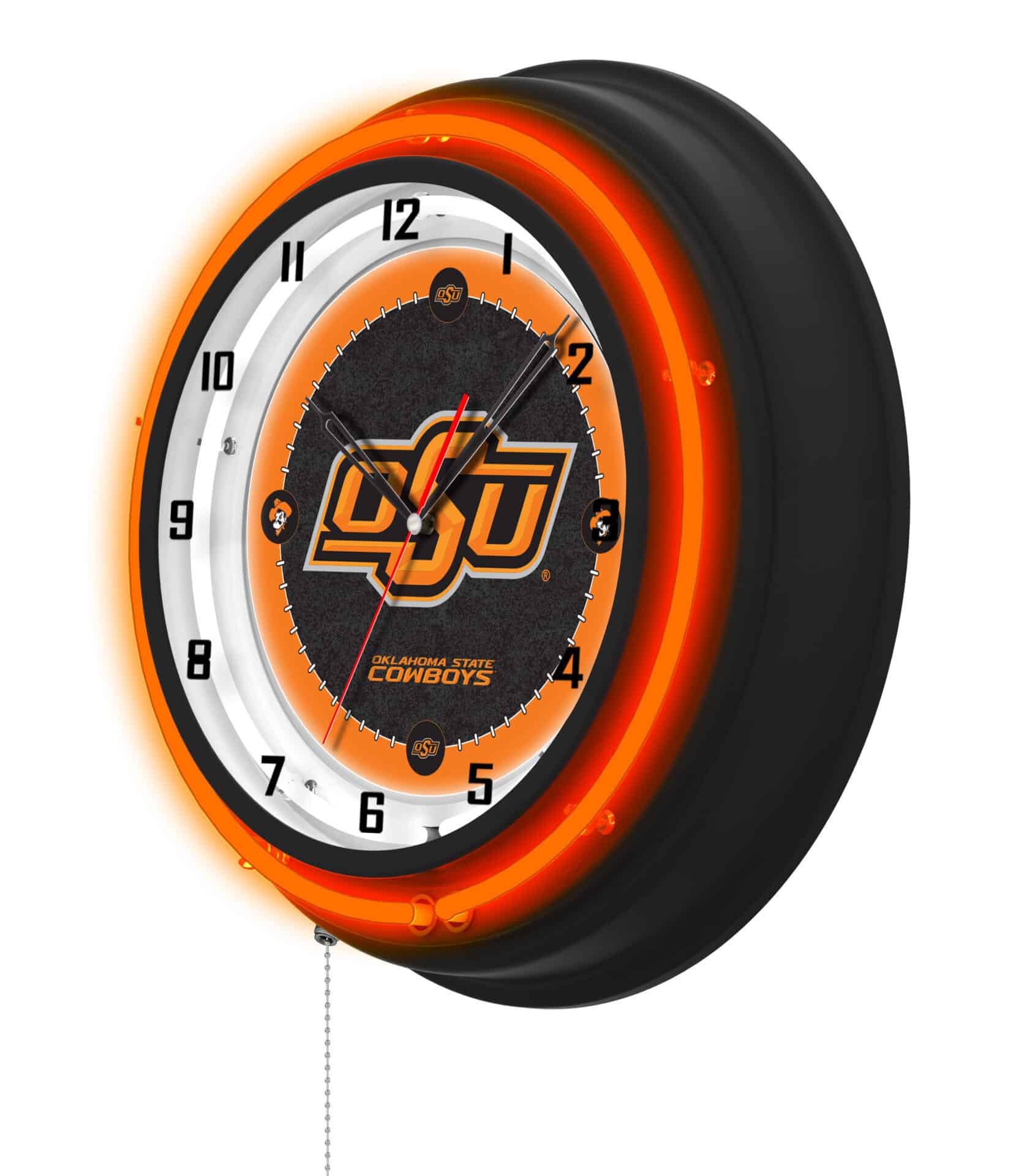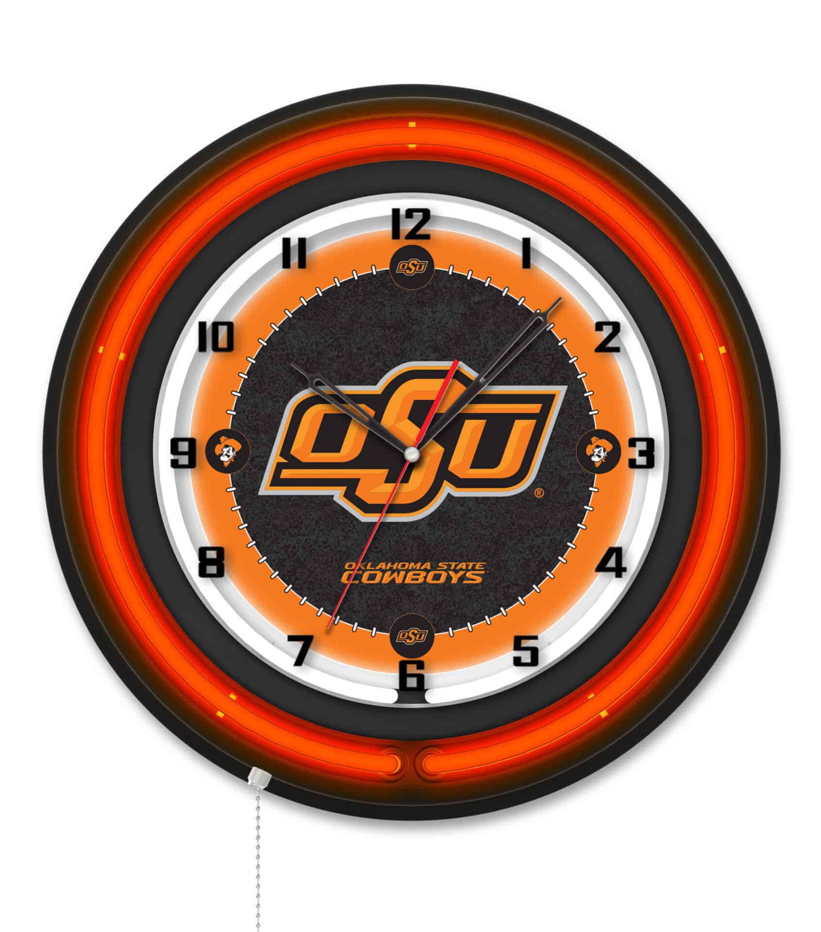 The Oklahoma State University 19-Inch Neon Logo Clock in Black is the perfect addition to any man cave, showcasing your school pride in a vibrant and stylish way. Featuring a sleek black casing and neon accents, this clock not only tells time but also serves as an eye-catching decor piece. The double neon tubes provide stunning illumination, with a brilliant white inner ring lighting up the custom printed clock face. The pull chain on the bottom makes it easy to turn the neon lights on and off, while the accurate quartz movement ensures you’re always on time.