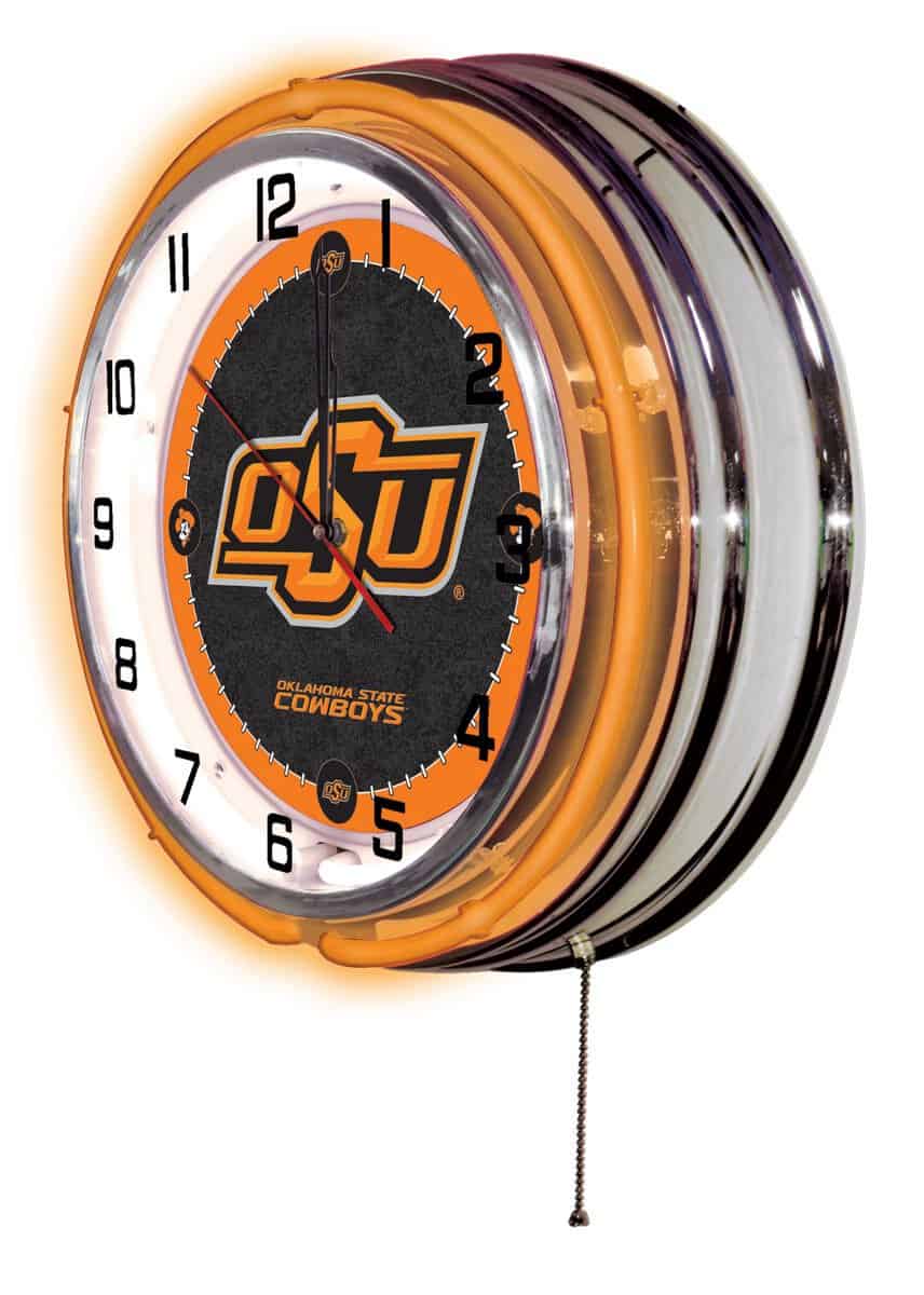 The Oklahoma State University 19-Inch Neon Logo Clock in Chrome is the perfect addition to any man cave, showcasing your school pride with a vibrant design. This clock features a stylish chrome casing and a neon outer ring that complements the custom printed clock face. The brilliant white inner neon ring illuminates the clock, creating a striking visual. With easy on/off functionality via a pull chain and powered by a standard 120V outlet, this clock not only keeps accurate time but also enhances your space’s ambiance. Whether for a sports fan, a recent graduate, or yourself, this clock is an ideal gift that combines style and functionality.