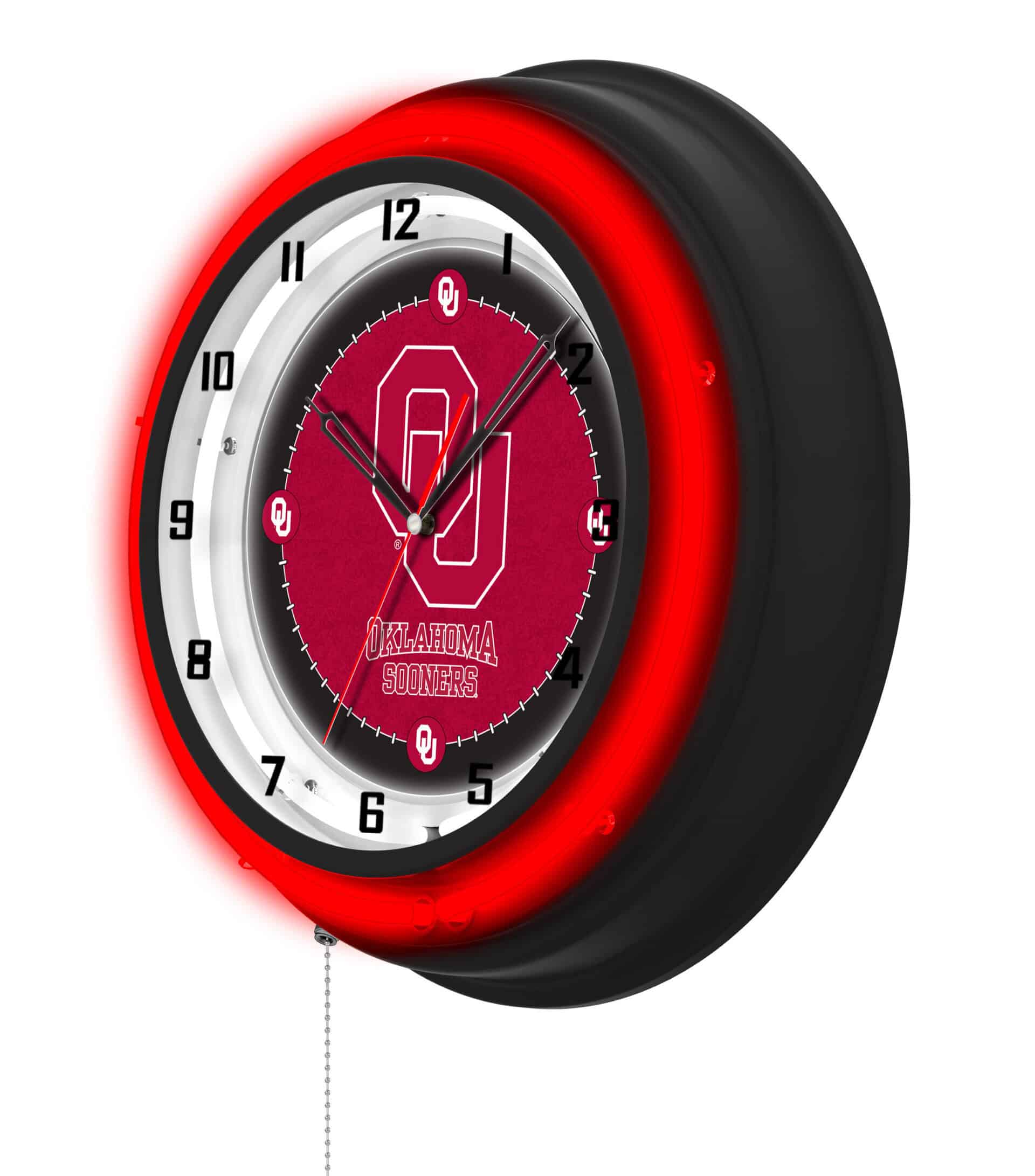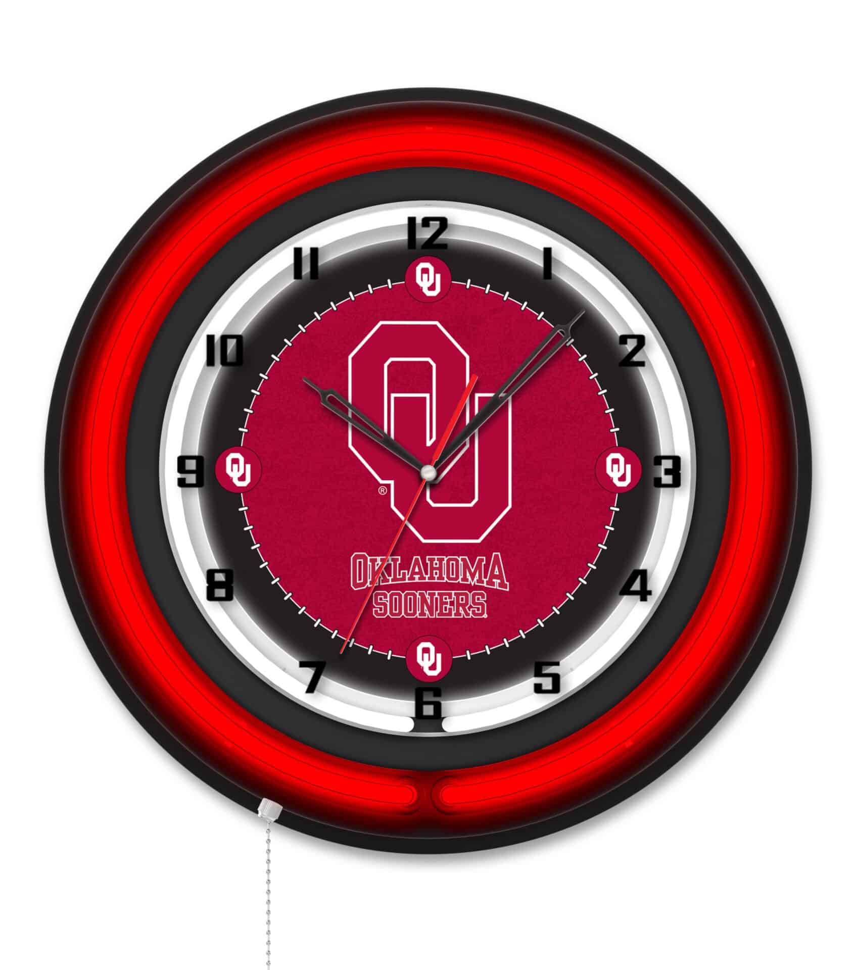 The Oklahoma University 19-Inch Neon Logo Clock in Black is the ideal addition to any space, showcasing your school pride with vibrant colors and a stylish design. This clock features a sleek black casing and a neon outer ring that highlights a custom-printed clock face, illuminated by a brilliant white inner neon ring. The neon rings can be easily switched on and off using a convenient pull chain located at the bottom of the clock. Powered by a UL Listed transformer, this clock operates from a standard 120V outlet, while its accurate quartz movement ensures precise timekeeping, relying on a single AA battery (not included). Whether you’re looking to celebrate a recent graduate, impress a sports super fan, or treat yourself, this clock is a fantastic choice.