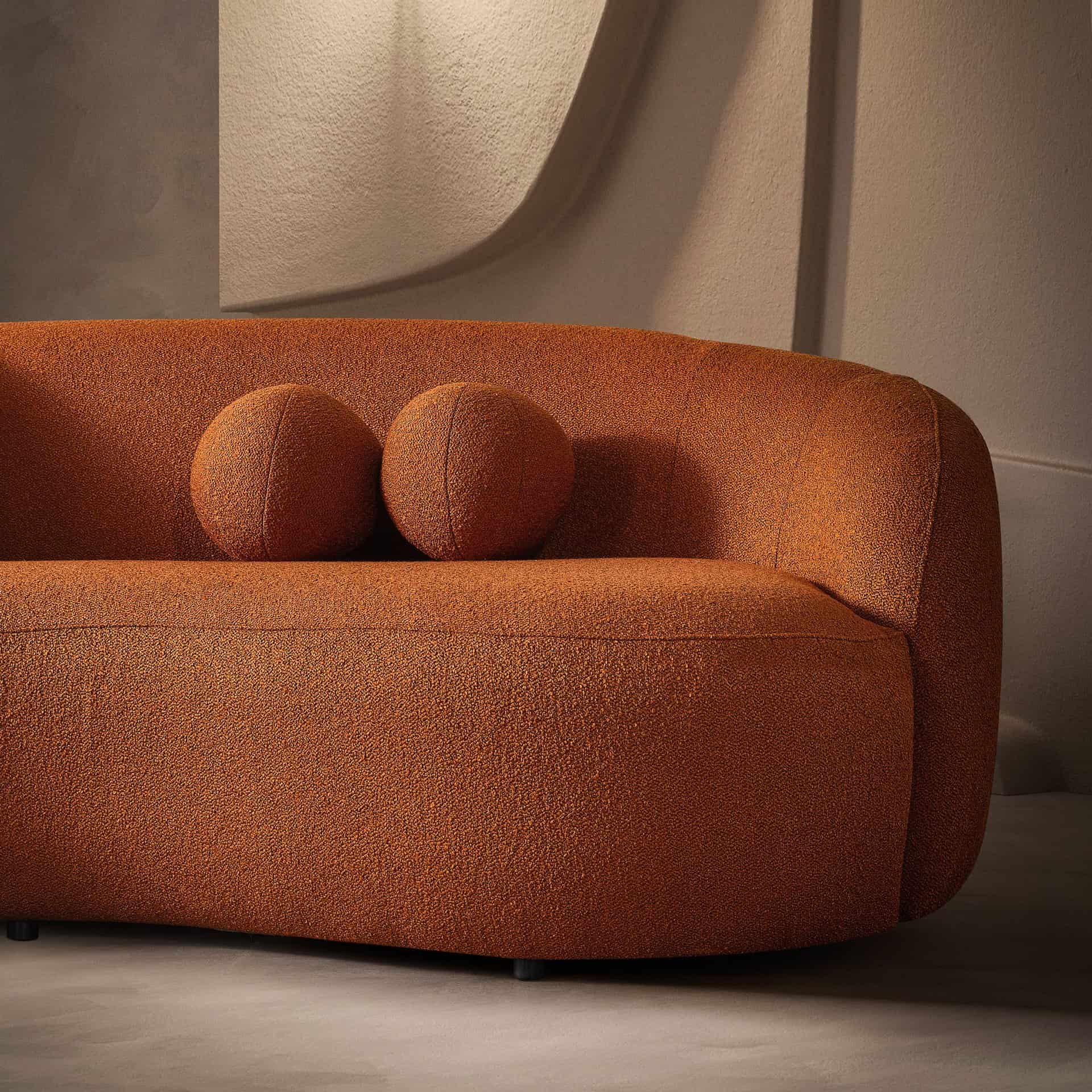 Transform your living space with the plush and stylish comfort of the Orange Boucle Tufted Sofa with Walnut Legs. Featuring a chic tufted design, this sofa adds a sophisticated focal point to any room, while providing a cozy and inviting ambiance for guests and family. Designed for durability and comfort, the high-density foam cushioning and expert craftsmanship ensure long-lasting use. Upholstered in top-quality boucle fabric, the sofa is easy to maintain, and the removable solid wood legs with a walnut finish make maneuvering in tight spaces effortless. Easy to assemble and perfect for everyday use, this sofa is an affordable yet elegant addition to your man cave, living room, den, or urban loft.