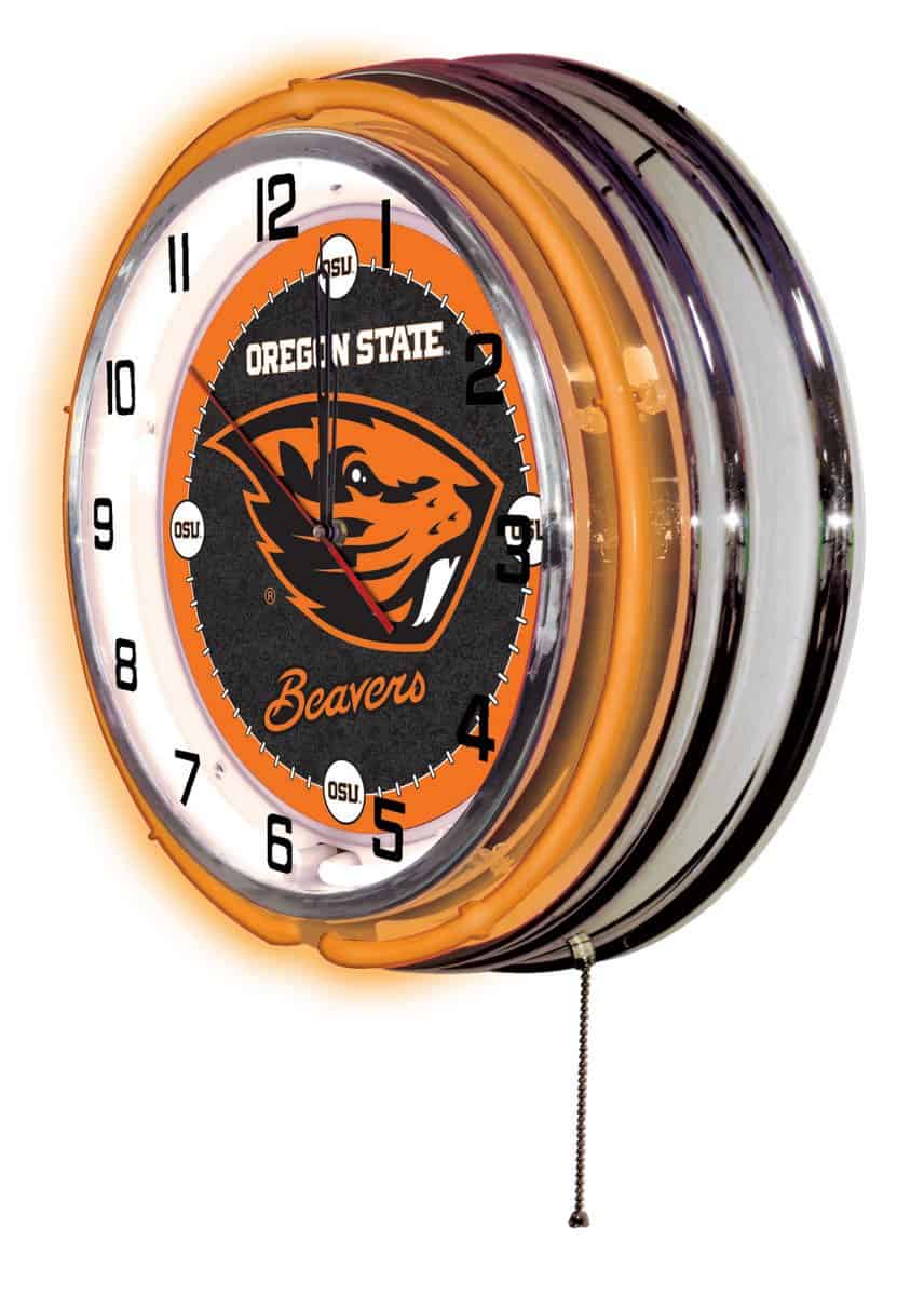 The Oregon State University 19-Inch Neon Logo Clock in Chrome is a striking addition to any man cave, showcasing your school pride with vibrant, full-color artwork. This clock features a chrome casing and a neon outer ring in team colors, illuminating the custom printed clock face with a brilliant white inner neon ring. The neon rings can be easily turned on and off using a convenient pull chain, while the clock itself operates on accurate quartz movement powered by a single AA battery (not included). Perfect as a gift for graduates or sports fans, this clock is both functional and stylish.