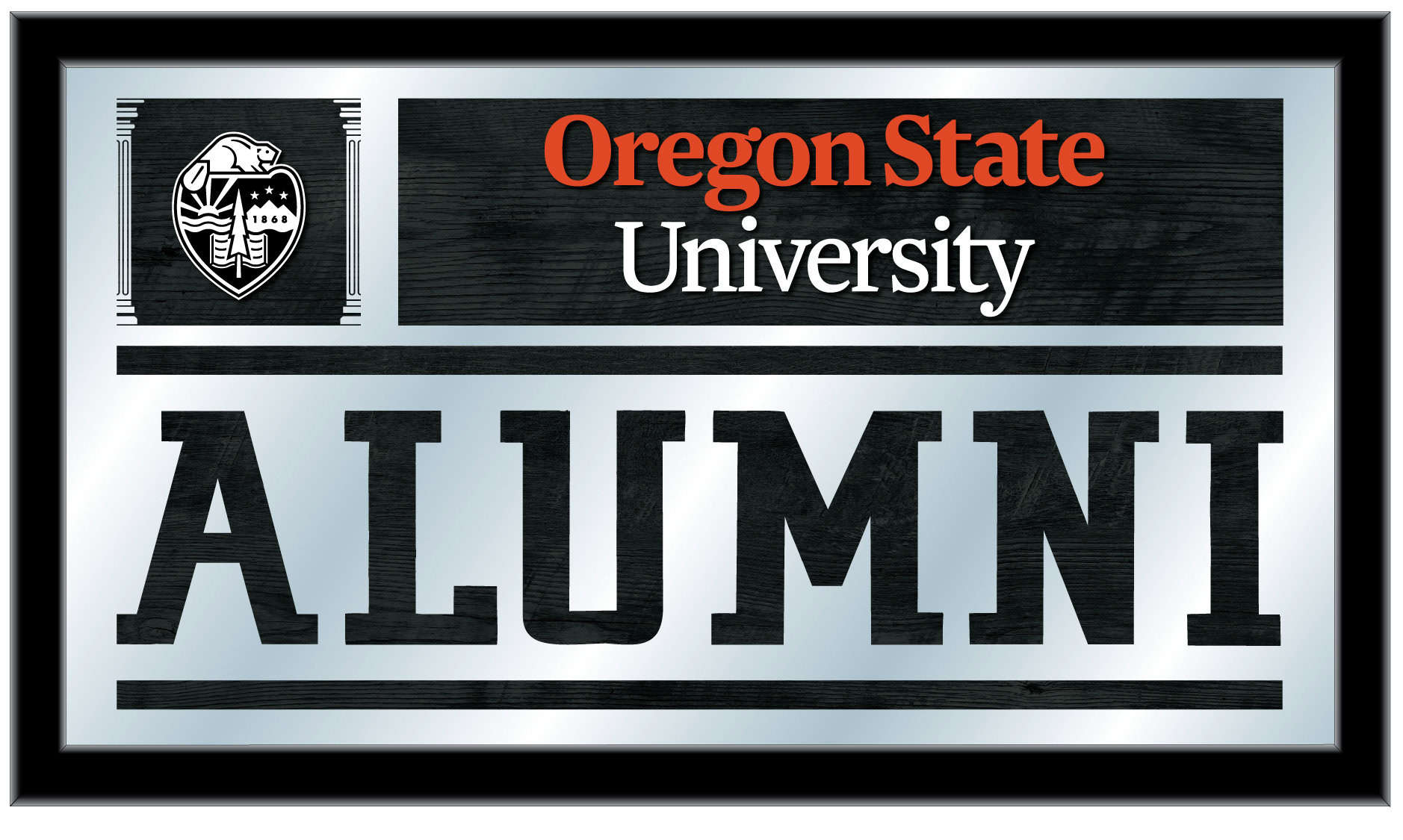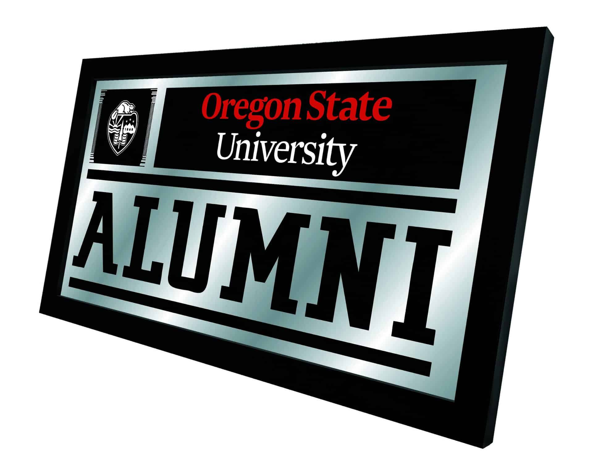 Show your school pride with the Oregon State University 26×15 Alumni Wall Mirror. This mirror features a simple yet elegant design that showcases your school colors through the 1/8″ thick glass, beautifully highlighted by mirrored accents. The mirror is framed with a black, 1 1/4″ wrapped wood frame and includes saw tooth hangers for easy installation. Perfect for your office, garage, or any room in your home, this mirror makes a great gift for recent graduates or a stylish addition to your own decor. Proudly made in the USA, it combines functionality with a touch of school spirit.