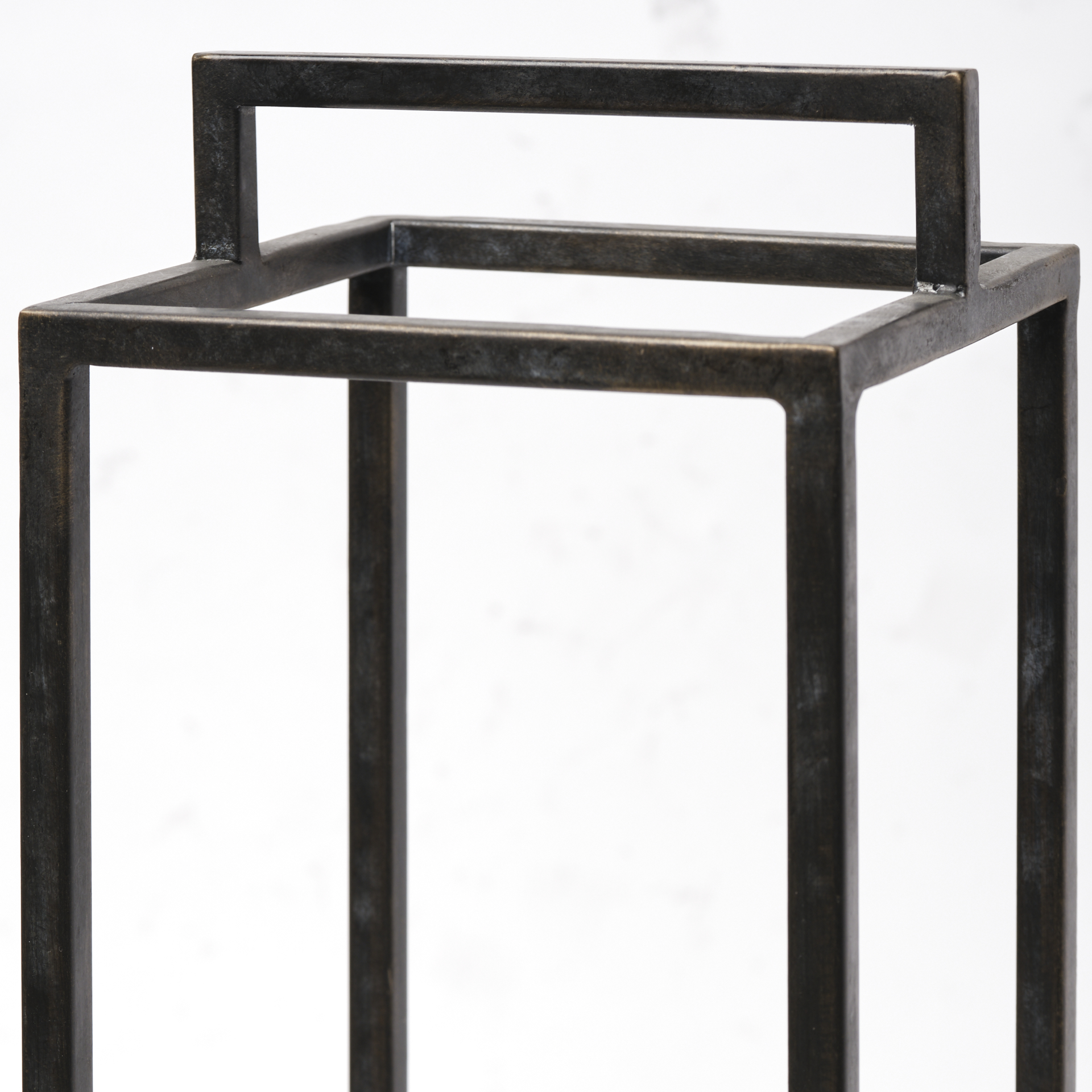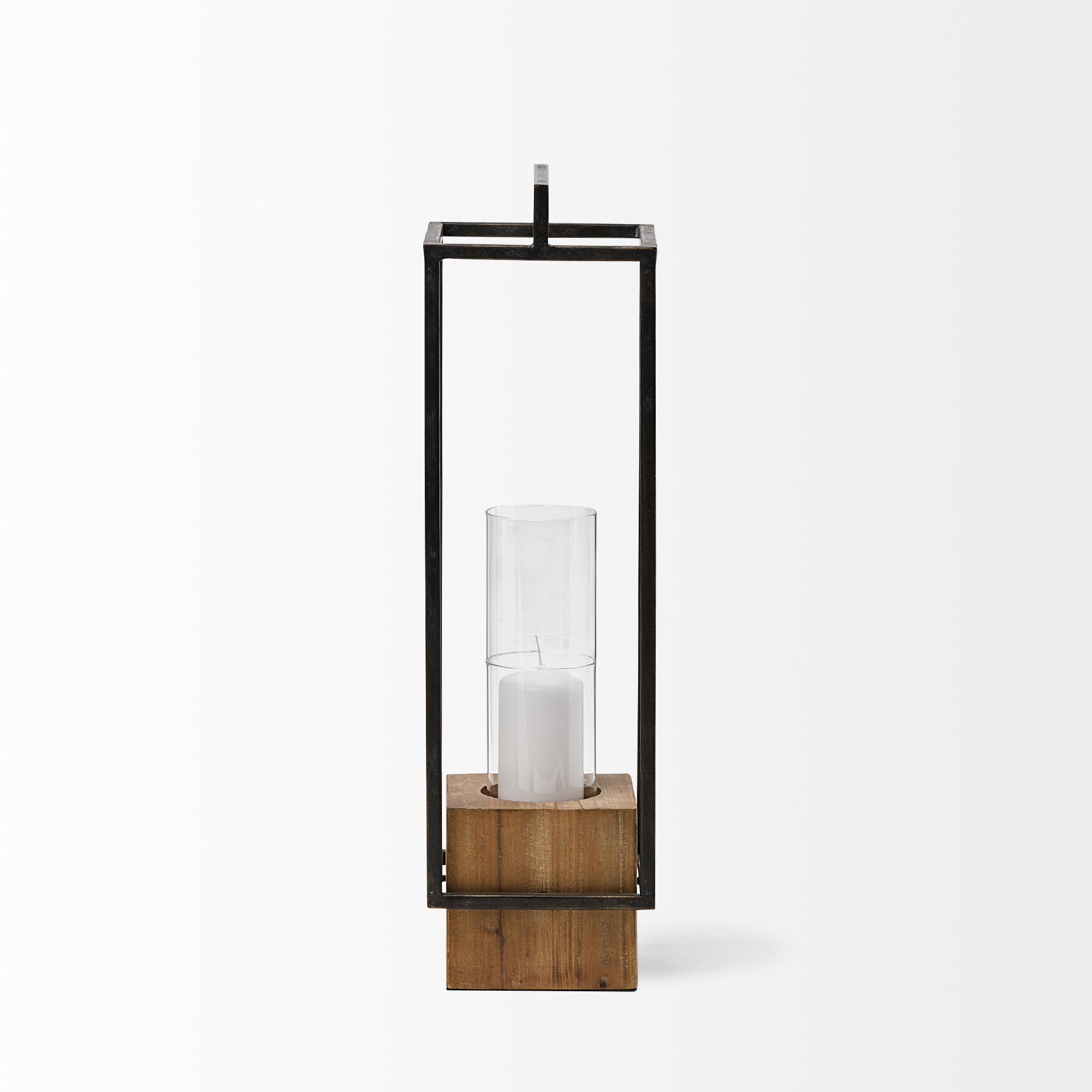 The Orionis lantern brings a touch of style to any space. This lantern features a natural brown-tone wooden base that hosts a glass hurricane vase, perfect for housing your favorite candle. A hollow, rectangular cage-like structure sits atop the wooden block, enhancing its visual appeal. It looks stunning on its own or paired with others from the series.