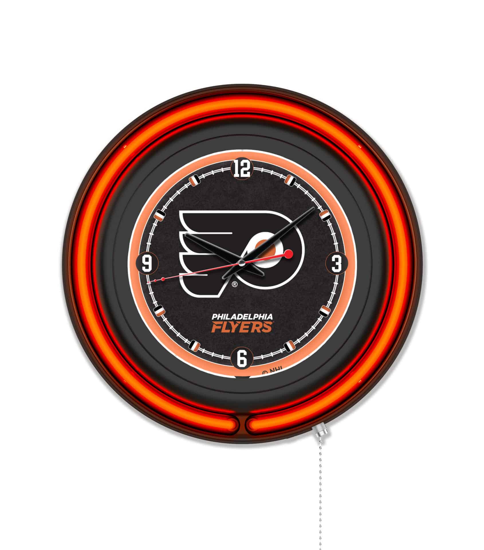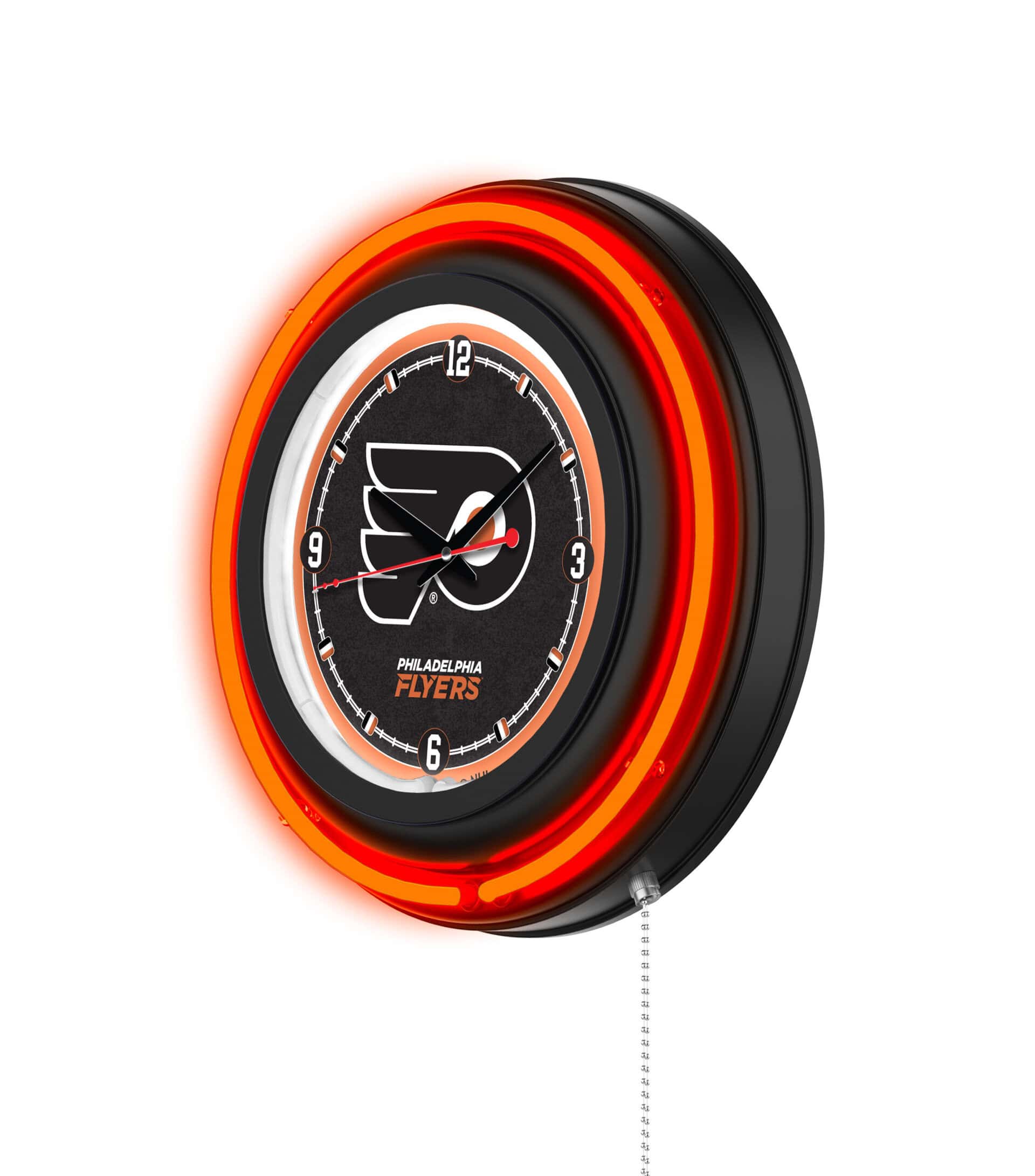 Show off your team pride with this stunning 15-Inch Neon Logo Clock. Featuring a sleek black casing and a vibrant neon outer ring in team colors, this clock is designed to make a bold statement. The custom-printed clock face is illuminated by a brilliant white inner neon ring, creating a striking visual effect. With easy pull-chain operation for the neon lights and accurate quartz movement, this clock is both functional and stylish. Perfect for any sports fan’s man cave or home decor, this officially licensed product combines quality craftsmanship with eye-catching design.