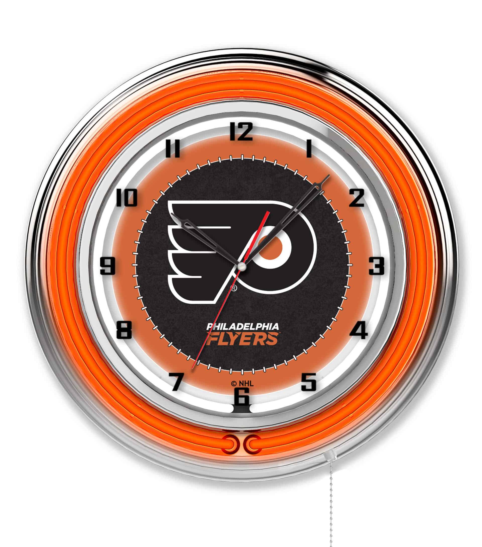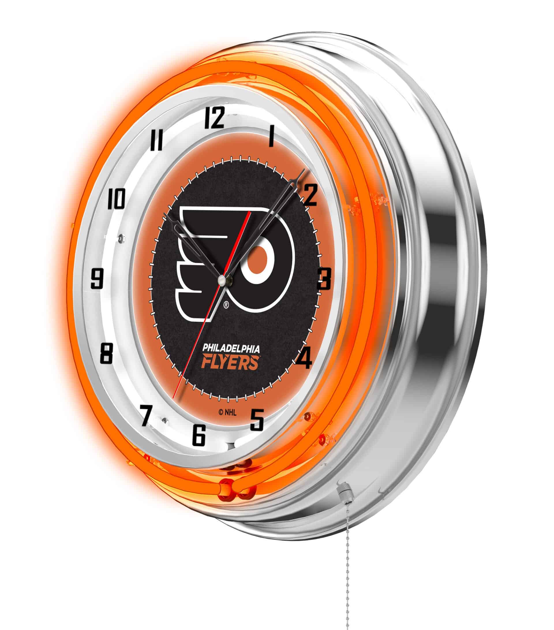The Philadelphia Flyers 19-Inch Neon Logo Clock in Chrome is the ultimate addition to any sports fan’s man cave. This eye-catching clock features a stunning chrome casing and vibrant team colors, making it a stylish and functional piece of decor. The clock boasts a custom printed face illuminated by a brilliant white neon ring, providing a striking visual effect. With easy operation via a pull chain, you can effortlessly switch the neon lights on and off. The clock’s accurate quartz movement ensures you’ll always be on time, powered by a single AA battery (not included).