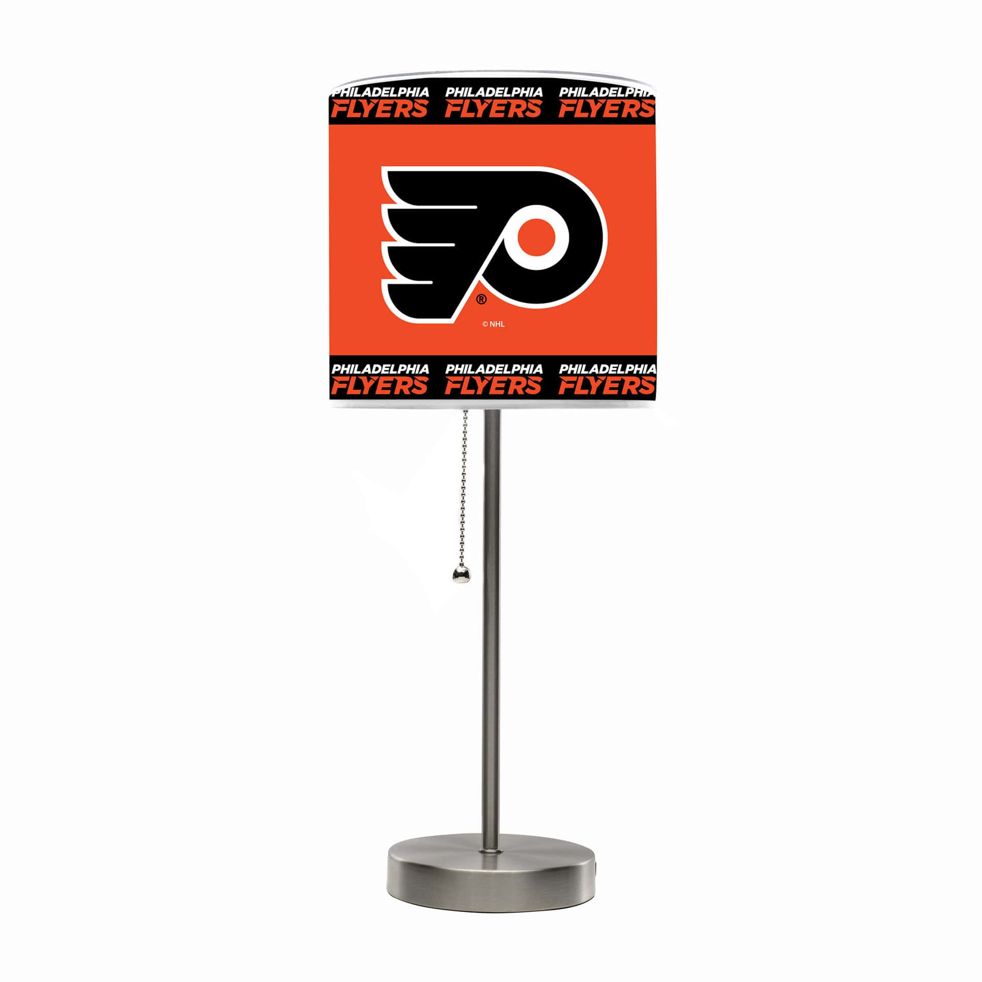 Light up your fan cave with the Philadelphia Flyers Chrome Lamp. This stylish lamp features a sleek chrome finish and a vibrant team-themed lampshade insert. The USB charging station keeps your devices powered up. The lamp uses a unique patented lampshade program to change your room decor fast and affordably. The high resolution lampshade insert is officially licensed by the NHL. Easily update the look of your space by purchasing new, stand-alone inserts. The lamp’s dimensions are 8 x 8 x 19 inches. The product weight is 3 lbs. The material is metal and plastic.