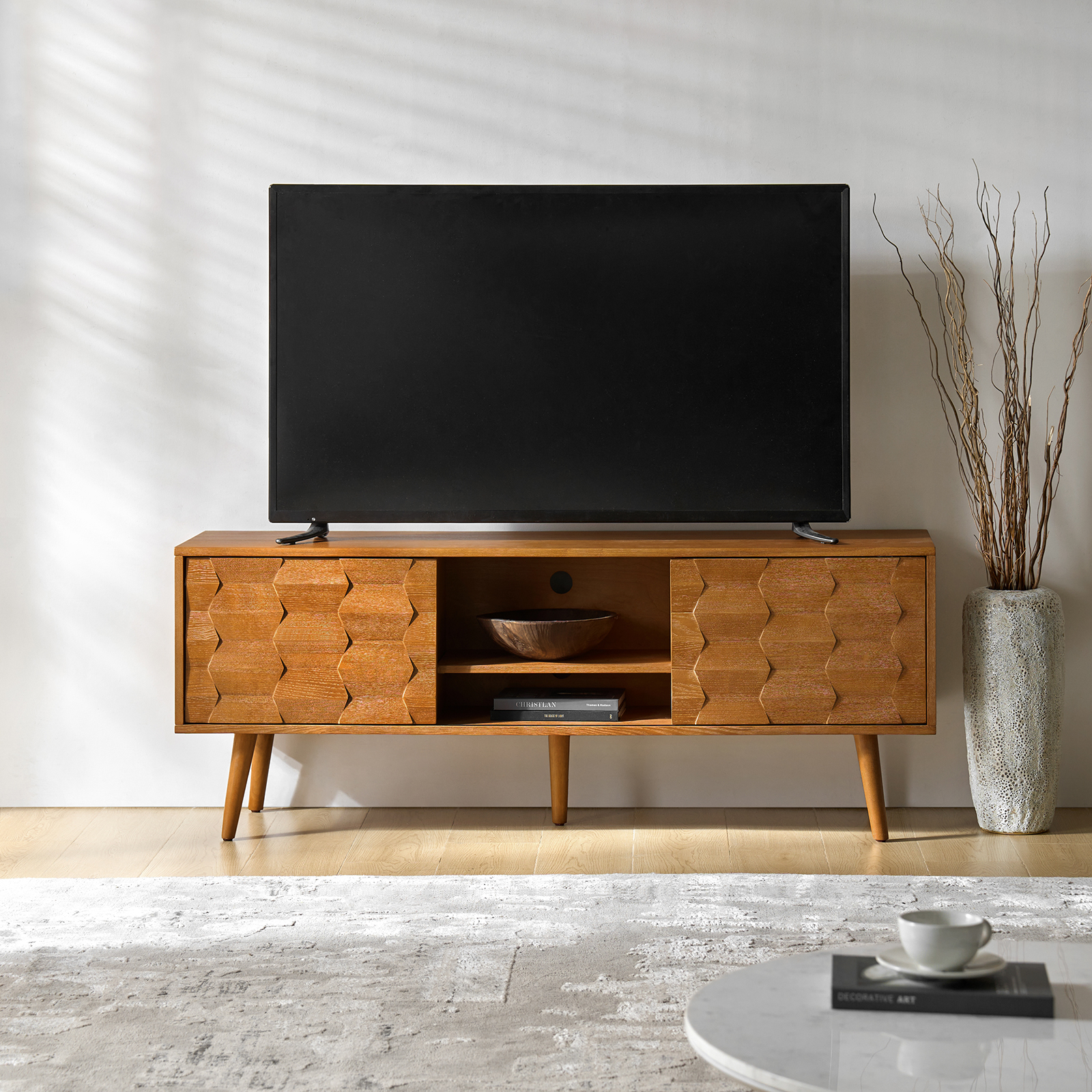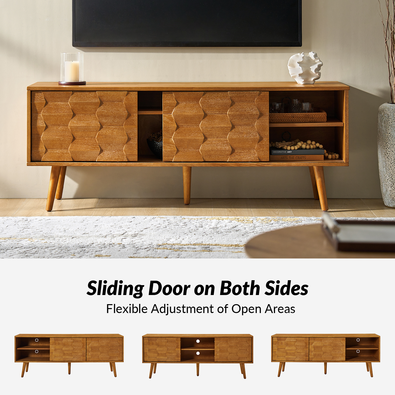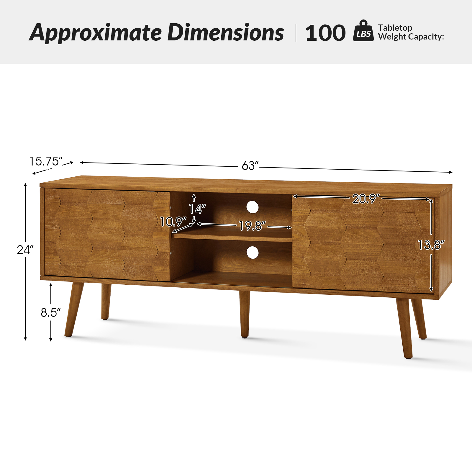 This mid-century modern TV stand brings style and function to your living room. The geometric door adds a unique, artistic touch. The adjustable shelf inside lets you customize your storage space. Keep your cords neat with the built-in cable management system that includes a rear cord wrap and cable holes. A four-outlet power strip is included for easy setup. The single sliding door provides flexible access from either side. It is supported by flared legs with adjustable feet to keep it steady. Dimensions (WxDxH): 63 x 15.75 x 24. Product Weight (lbs): 82.47. Material: Manufactured Wood,Solid Wood. Color: ACORN. Assembly Required: Yes.