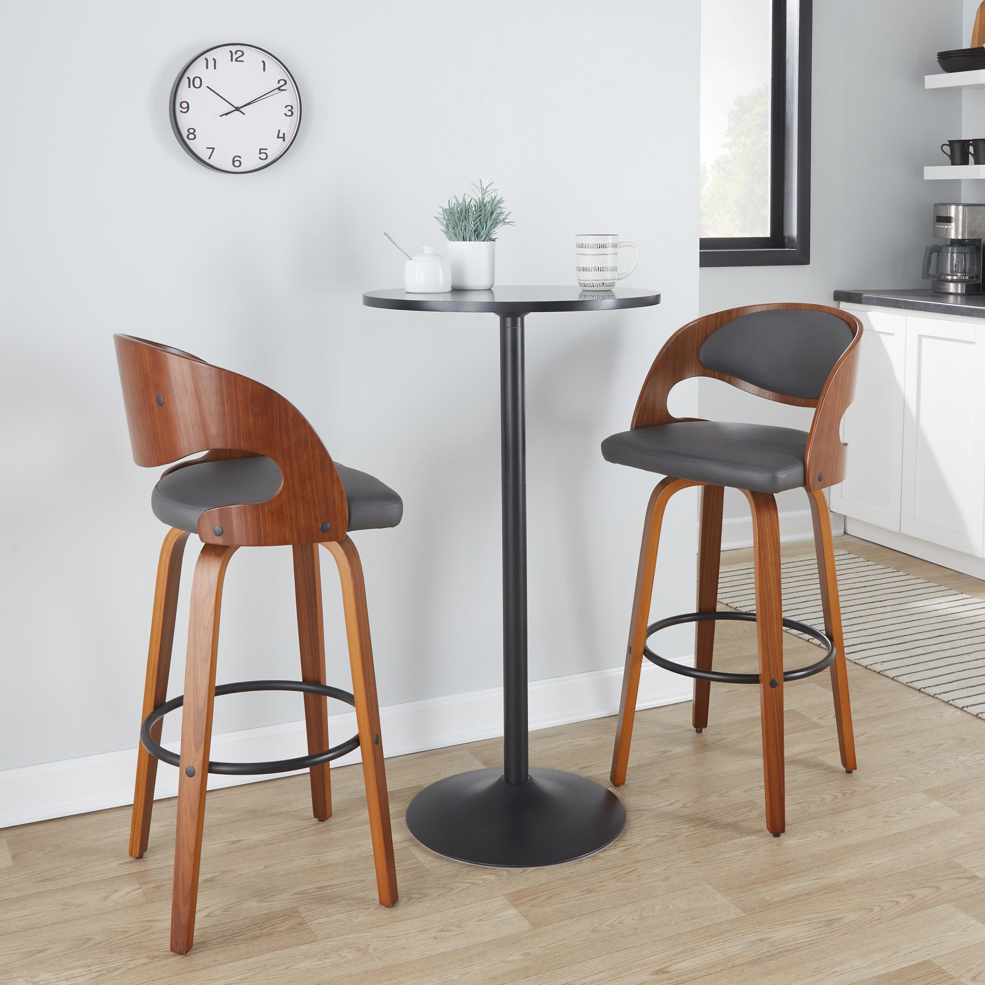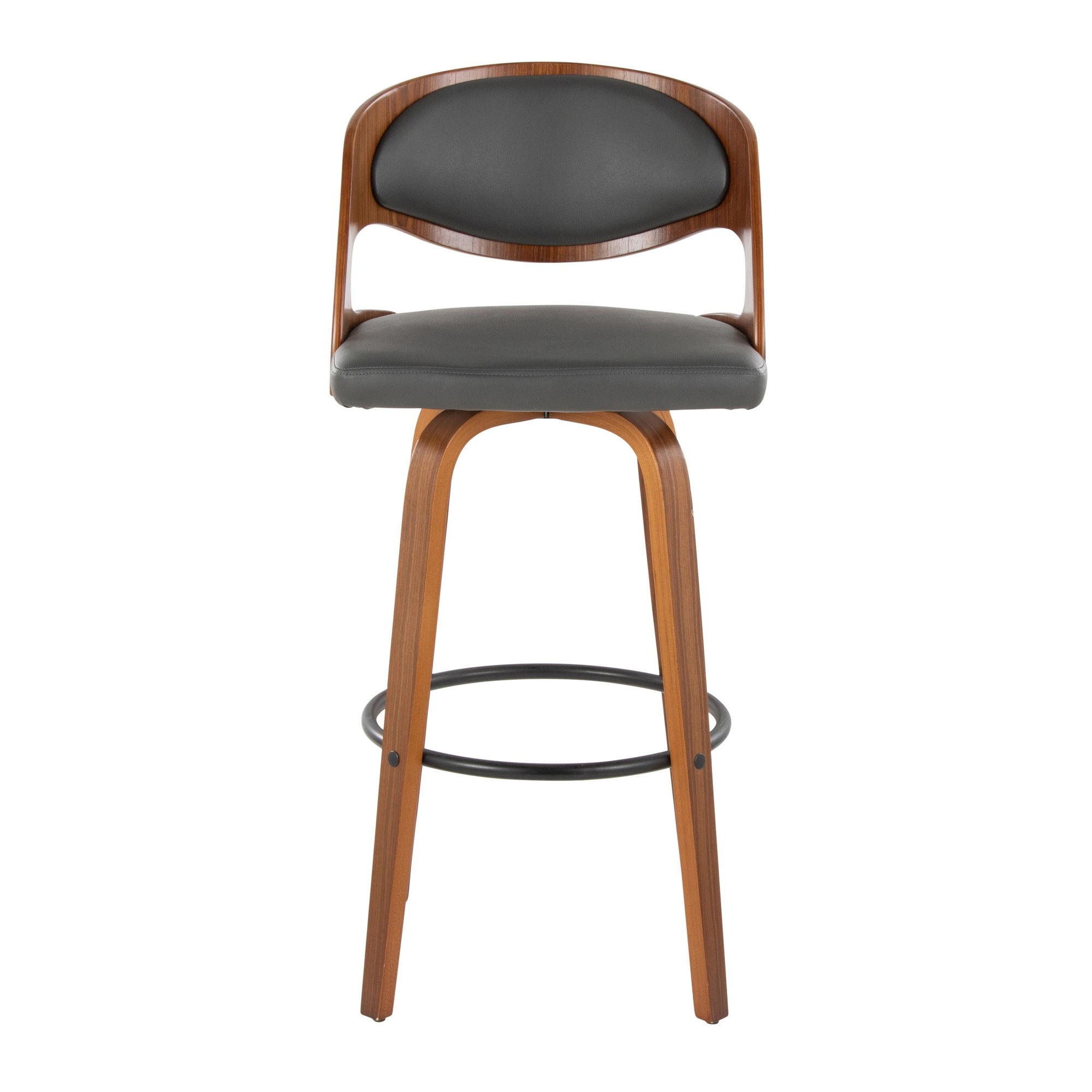 Elevate your man cave with the Pino 30 Mid-Century Modern Walnut and Grey Barstool. These stools come in pairs and feature a stylish mid-century modern design. Enjoy the 360-degree swivel and comfortable faux leather upholstered seat with an open back rest. The bentwood legs in a rich walnut finish and built-in footrest add both style and comfort. This fixed bar height stool is perfect for your bar or kitchen area. Dimensions: 22″L × 22″W × 40.5″H. Weight limit: 250 lbs. (each). Materials: PU Leather, Foam, Metal, Bent Wood. Some assembly required.