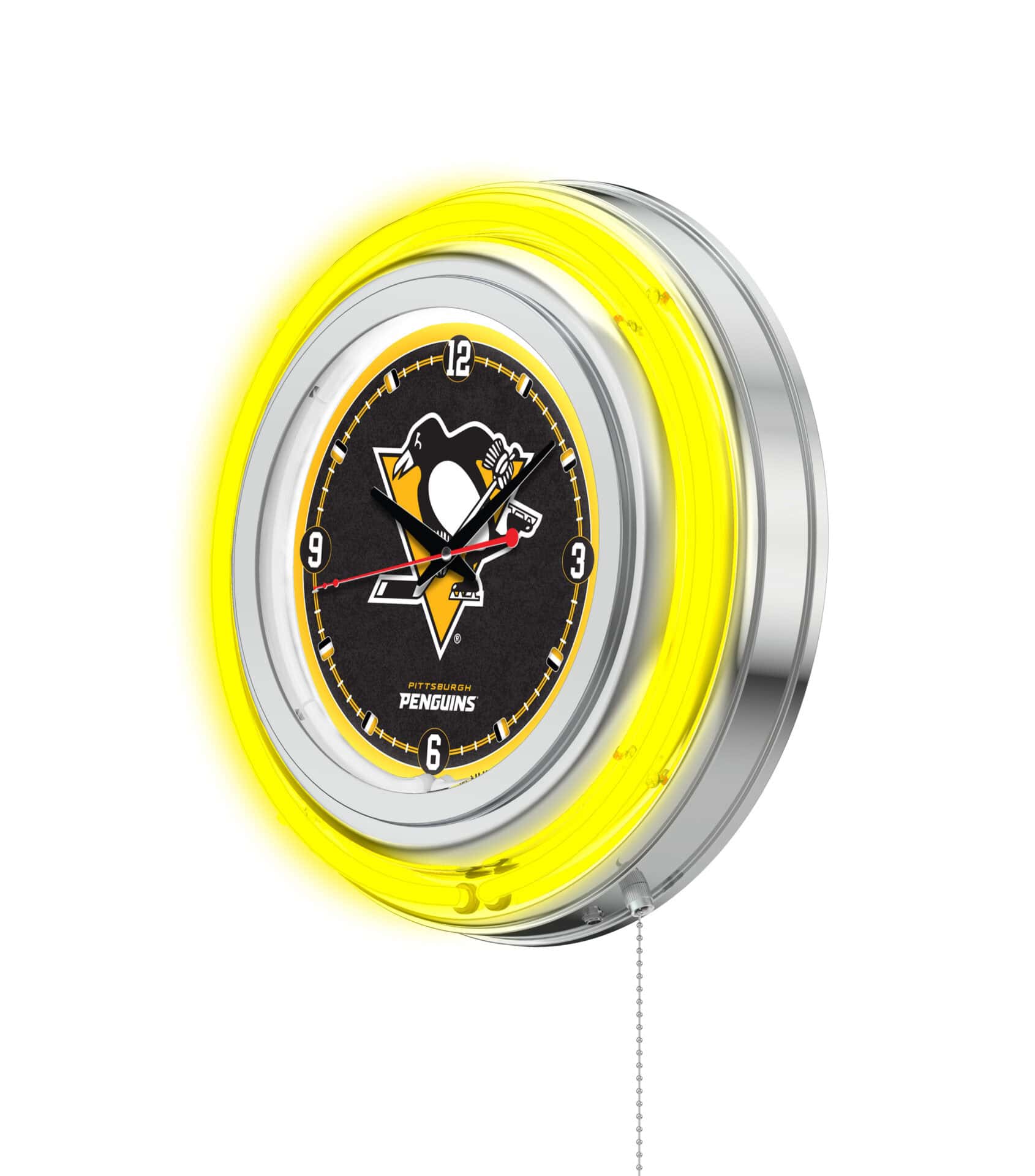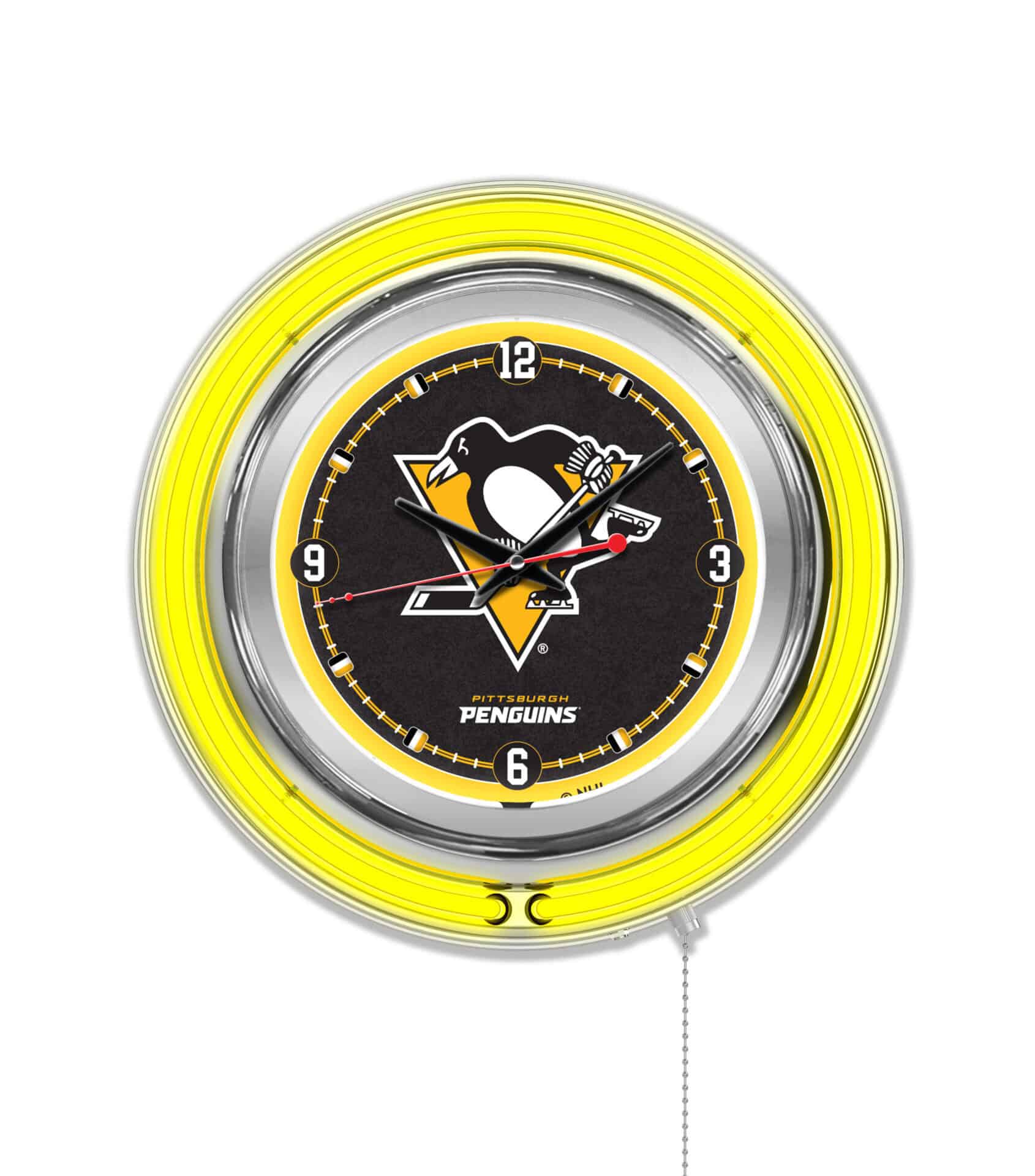The Pittsburgh Penguins 15-Inch Neon Logo Clock in Chrome is the ultimate addition to any fan’s man cave. This stunning clock showcases your team pride with its vibrant neon accents and sleek chrome casing. The custom-printed clock face is illuminated by a brilliant white inner neon ring, making it a standout piece. The neon rings can be easily controlled with a pull chain, providing convenience and style. Powered by a UL Listed transformer, this clock combines functionality with a bold design that is sure to impress.