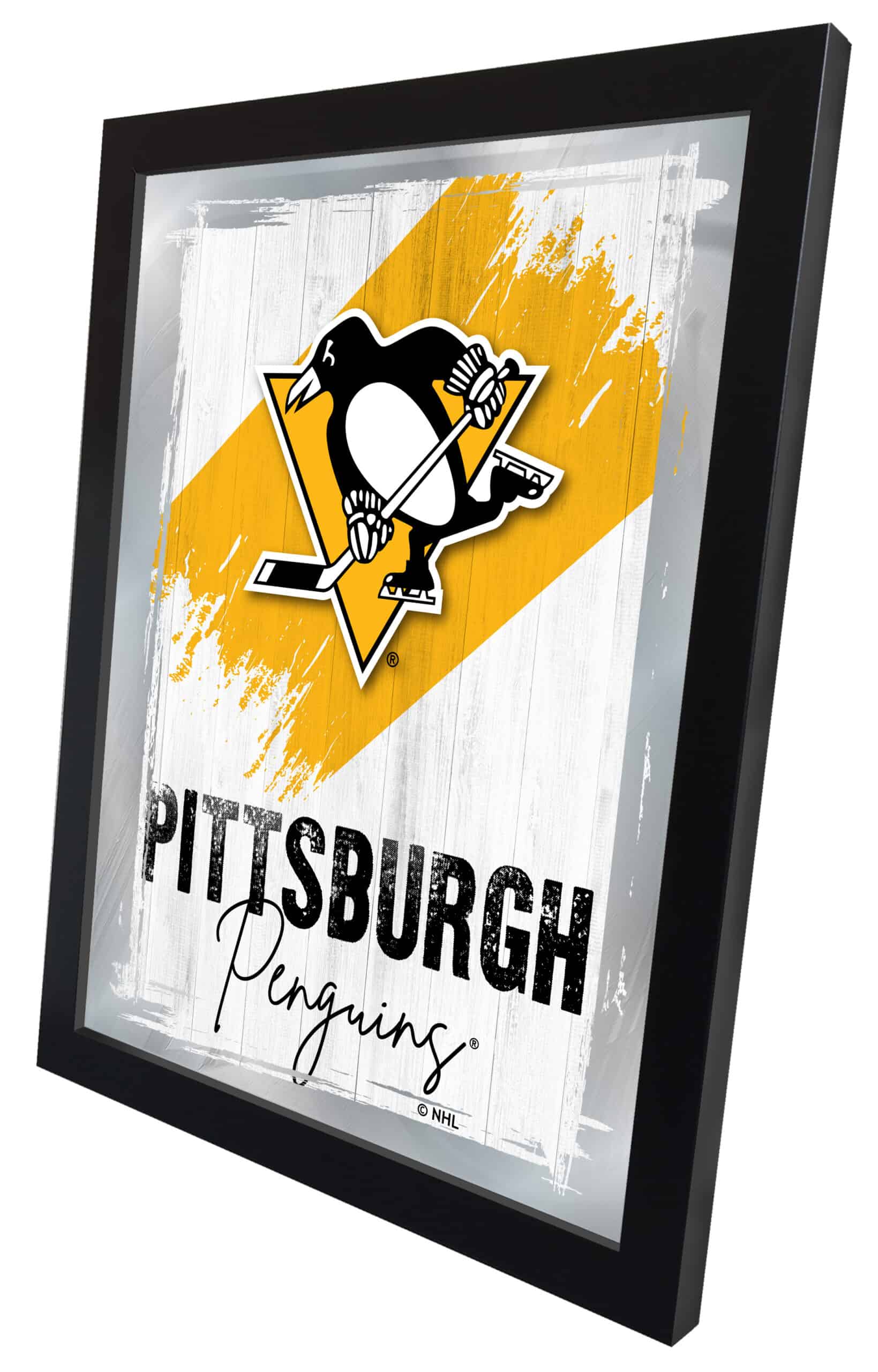 Show your team pride with this Official Licensed NHL Logo Mirror. With its simple yet elegant design, vibrant colors burst through the 1/8″ thick glass and are beautifully highlighted by mirrored accents. Framed with a sleek black, 1 1/4″ wrapped wood frame and equipped with saw tooth hangers, this 17″(W) x 22″(H) mirror is perfect for your office, garage, or any room in your home. Whether you’re purchasing it as a gift for a superfan or for yourself, you can take satisfaction in knowing you’re choosing a quality product.