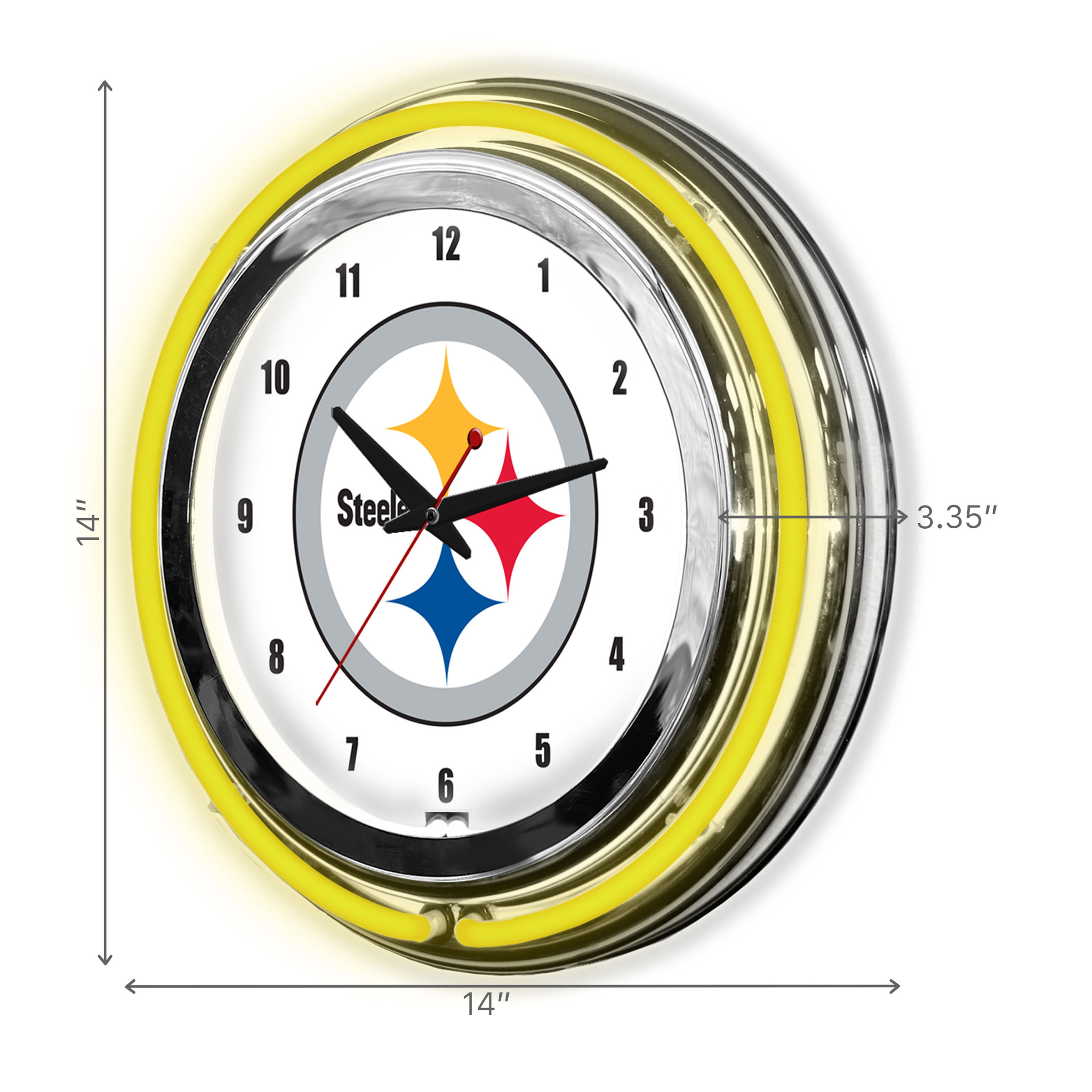 Light up your fan room with this 14-inch Neon Clock! The polished chrome finish adds a sleek touch to your space. The two colors of neon make the team logo pop, brightening up the face and the room. It’s the perfect gift for any fan! This clock is officially licensed and made in the USA. Use the pull chain to turn it on and off. The 120v AC adapter plugs right into the wall. Requires one “AA” battery (not included). Dimensions: 14 x 14 x 3.25 inches. Weight: 5 lbs. Material: Metal and Neon Tubing.