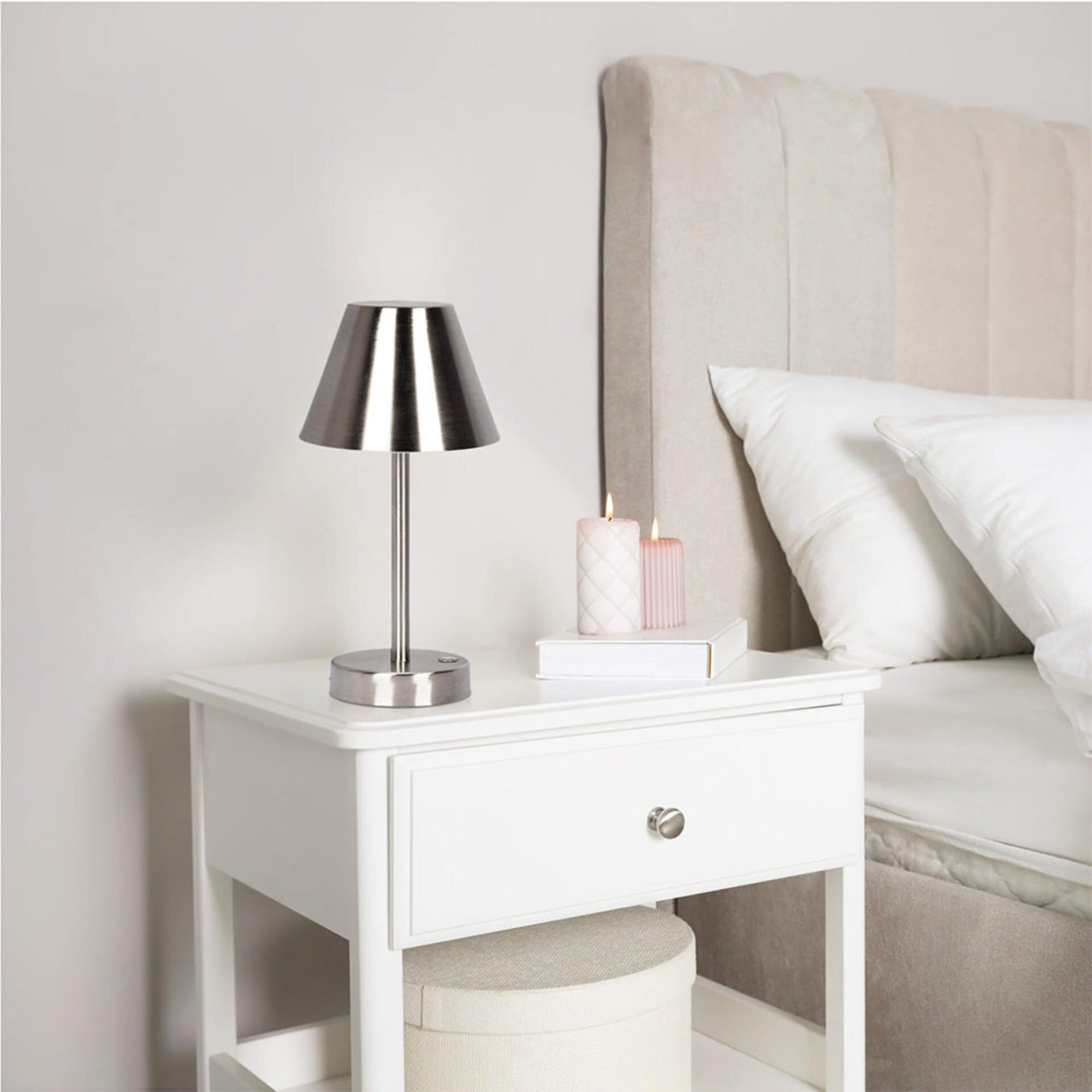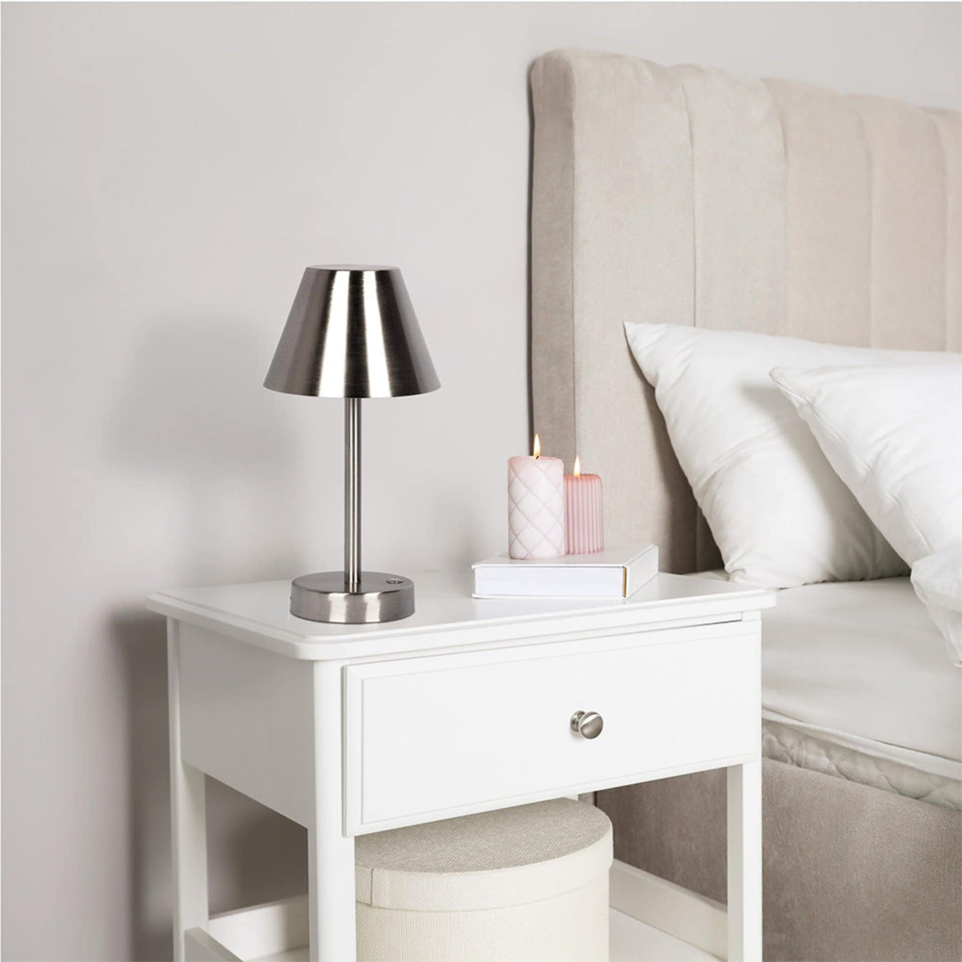 Elevate your lighting experience with the stylish and functional Plated Brass Brushed Nickel Rechargeable LED Touch Table Lamp. This lamp brings a touch of modern sophistication to any space with its sleek brushed nickel finish and innovative touch switch technology. Say goodbye to tangled cords and enjoy the convenience of rechargeable, cable-free lighting. Perfect for creating the ideal ambiance in your man cave or other favorite spaces, this lamp offers versatile lighting control in a compact, elegant design.