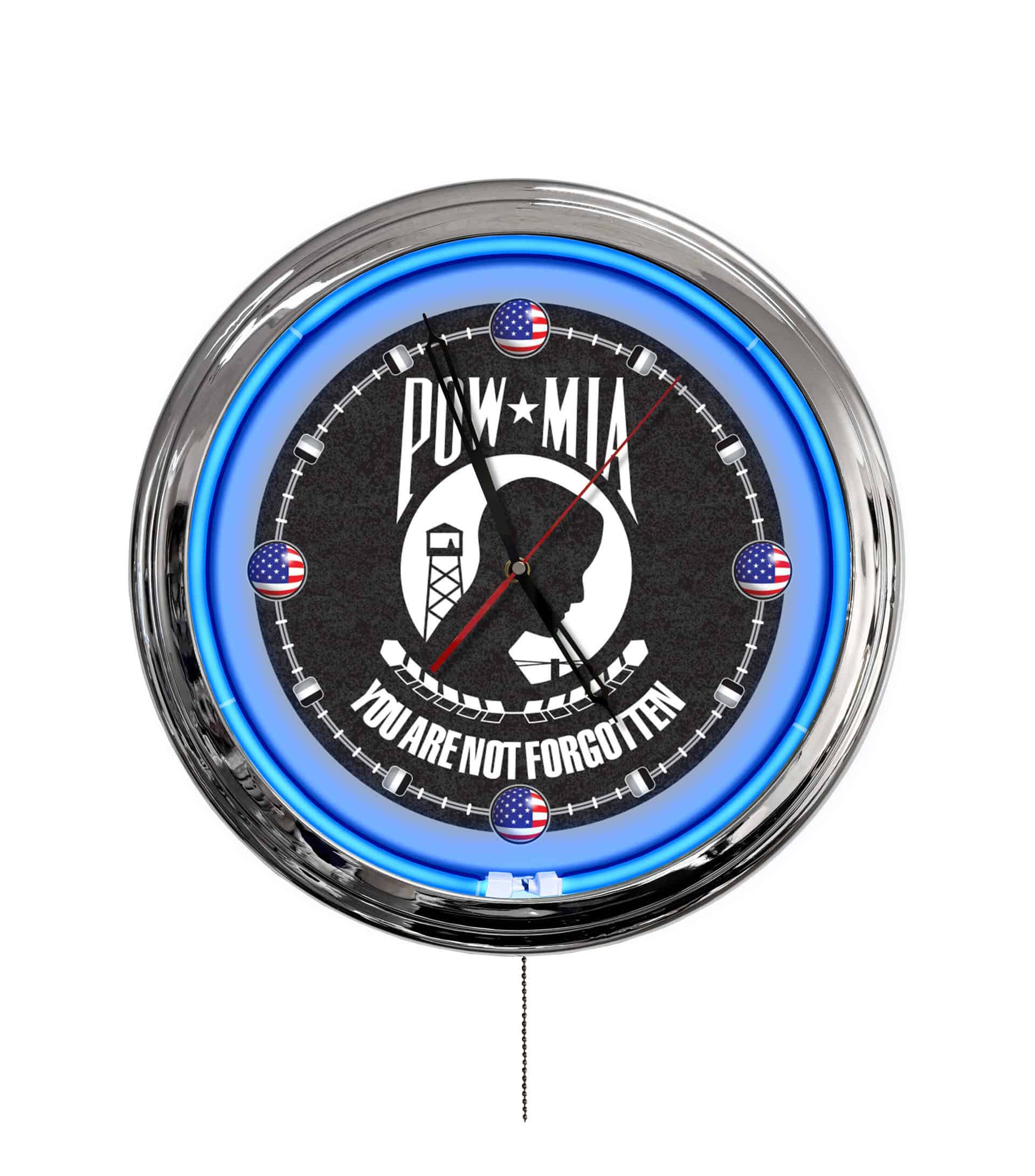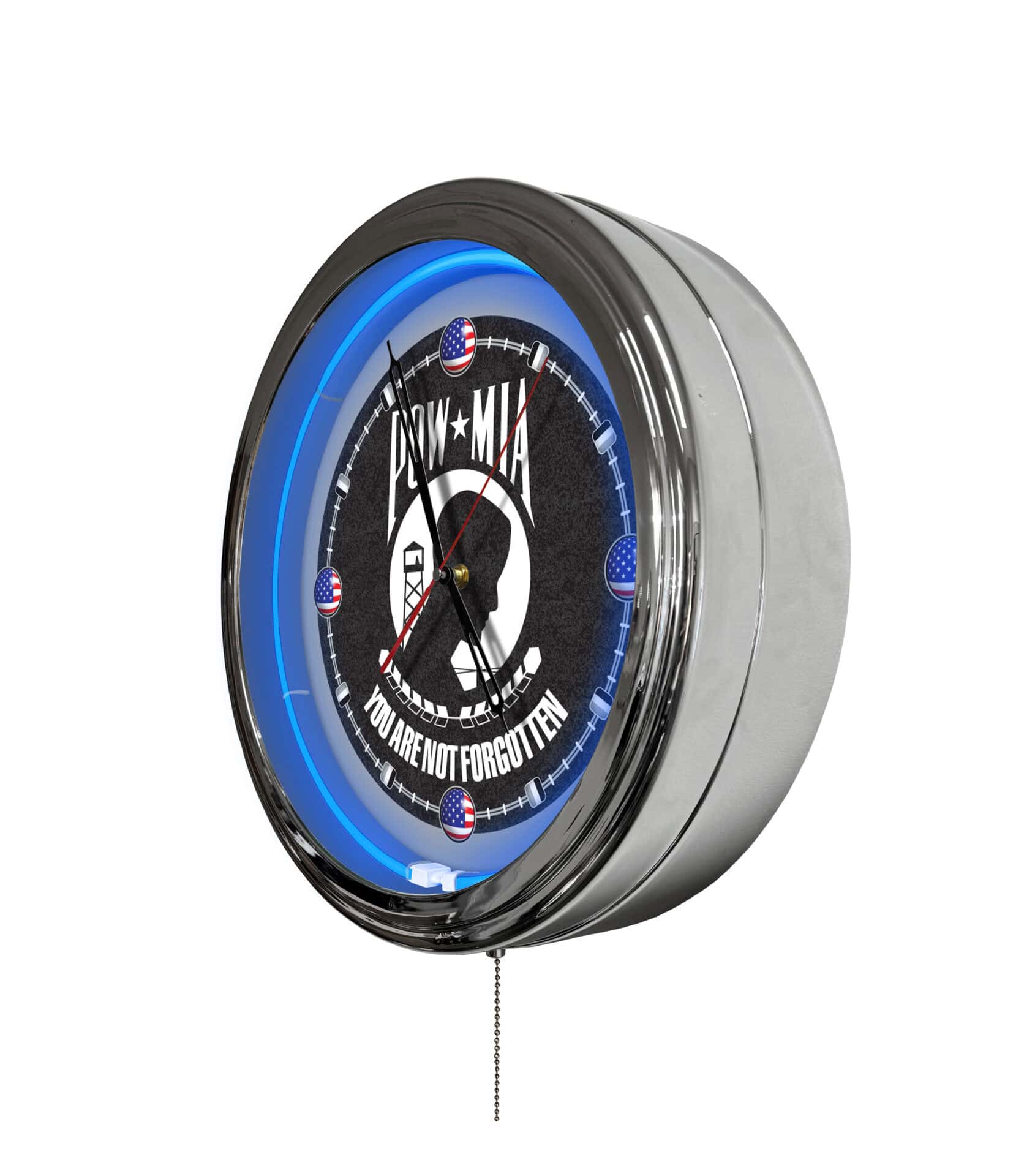 The POW/MIA 16-Inch LED Wall Clock in Chrome is a modern and stylish timepiece that adds a vibrant touch to any man cave or game room. This clock features a variety of eye-catching colors, allowing you to customize the ambiance of your space effortlessly. With its sleek chrome casing and illuminated logos, it enhances your decor while providing accurate timekeeping.