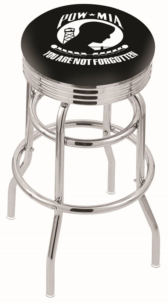 Show your support with the striking POW/MIA 30-Inch Swivel Backless Bar Stool. Designed for durability and style, this stool features a clean, retro-inspired look with a 2.75-inch chrome ribbed accent ring that conceals the swivel mechanism. Its commercial-grade steel frame is triple chrome-plated for a long-lasting, rich finish, while the cushion seat provides exceptional comfort and support, thanks to its high-density foam core and breathable, marine-grade vinyl. Perfect for your bar, game room, or man cave, this stool combines functionality, style, and a tribute to our heroes.
