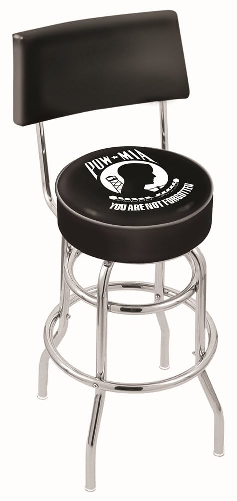 Show your support for our troops with the stylish and durable POW/MIA 30-Inch Swivel Bar Stool. Designed for comfort and built to last, this bar stool features a retro design with a cushioned back, a 5-inch thick seat cushion, and a sturdy double-ring chrome base. The high-resolution logo is applied using a state-of-the-art UV vinyl ink process, ensuring a sharp and clear image that won’t fade over time. Crafted with commercial-grade materials, this stool is perfect for completing your bar, game room, or man cave in style.