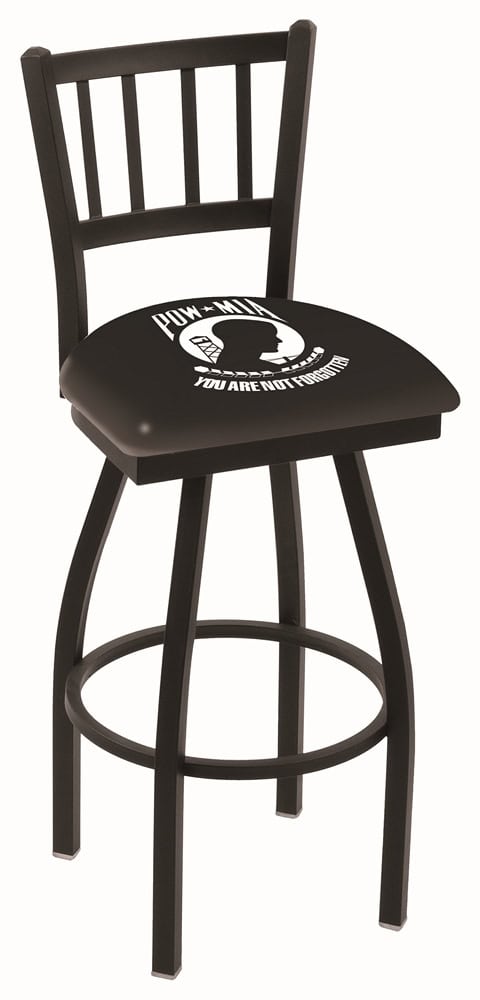 Show your support for our troops with this stylish and durable bar stool featuring a distinctive Jailhouse back design. The “POW/MIA 36-Inch Swivel Extra Tall Bar Stool w/ Black Wrinkle Finish, Jailhouse Back, 2.5-Inch Cushion Seat” combines comfort, functionality, and unmatched craftsmanship. A state-of-the-art printing process ensures a sharp, crisp, and clear logo image, applied with specially formulated UV vinyl ink for long-lasting quality. The heavy-duty steel frame, powder-coated for durability, guarantees strength and a sleek, modern look. The high-density foam cushion, covered in commercial-grade vinyl, ensures maximum support and comfort that lasts for years. This stool is designed to enhance any bar, game room, or man cave with sophistication and utility.