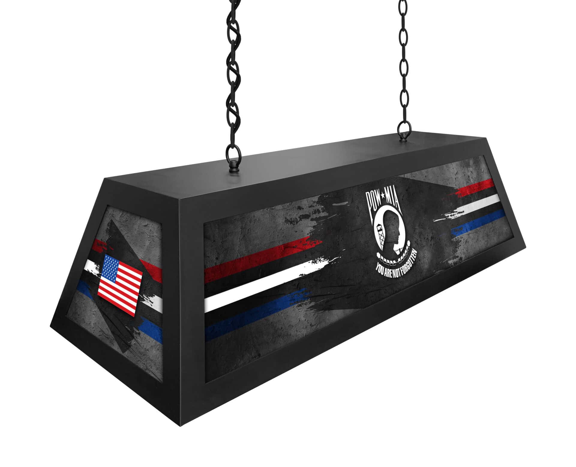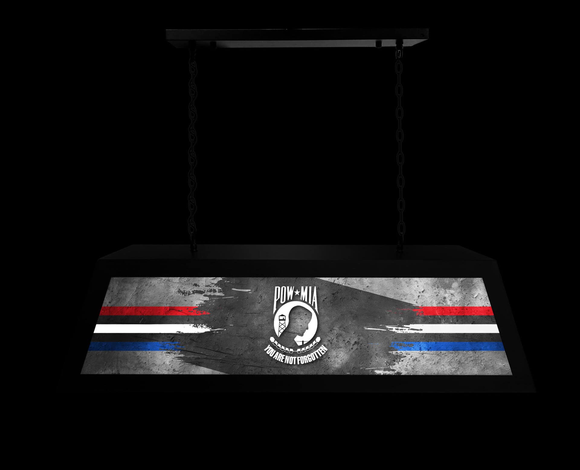 Add a touch of distinction to your game room, bar, or billiard area with the POW/MIA Long Box Billiard Light. This impressive suspended light fixture combines a robust metal frame with vibrant, digitally printed graphics. Enjoy a bright, evenly lit space perfect for games and gatherings. It’s more than just a light; it’s a statement.