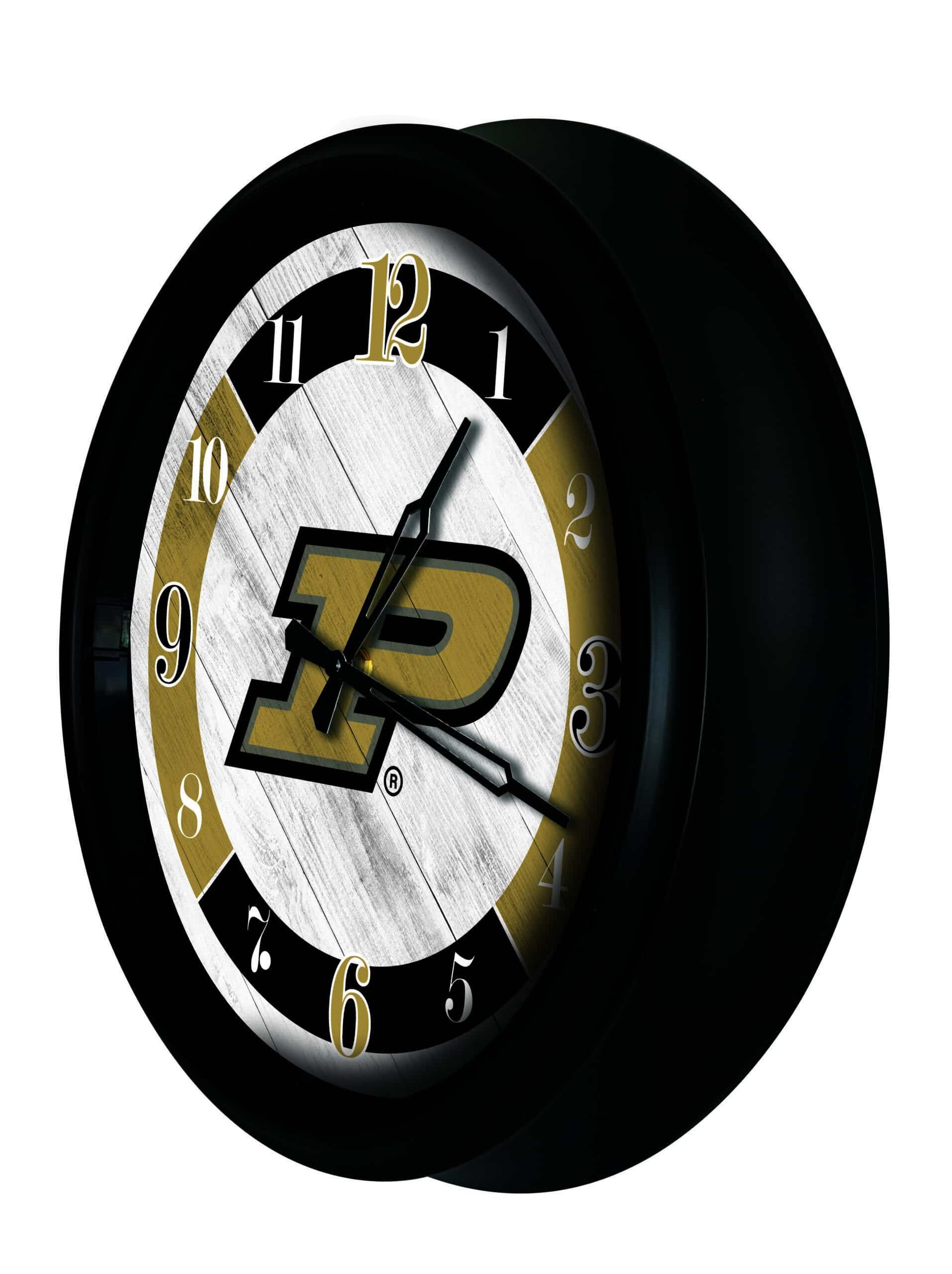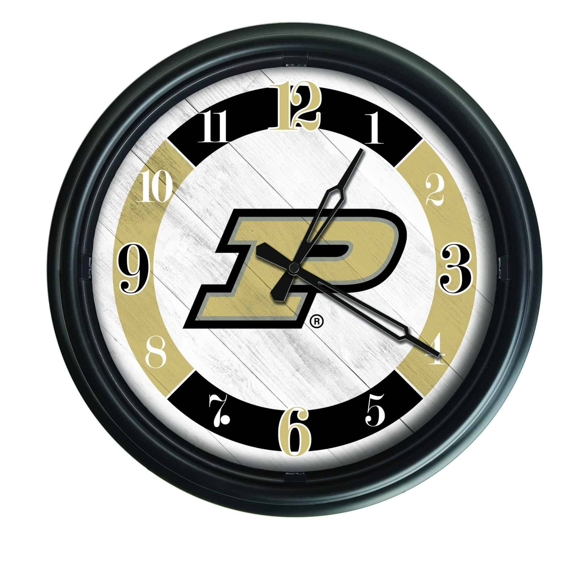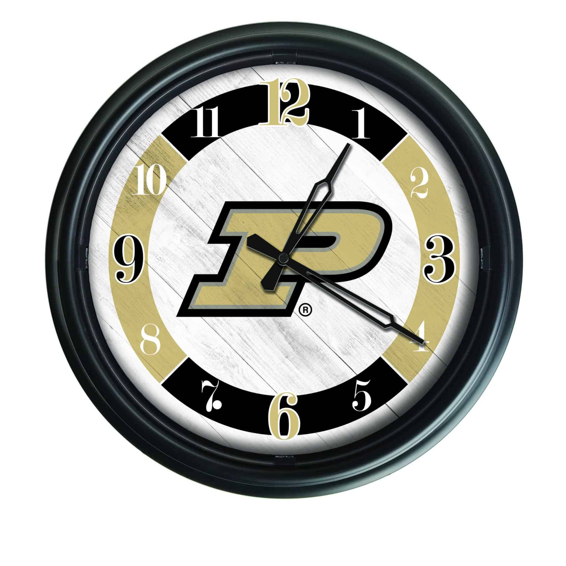 The Purdue 14-Inch Indoor/Outdoor LED Wall Clock in Black is the perfect addition to any space, showcasing your pride with its vibrant, full-color UV printed artwork. This clock is designed for both indoor and outdoor use, featuring a fully weather-resistant construction that ensures durability against the elements. The innovative photo eye technology automatically activates the LED lights at dusk, illuminating the clock face for easy visibility at night. With accurate quartz movement powered by a single AA battery, you can trust that this clock will keep precise time. Ideal as a gift for sports fans, graduates, or for personal use, this clock combines functionality with style.