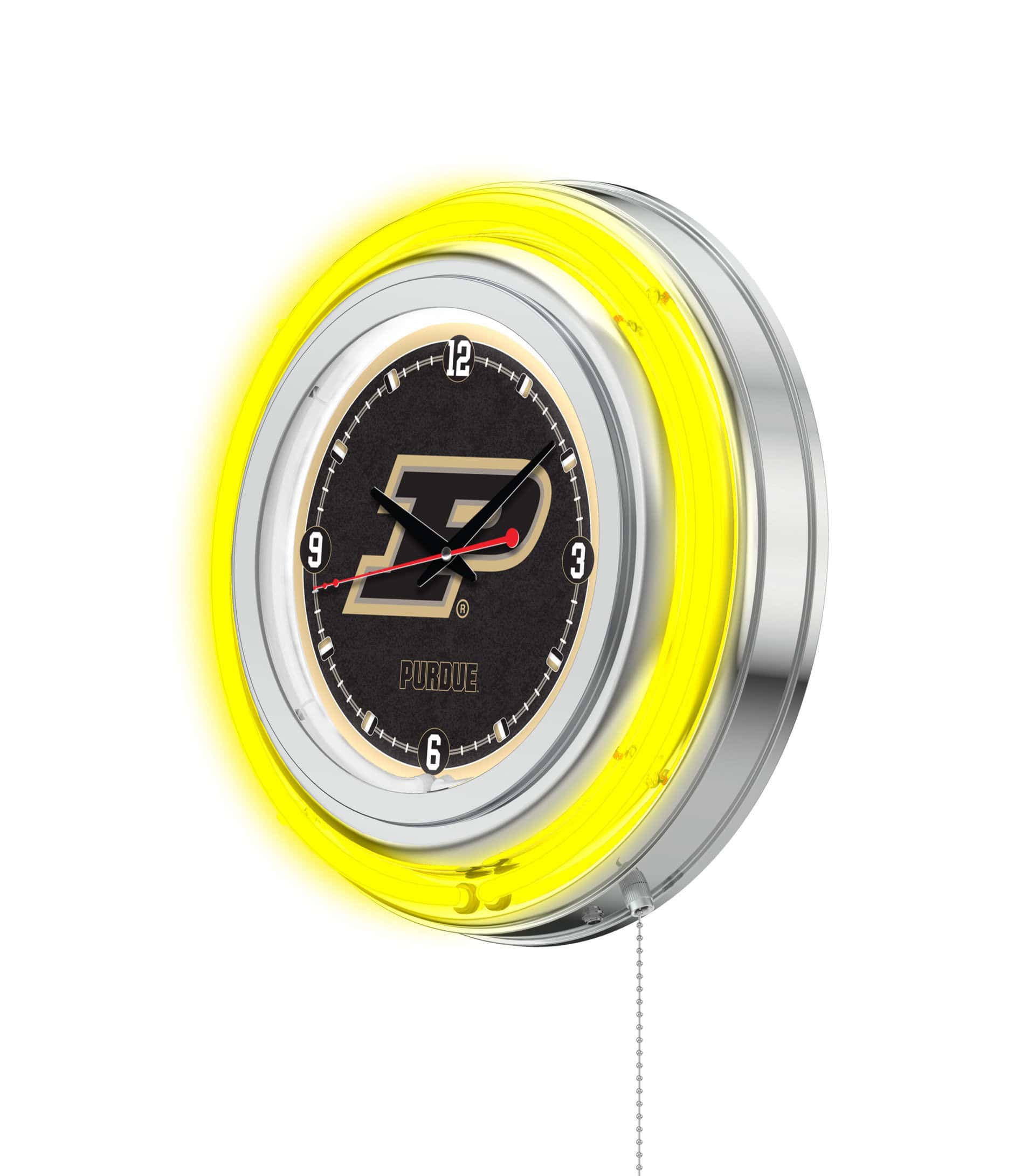 The “Purdue 15-Inch Neon Logo Clock in Chrome is the ultimate timepiece for any fan looking to showcase their school spirit. This clock features a stylish chrome casing complemented by a vibrant team color-specific neon outer ring, ensuring that it stands out in any room. The brilliant white inner neon ring illuminates the custom printed clock face, making it a striking addition to your man cave or game room. With a convenient pull chain for easy on/off operation, this clock is powered by a UL Listed transformer and requires a standard 120V outlet, while the accurate quartz movement ensures you’ll always be on time. Perfect as a gift for graduates or sports enthusiasts, this clock combines function with flair.